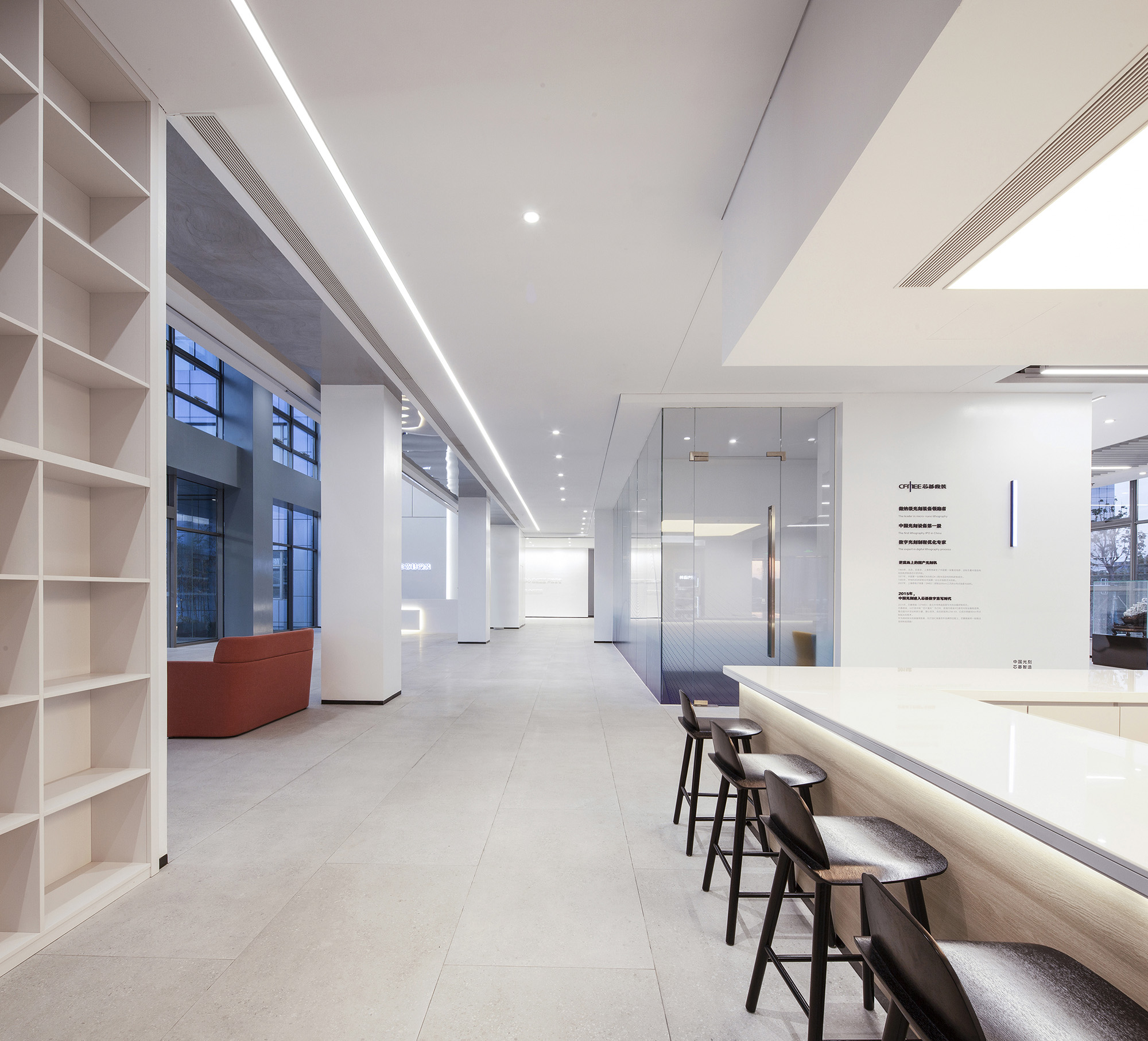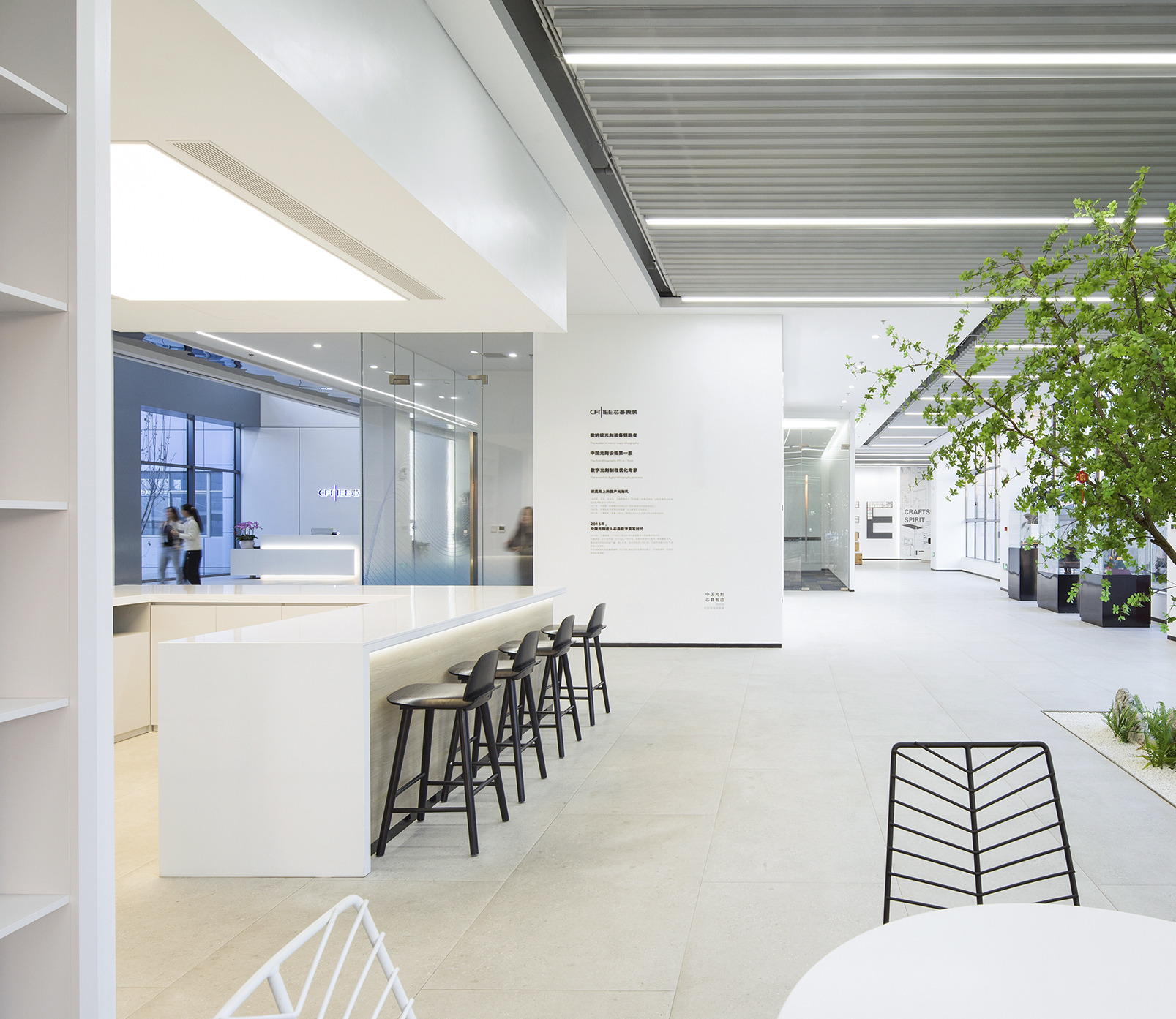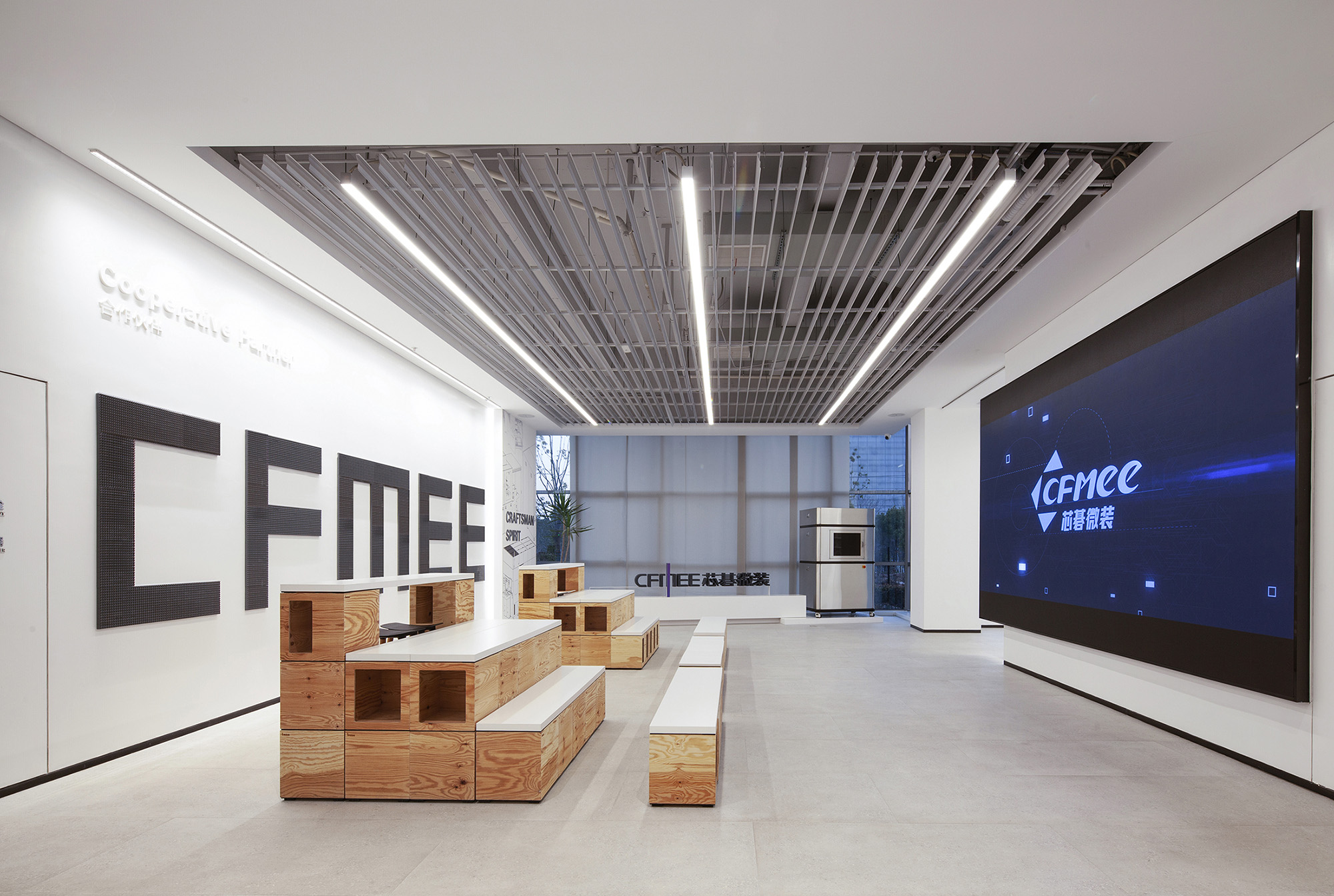 朝向外窗的台阶式分段墙体上,依次布置企业介绍(芯碁)、发展历程、技术专利及分享区等展示模块。开放式的空间布局,让客户接待与参访体验更显灵活友好。
