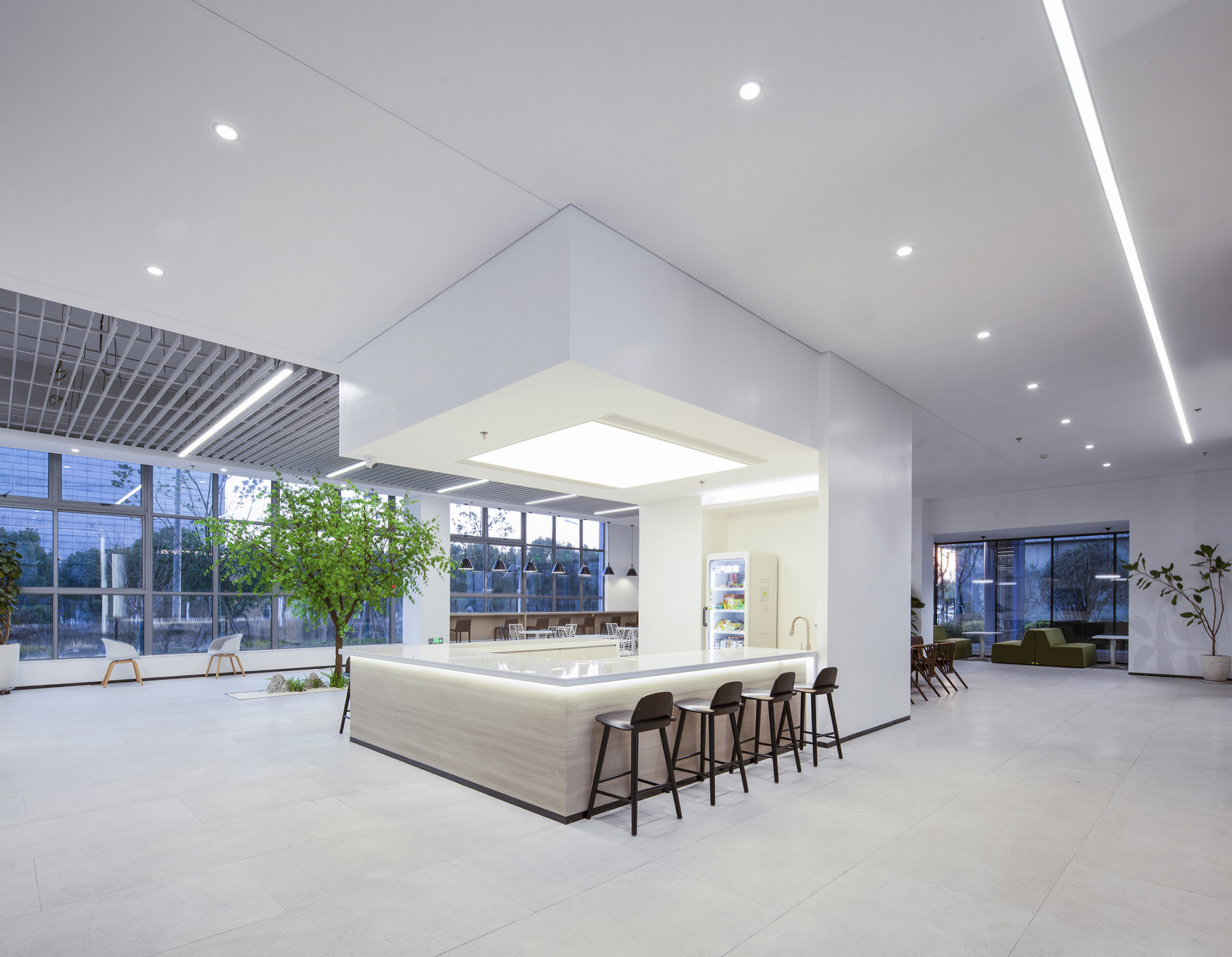休闲咖啡区与接待大堂自然衔接、功能互补,使穿行其间的动线自然消弭分区界限。不同功能区的空间记忆在此相互叠加,从而深化用户的沉浸体验。
