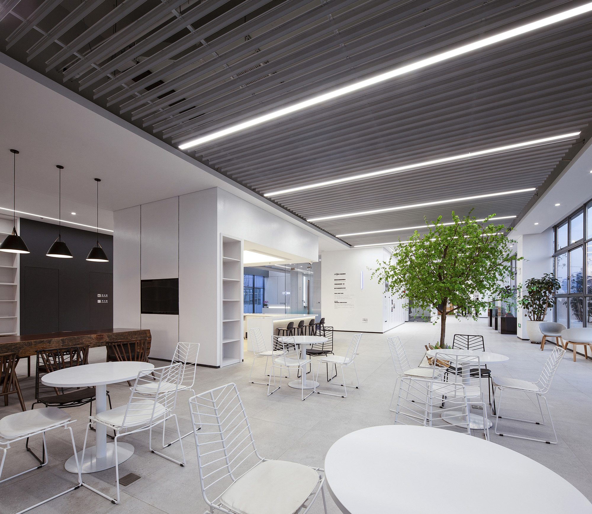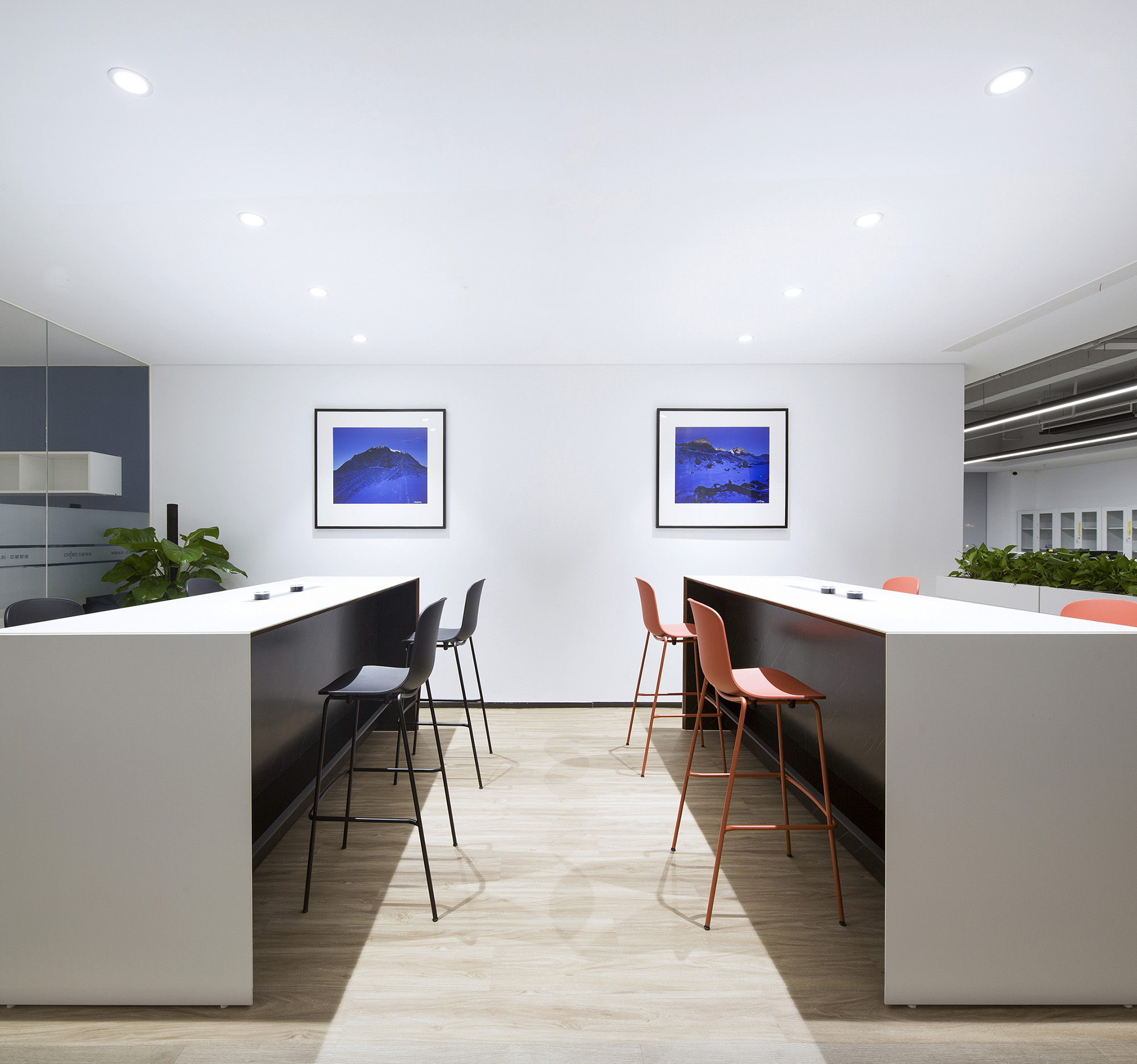 标准办公楼层中,设置了多处可切换使用场景的共享空间,兼具灵动办公与休闲分享功能。空间处理以硬朗洗练为基调,营造出富有速率感与光感的空间氛围,与芯碁的事业特质形成完美呼应。