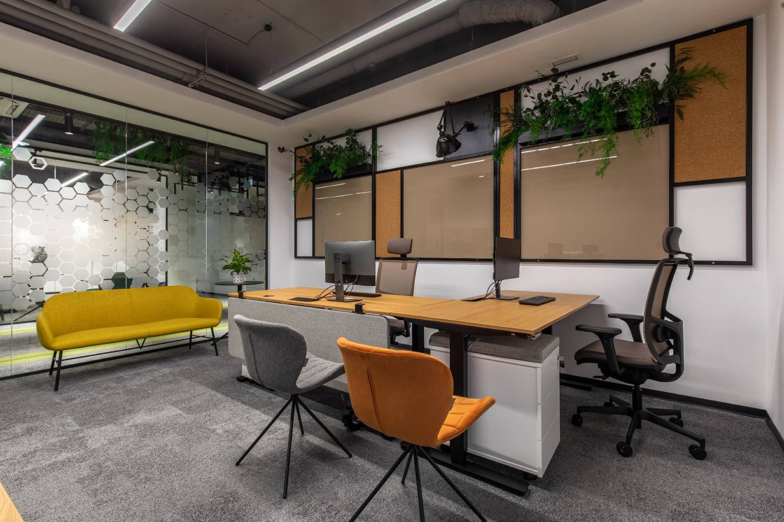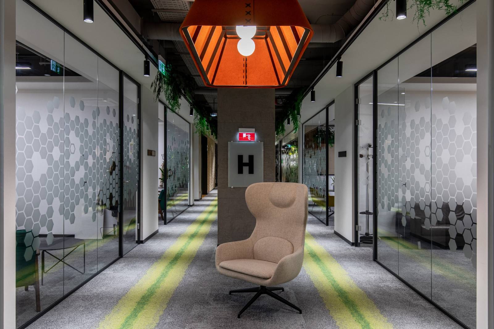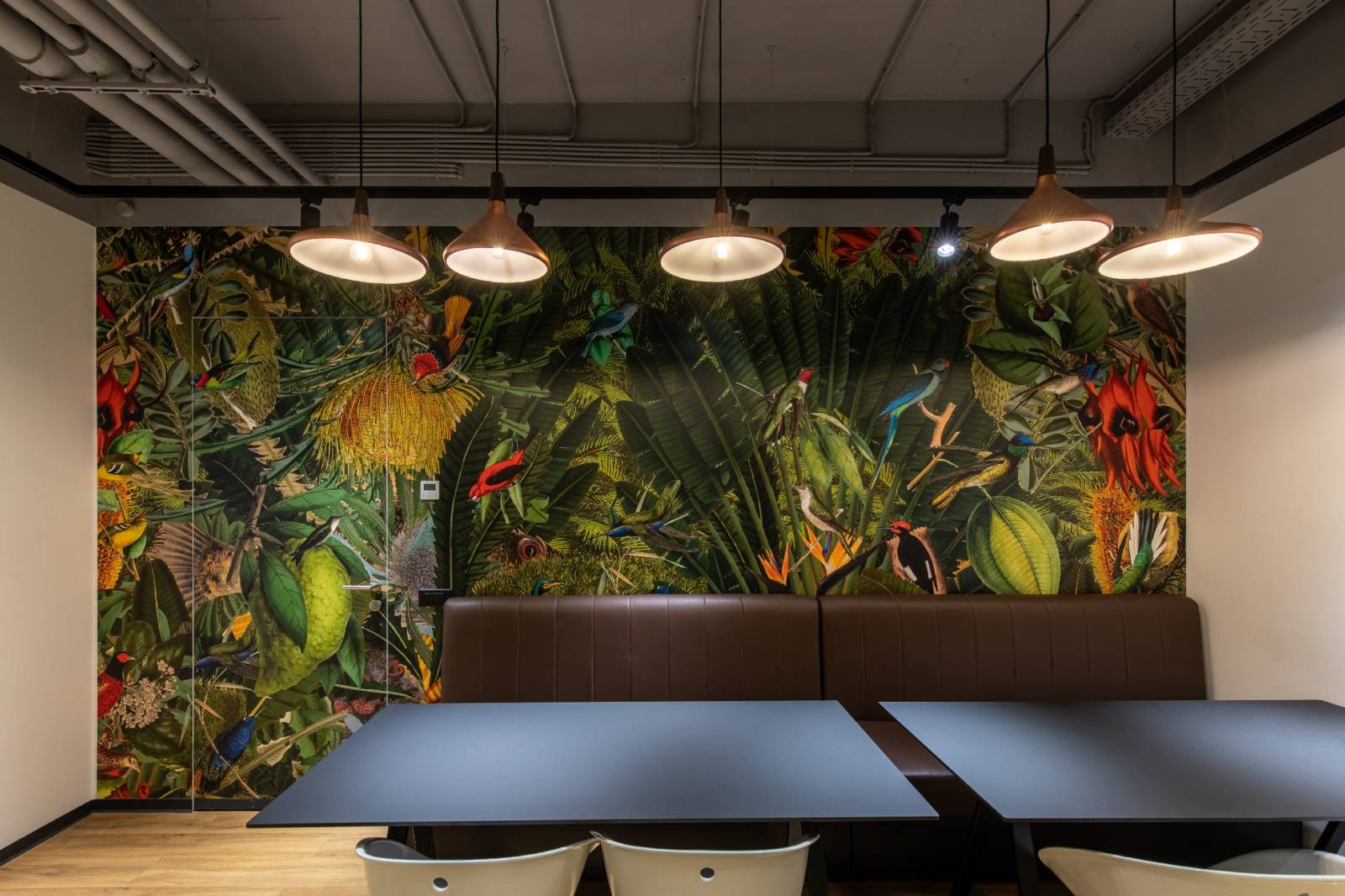 温暖的肌理、金色的点缀和木饰面勾勒出办公室的视觉基调,与冷峻的裸露混凝土表面、灰色调以及局部的黑色金属细节形成鲜明对比。色彩缤纷的装饰元素点缀在特定区域,为整个空间增添了视觉趣味和灵动感。