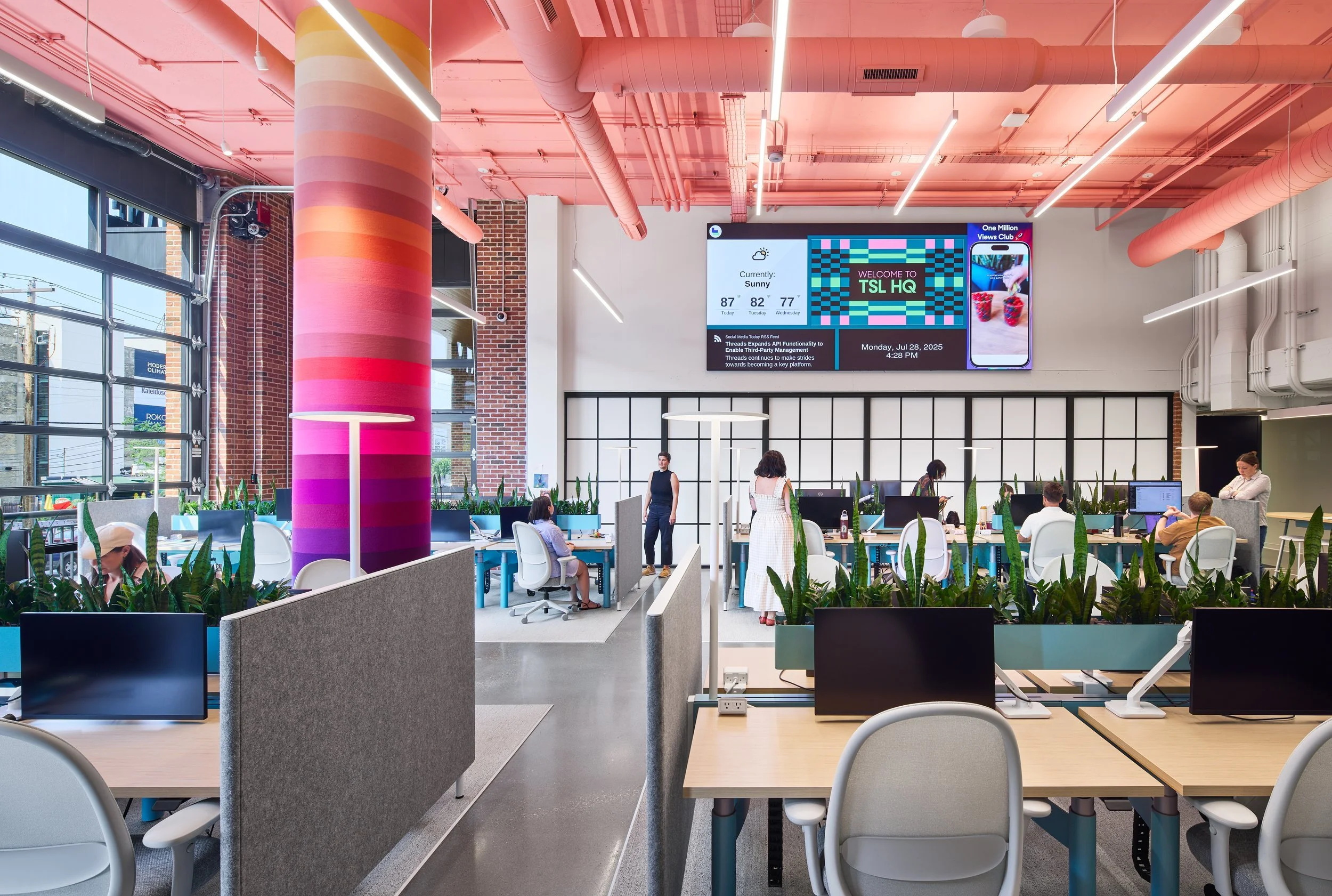 当一座办公空间里横亘着数根粗大的混凝土立柱,层高还高低不一,通常会被视为建筑“硬伤”。但在社交媒体机构The Social Lights的新总部中,这些“碍”却成了“爱”。设计团队携手艺术家HOTTEA,将立柱转化为发光的品牌符号,并依据不同层高精准布局——低矮处留给专注工作,高敞处激活社交。一场从结构阻碍到视觉焦点的精彩反转,就此上演。