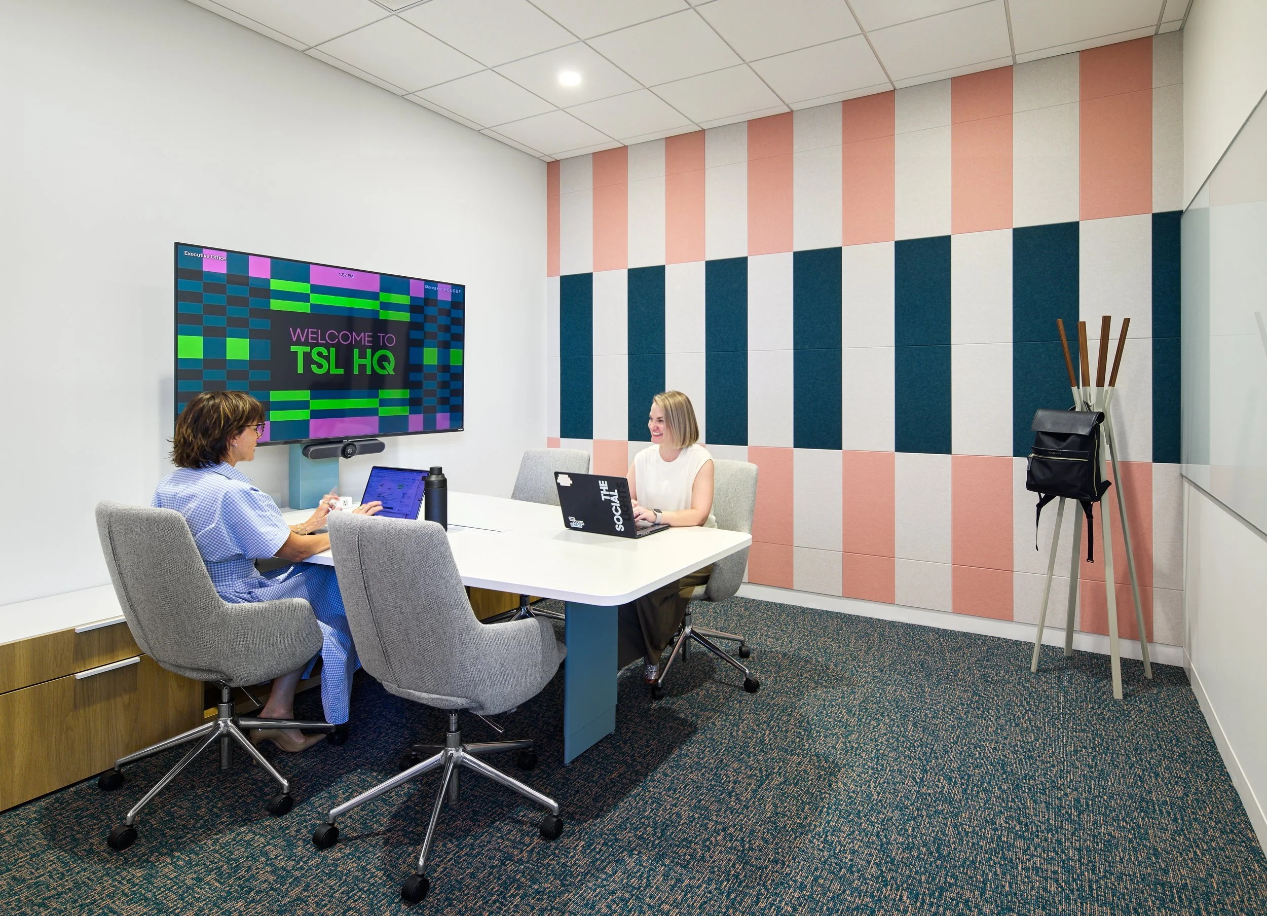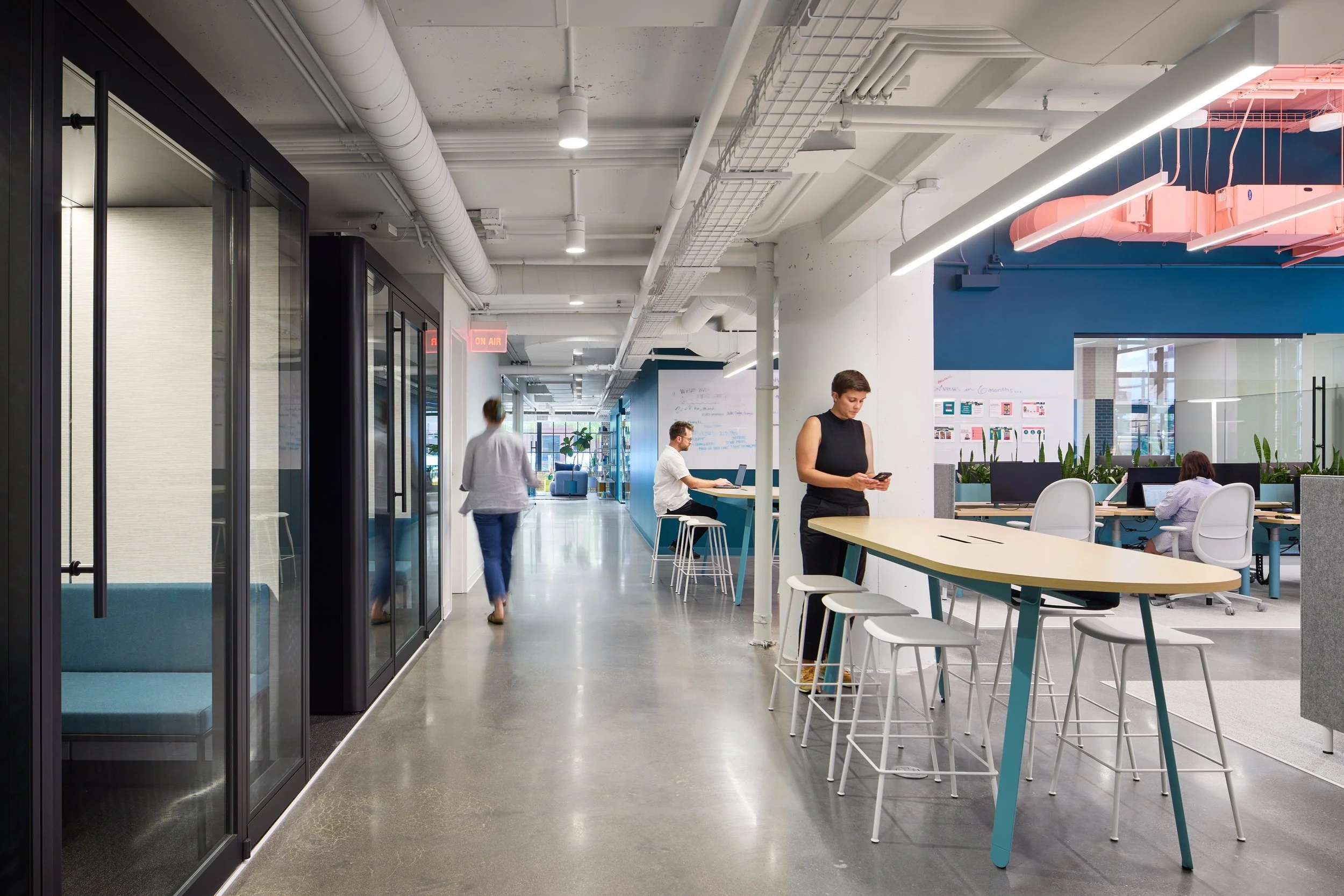 该空间在临街处设有一个专属的进出大门。进门后是一个仅有2.44米高的空间区域——营造出一种紧凑的空间感,并形成清晰的第一印象。温馨的接待台、充足的储物空间、舒适的休息区以及一块定制的霓虹灯标识,让人立刻感受到品牌的独特个性。在建筑布局上,一间灵活可变的培训室、一间宽敞的会议室,以及一间采光充足的内容创作室,均紧邻入口区域,并通过间隔设置的玻璃窗保持通透的视线。人们从外部可以看到这些空间内的活动,从而直观地展示他们的工作内容,也让整个空间充满动感与活力——正如客户所创作的作品一样。