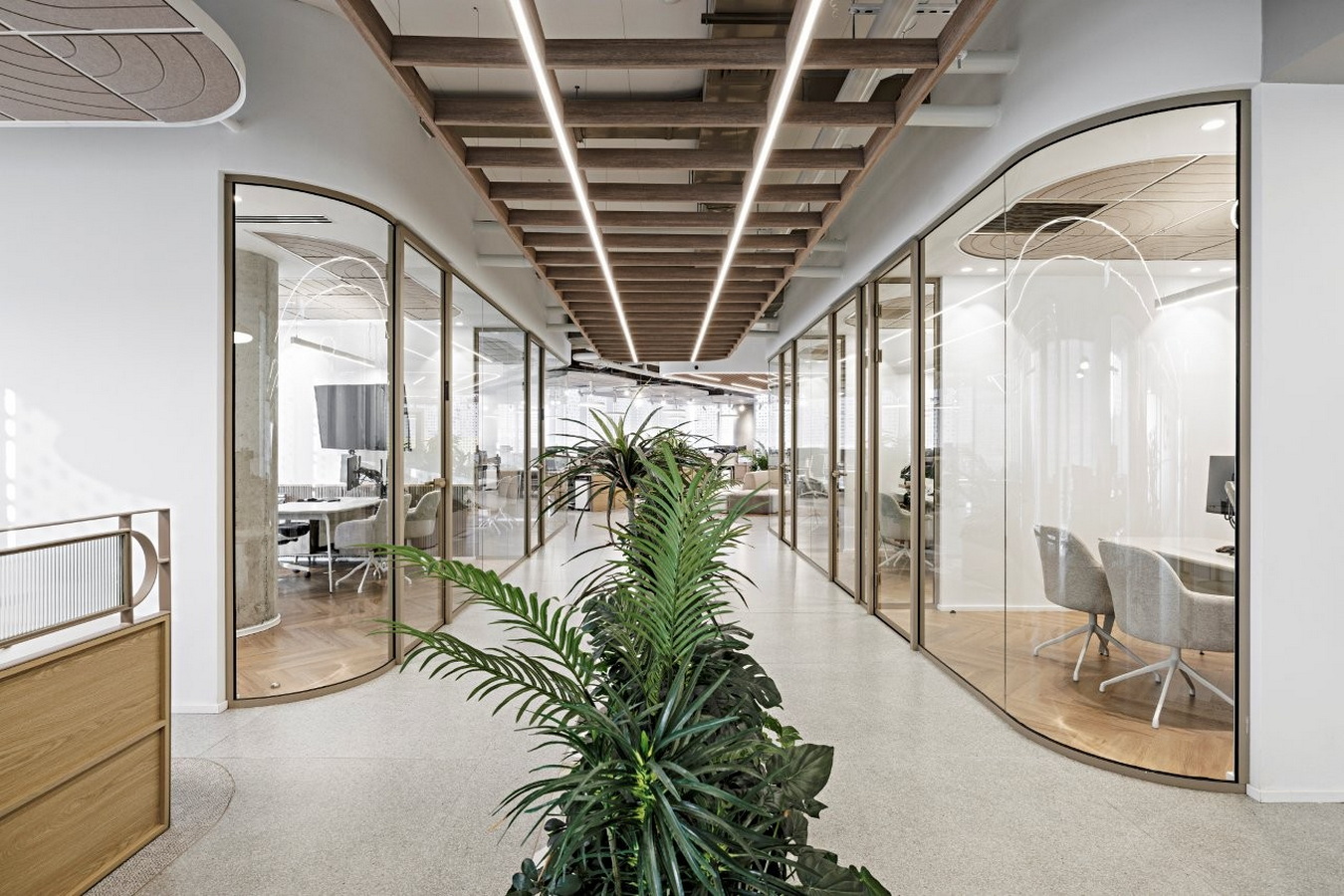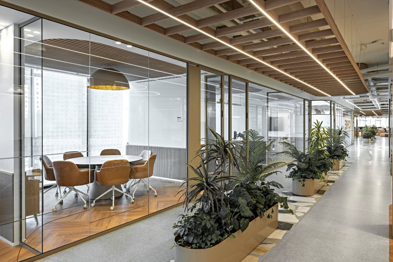另一项源自汽车行业的创意,是将街道引入室内——设计师打造出一条配有特殊路面铺装的中央大道。大道两侧点缀着置于圆形金属花盆中的绿植,以及设计感十足的绿岛,其间还设有豪华休息区、隔音电话亭等一众令人惊喜的巧思设计。