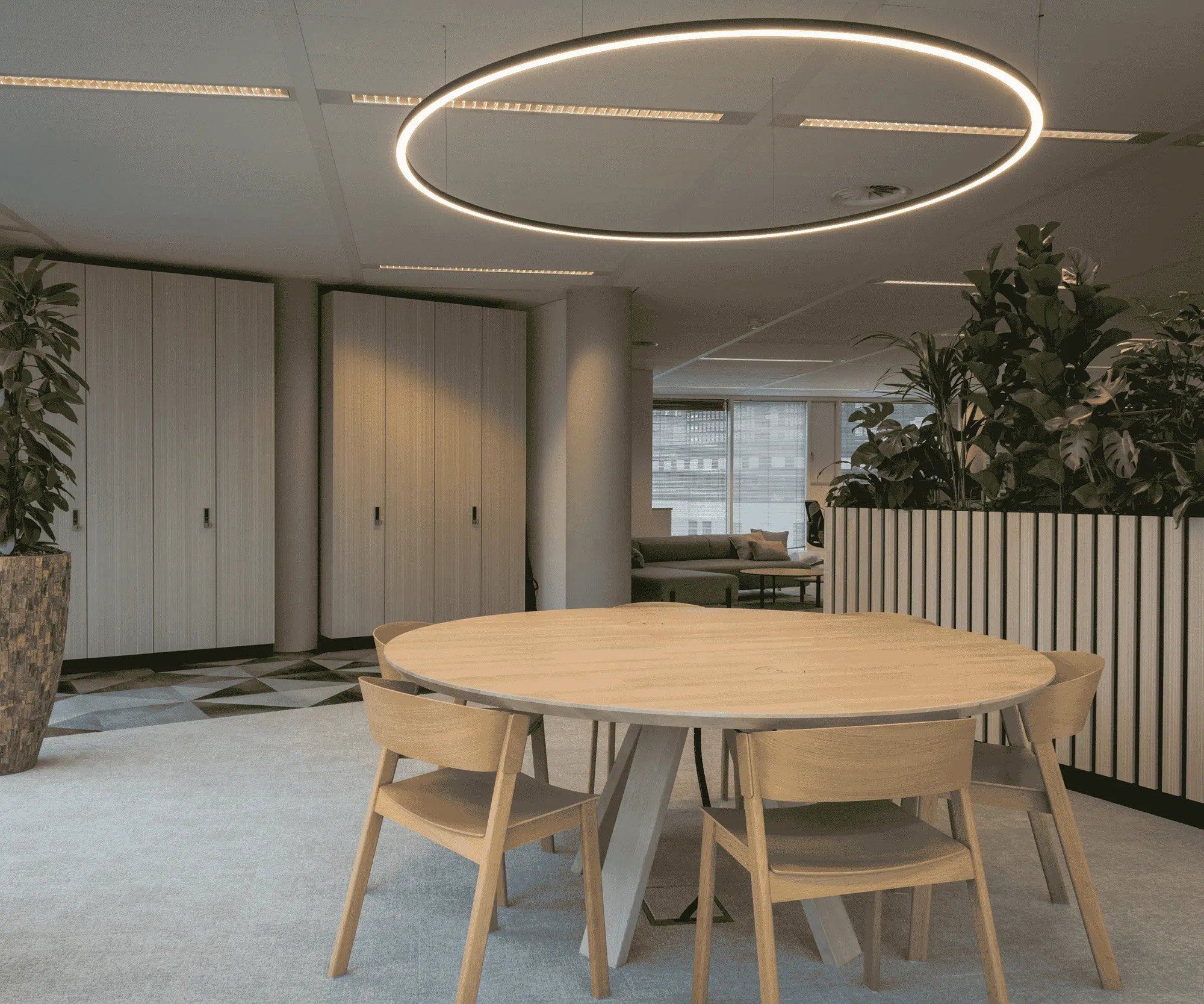图形元素、发光的理光品牌标识以及可持续材料,为室内空间赋予了独特的个性,使整体设计既专业又具有亲和力。最终呈现出一个充满活力、面向未来的工作环境,能够日复一日地激发人们的灵感。