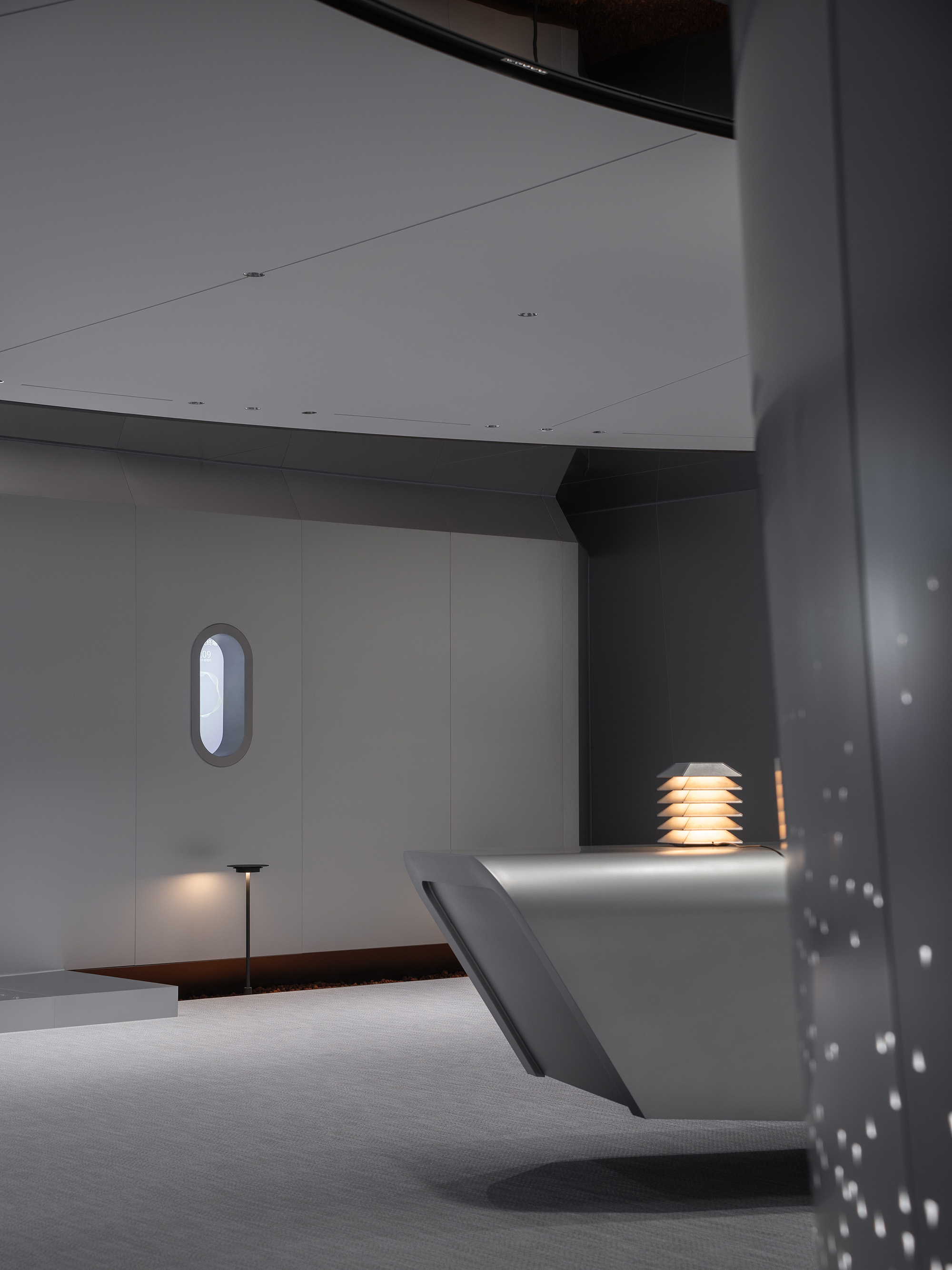 作为整个 69 层的核心重点空间之一,接待前厅仿佛飞船的舰桥,栩栩如生。 接待台的设计令人眼前一亮,摒弃了传统的长方体,将其塑造成一艘降落在停机坪上的星际飞船。流畅的有机形态,微闪的金属漆面,仿佛下一秒就要点火升空。