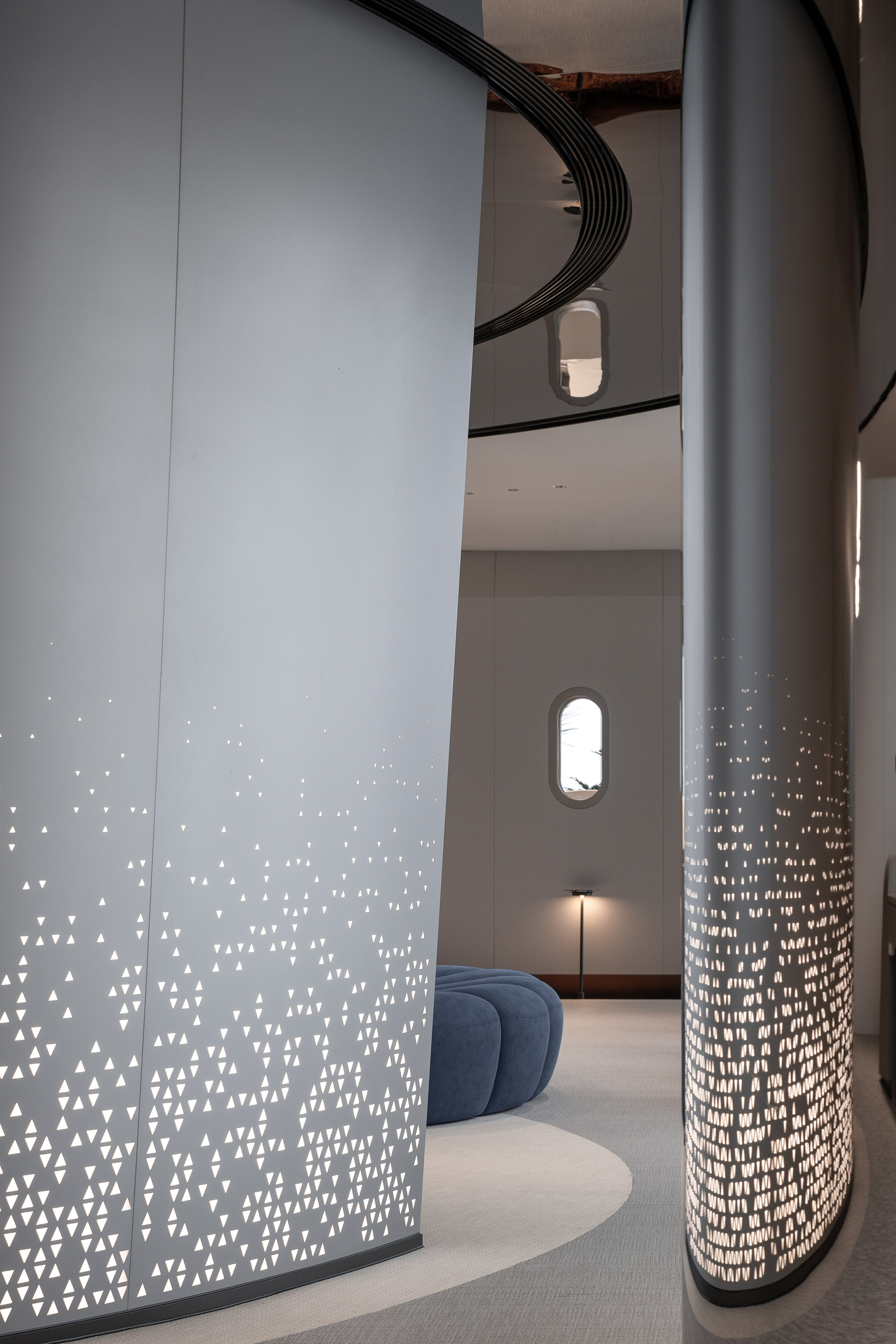 当电梯门打开的瞬间,体验即刻开始。设计并没有急于堆砌科技感,而是通过同色系和材质的天花与立面的极致延伸,消解了层高的限制,制造了一种“无限纵深”的错觉。你不再是站在写字楼的走廊里,而是站在通往舰桥的“气闸舱”,星际电梯厅化身为时空折叠的入口。