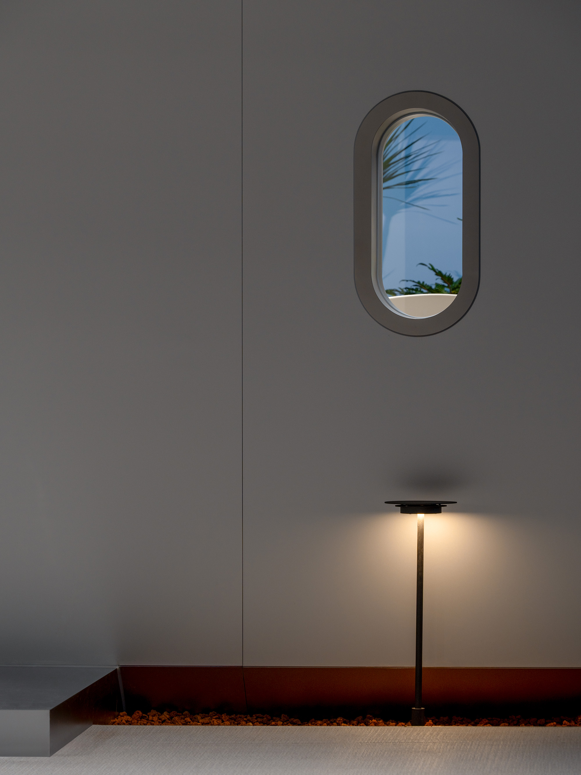 接待区边缘的石块并非随意摆放,而是特意挑选了表面带有气孔和肌理的绣红色石头,它们像散落在地球的陨石碎片,承载着宇宙的信息。