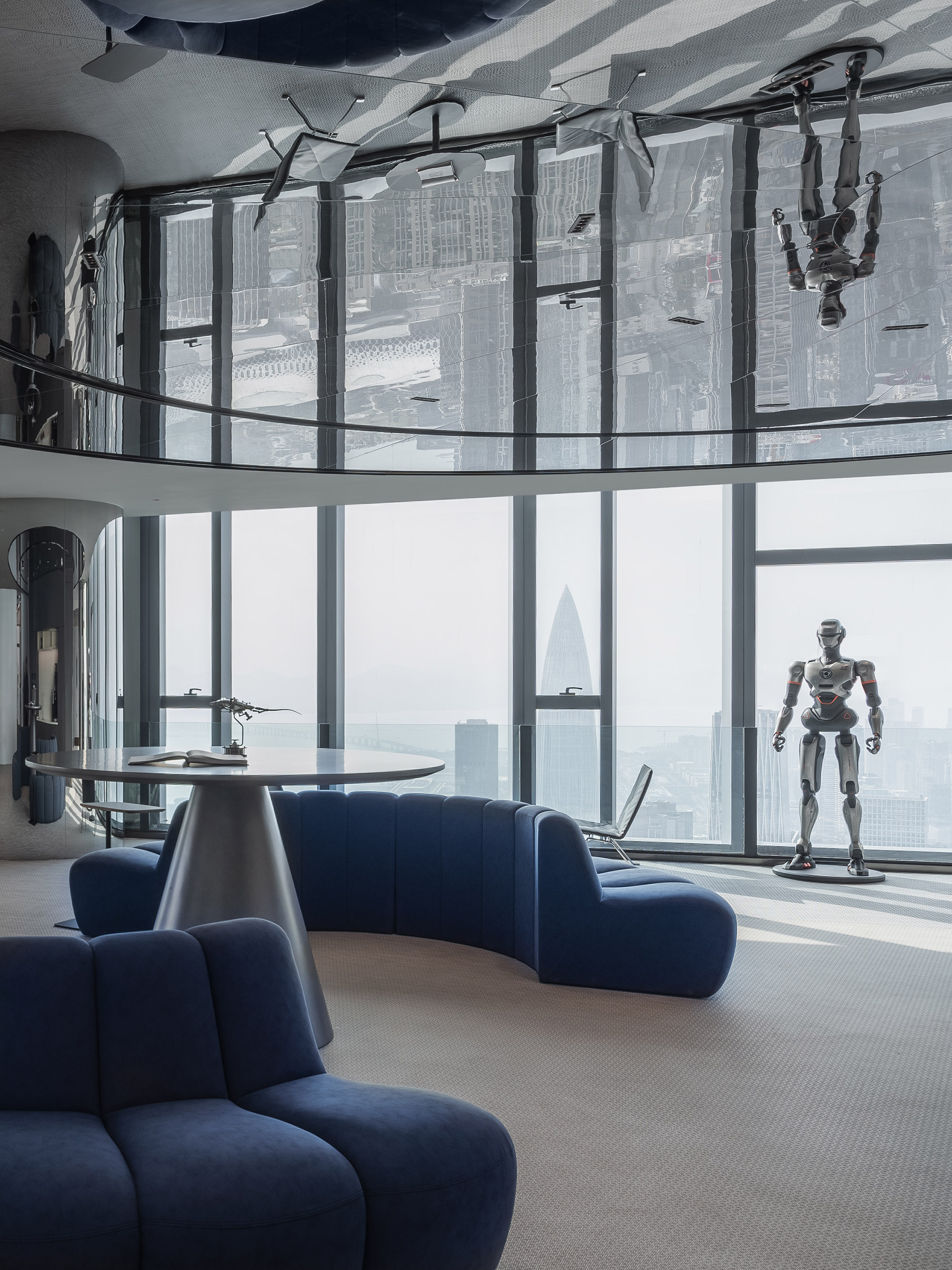接待大厅的一侧是全景落地窗,光线和视野极佳,尽享深圳湾云端美景。深蓝色的柔软造型沙发让现代科技的空间多了一丝舒适与松弛,窗边矗立着一个机器人作为艺术装置,极具未来科技感,预示着远征的开始。