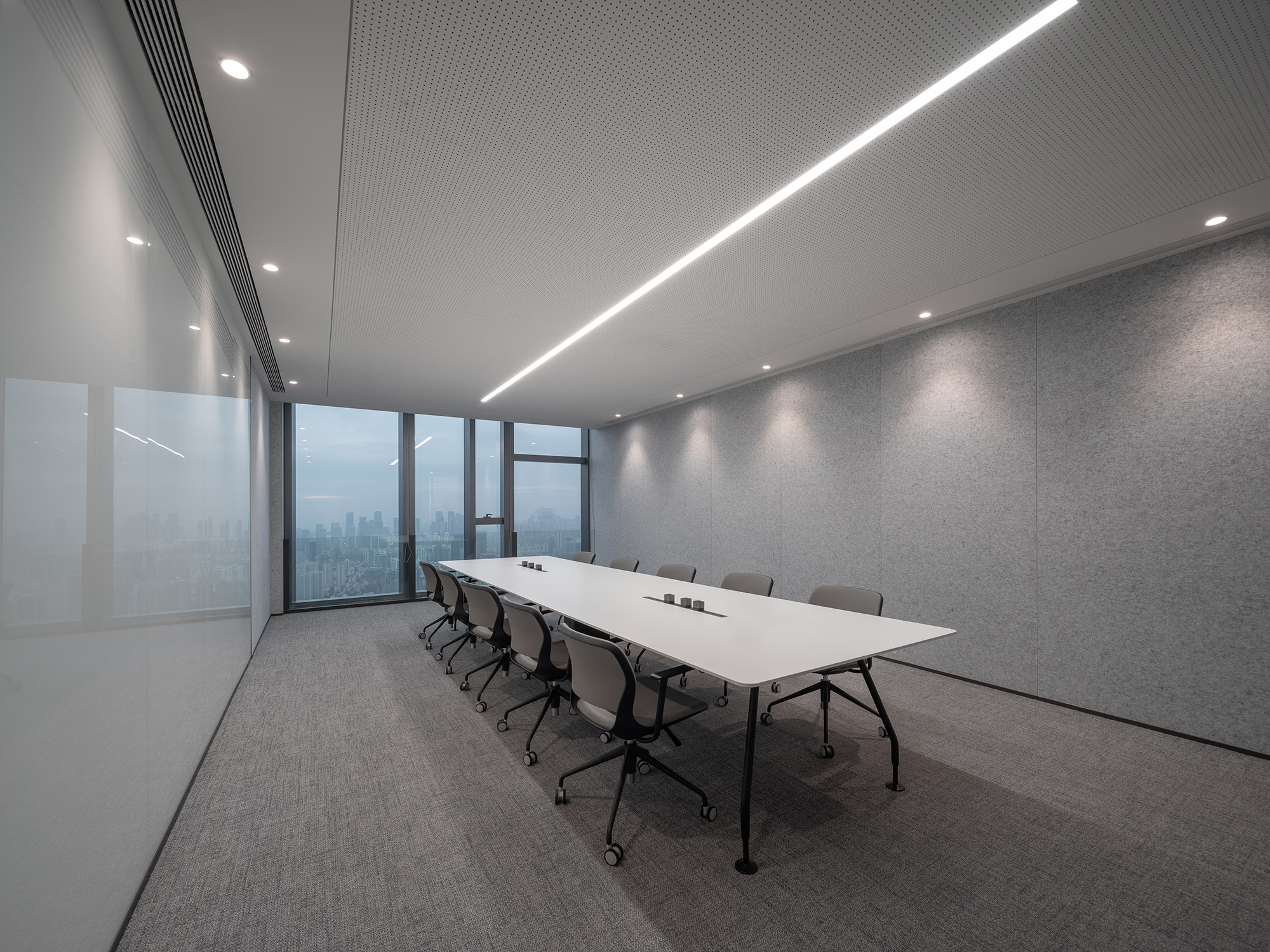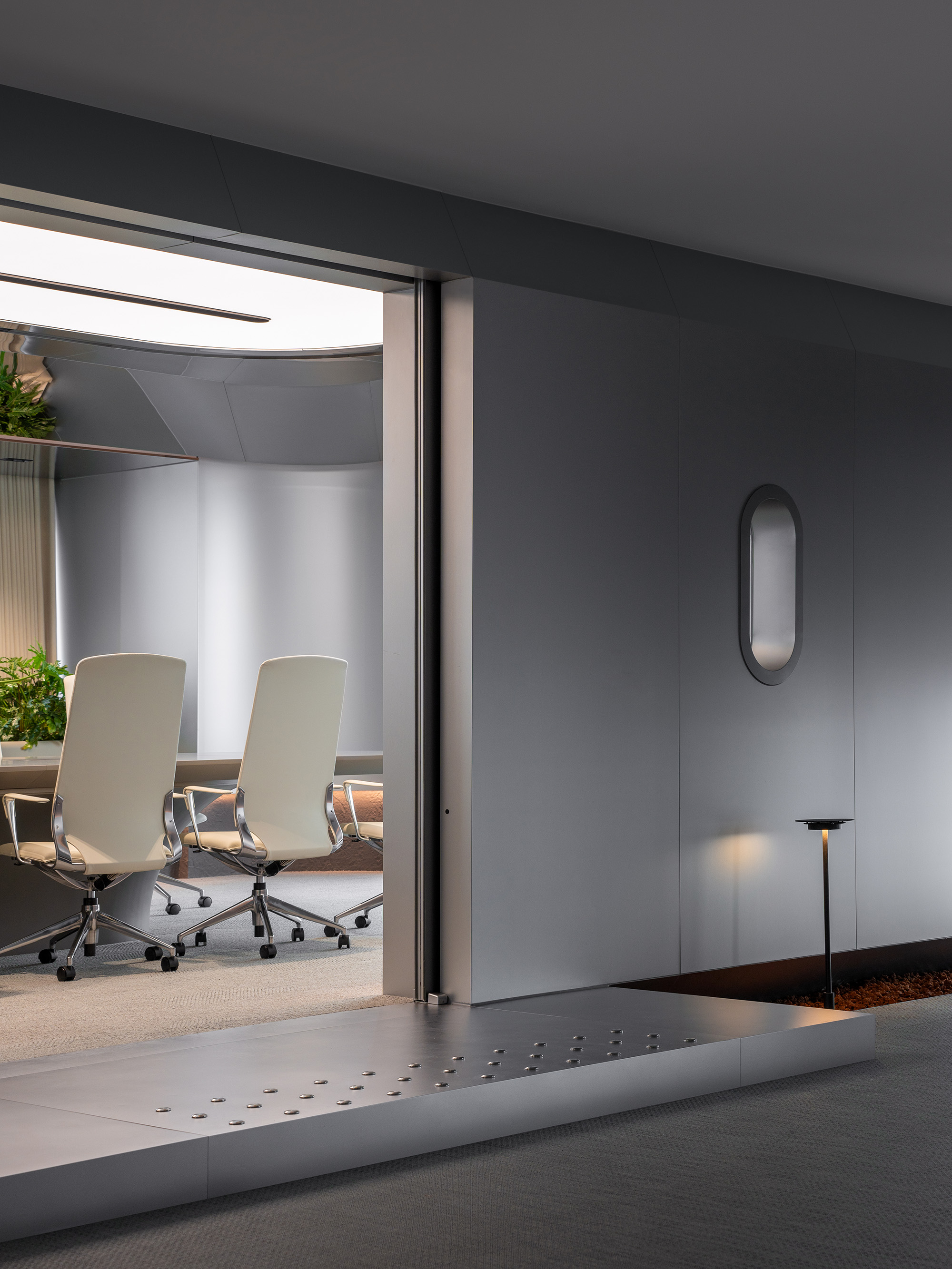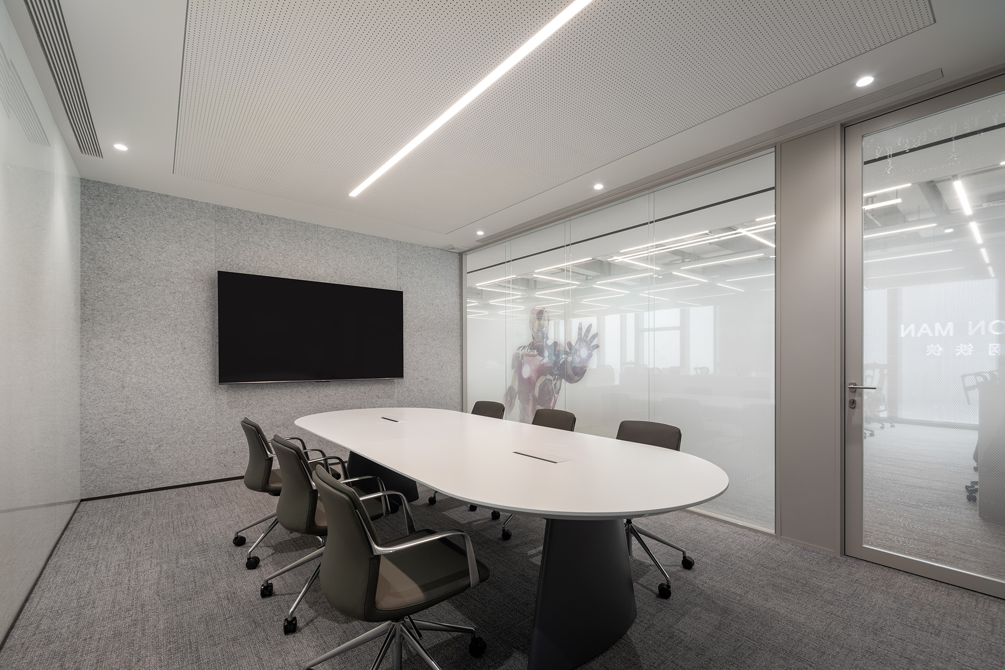 紧邻接待区的会议室,内部空间设计延续了“舰桥指挥舱”的气质。定制的镜面天花呼应了接待区未来科技感的空间调性,可调光的造型灯膜同时模拟了星环的形态,且在一定程度上让视觉空间更显大气开阔。