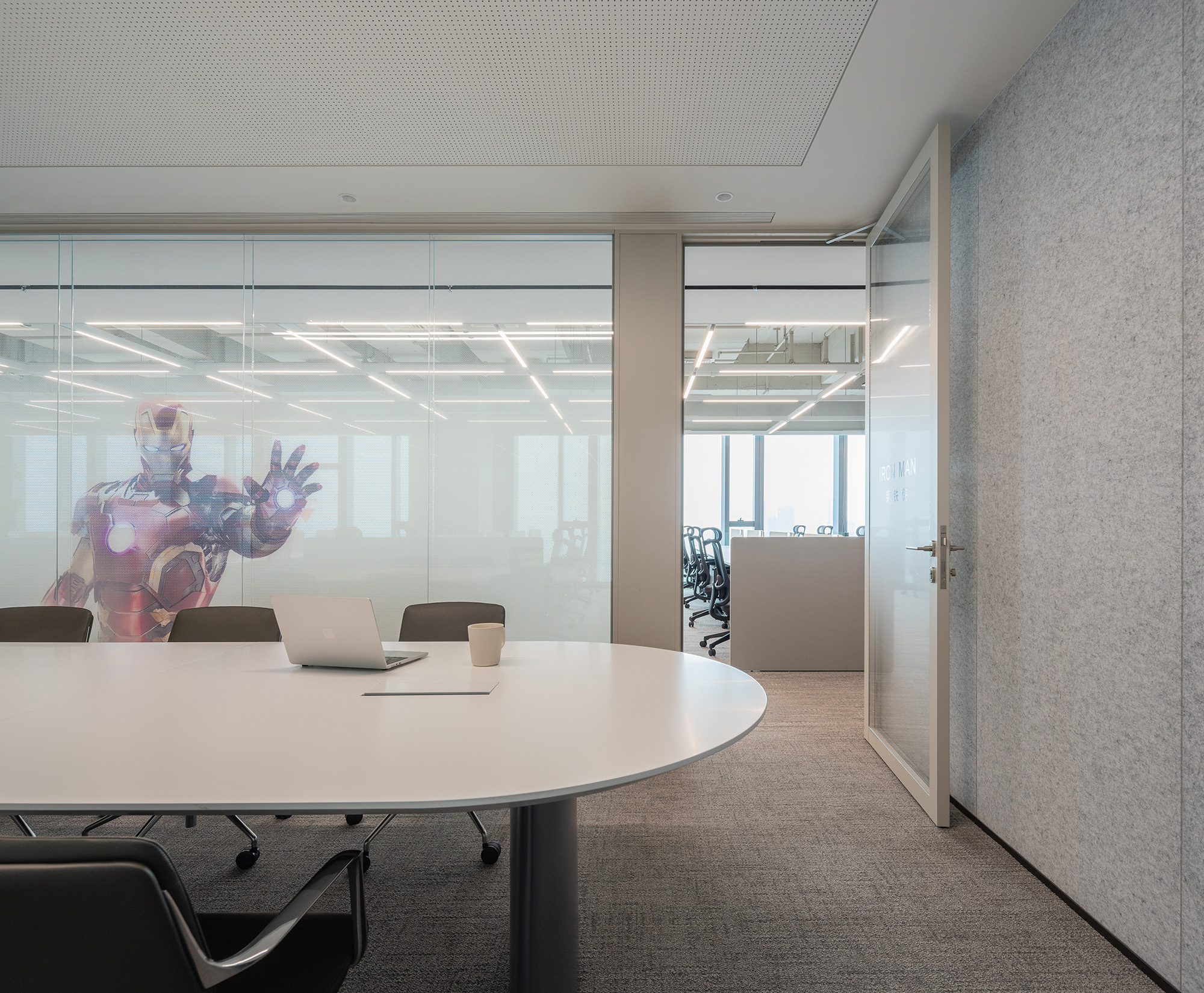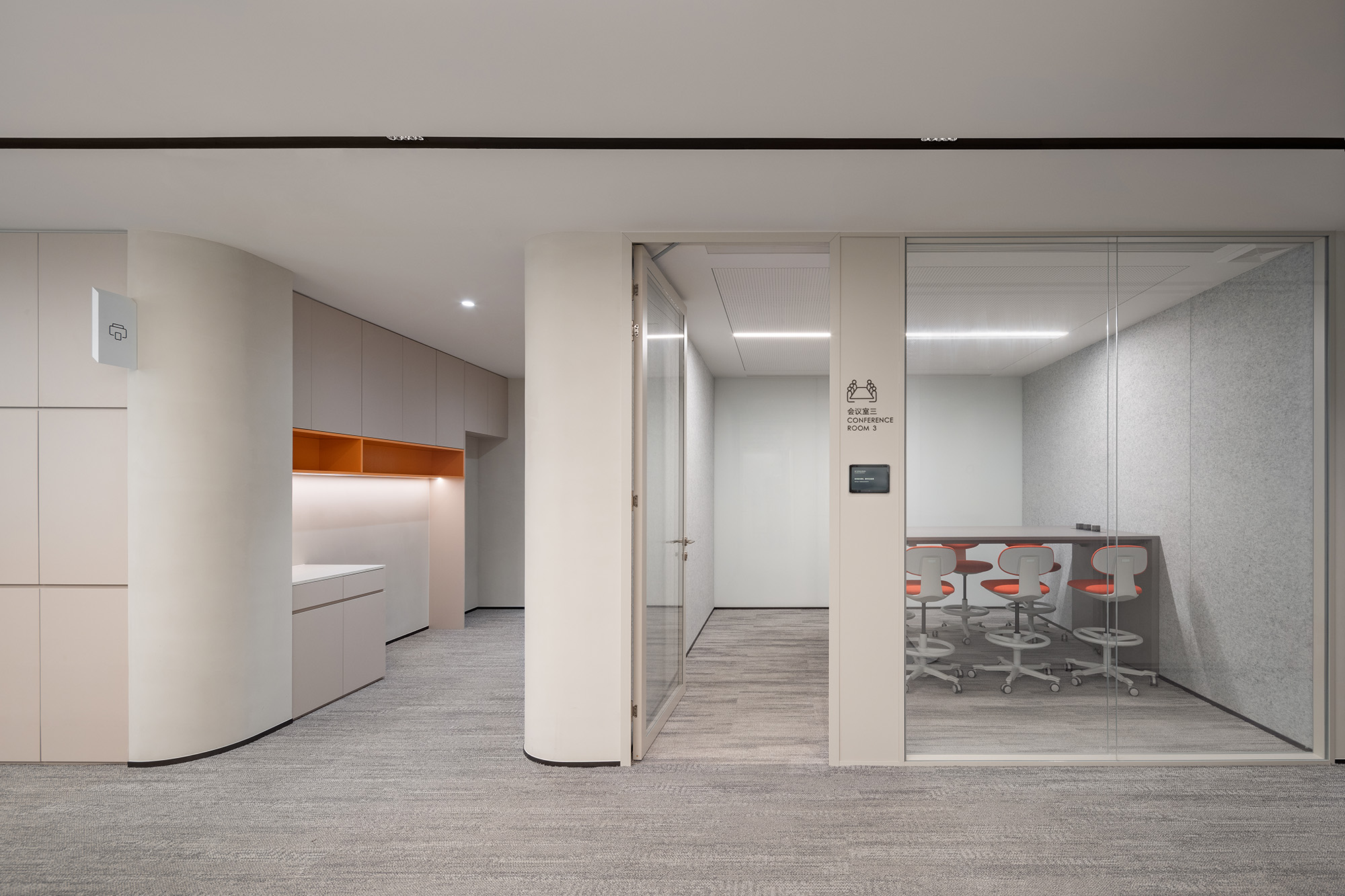 中小型会议室,它们像一个个漂浮在空间中的“太空舱模块”。内部使用了大量的毛毡吸音板,不仅是为了声学舒适度,更是因为那种毛茸茸的触感,能中和科技带来的冷峻,给思维碰撞提供一个柔软的“茧”。在这里,灵感不再被墙壁困住。