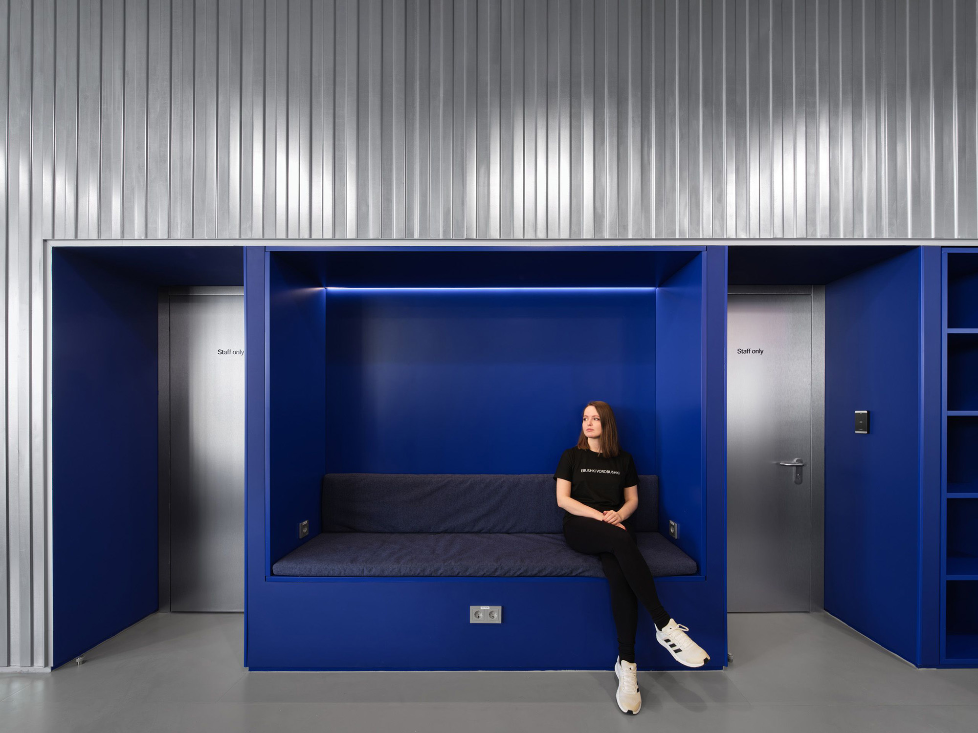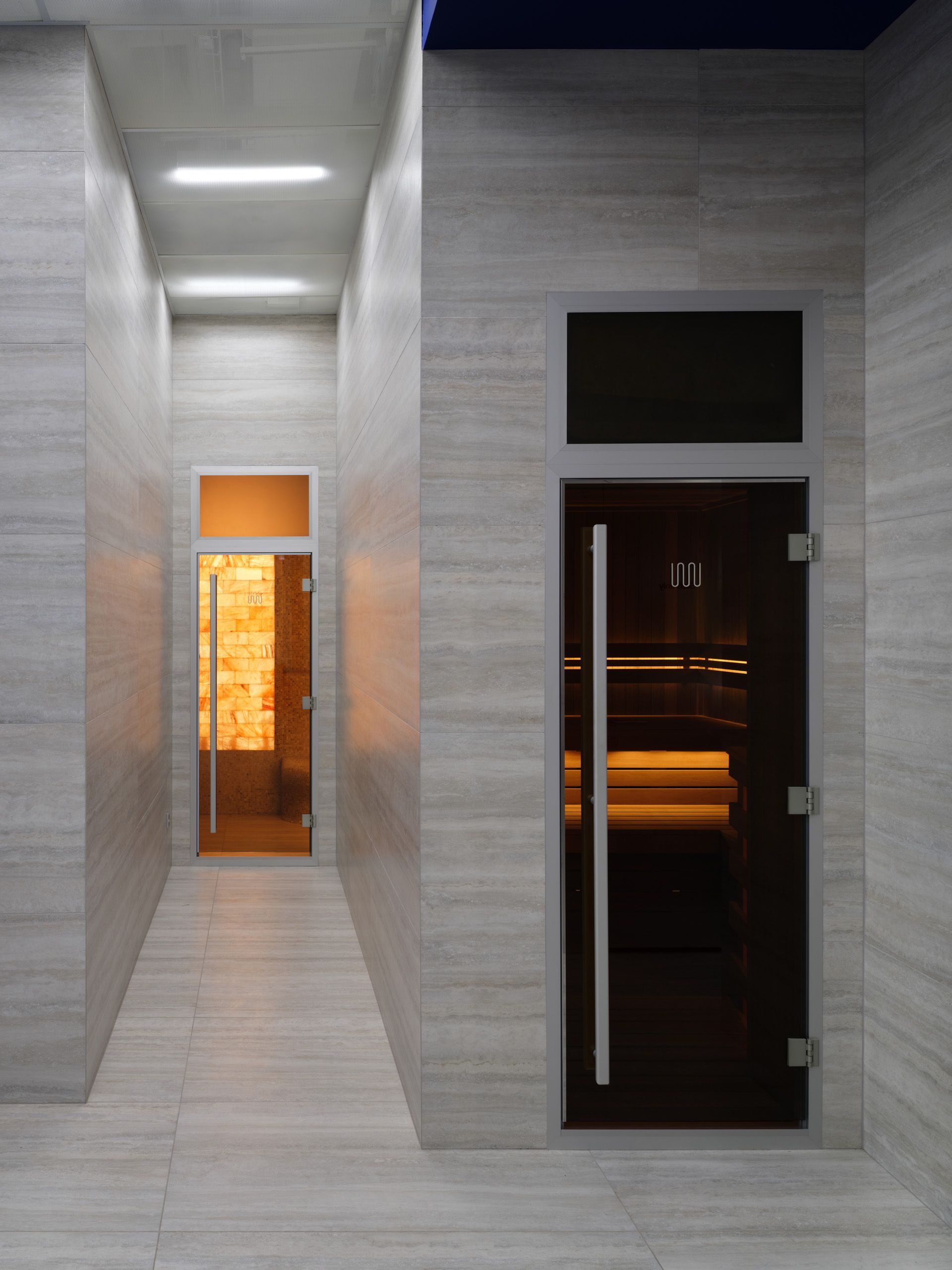 · 淋浴与更衣室:简洁的线条、混凝土、深蓝色天花板、富有戏剧性的灯光——这里是重置与过渡的空间。