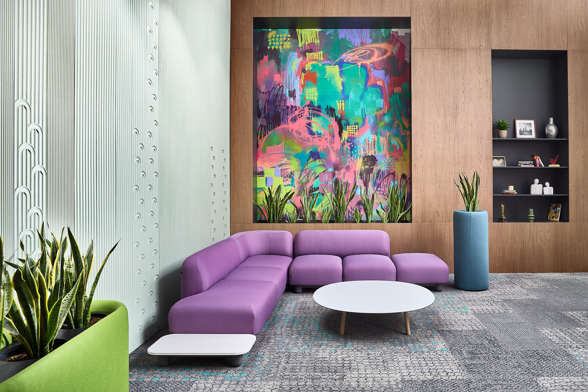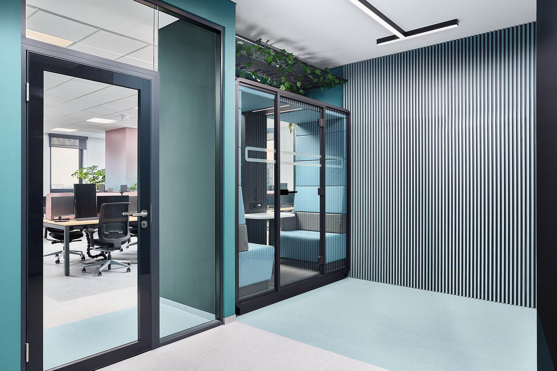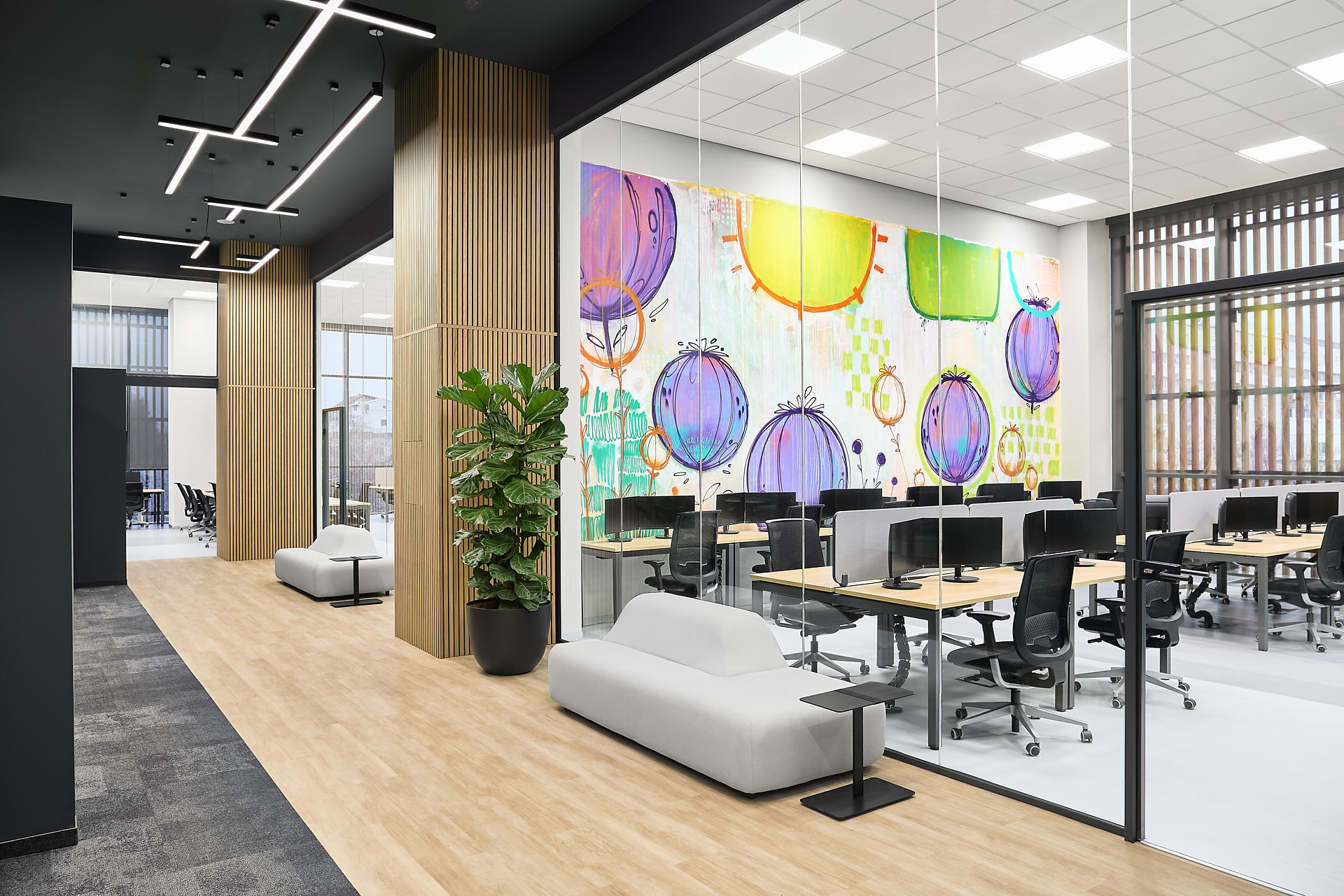 “空间的视觉识别通过手工绘制的壁画和定制印花得到了进一步增强,而声学舒适度则通过整合多种声学产品得以实现。空间中布置了精心挑选的绿植、多样化的植物和苔藓,它们营造出和谐的视觉平衡,改善了室内微气候,并有助于形成愉悦、宁静且鼓舞人心的工作氛围。”——建筑师兼项目经理伊莉娜·米罗诺斯卡如是说。