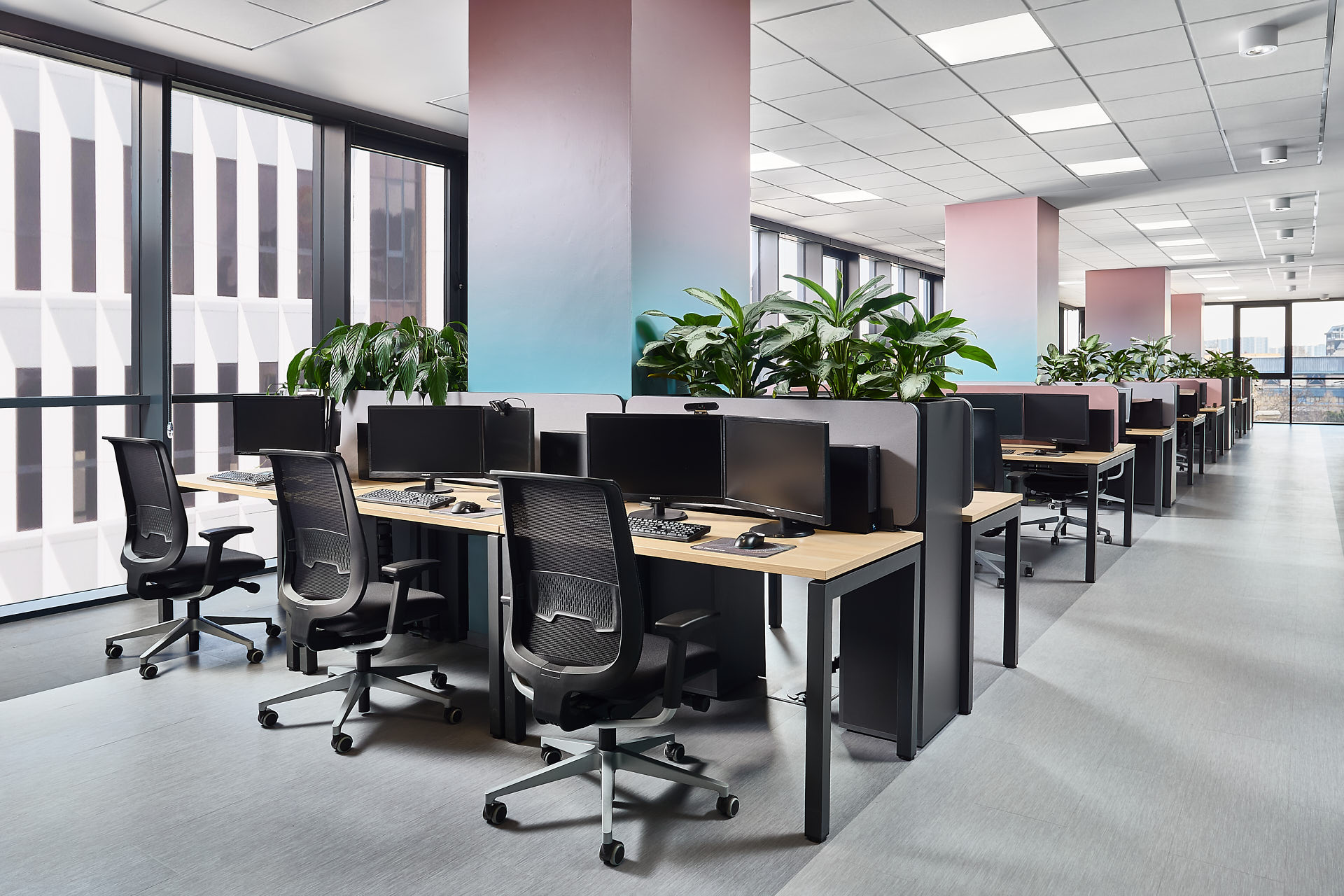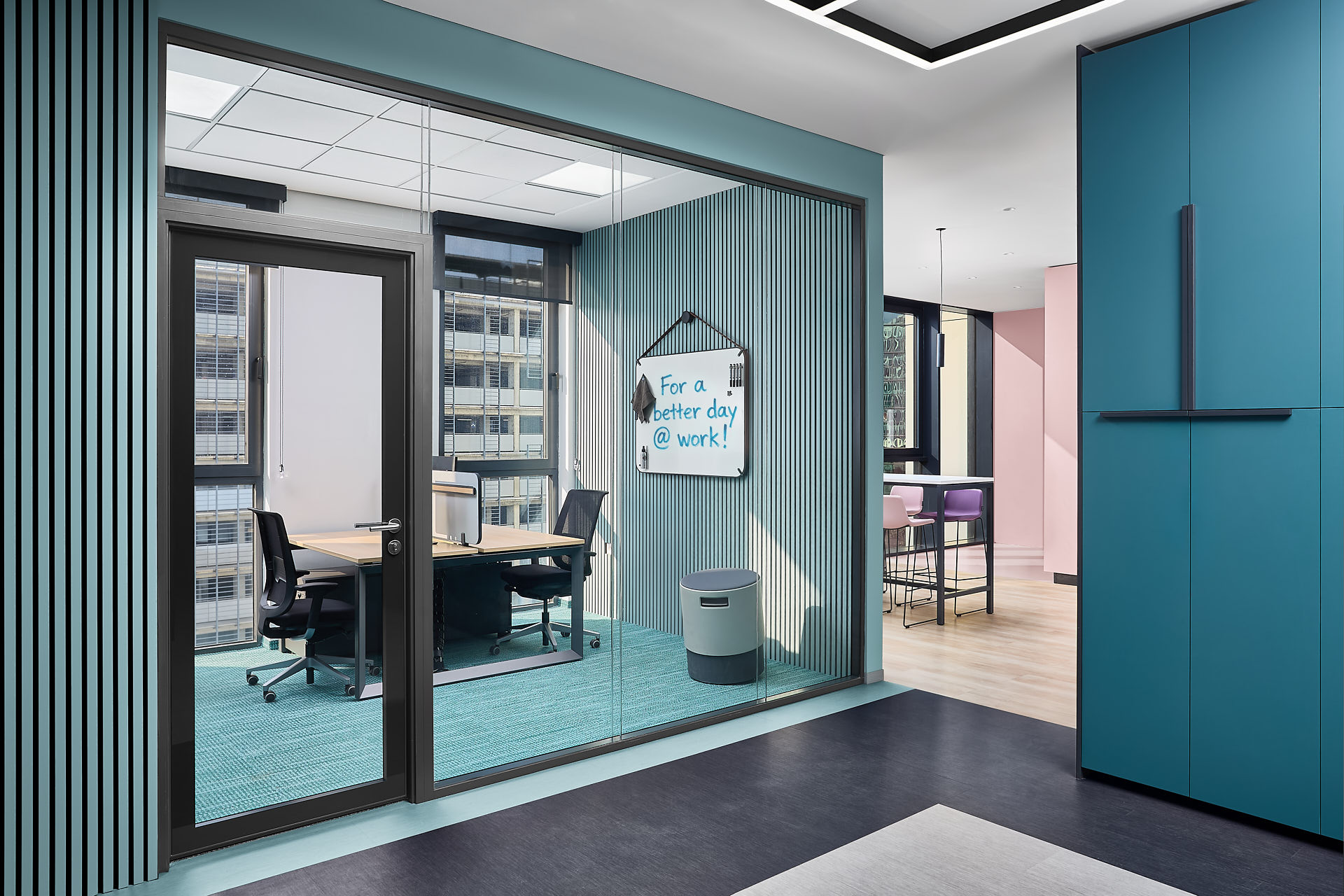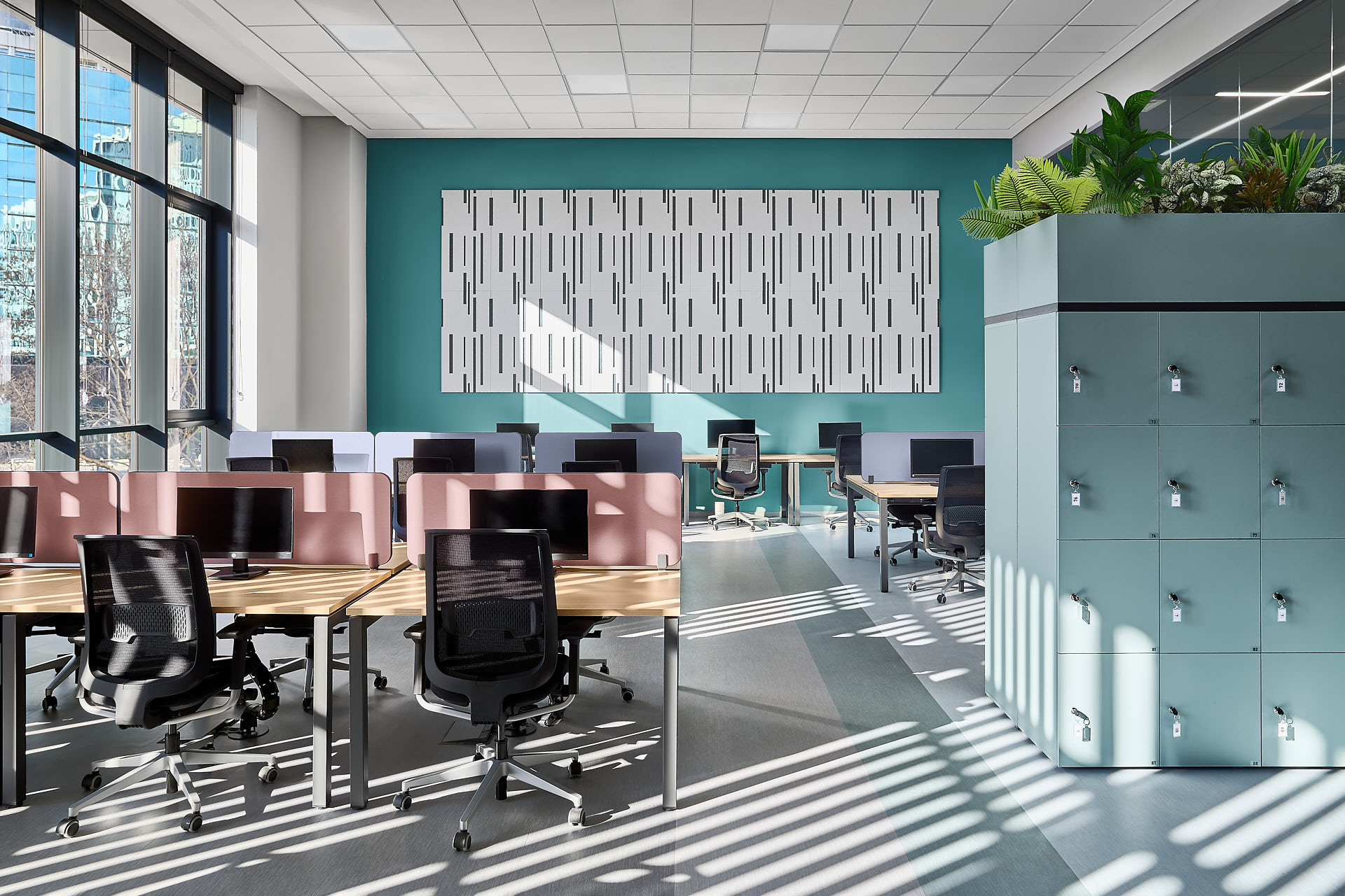 空间隔断采用玻璃隔墙,使自然光能够照射到整个空间。通过采用吸音墙面材料以及集成在工位上的隔断,开放式空间声学方面的挑战得到了解决,同时并未阻碍空间的开放感与连通性。此外,该区域内还设有独立办公室,可提供更高程度的私密性,并能根据团队的不同需求进行灵活调整。