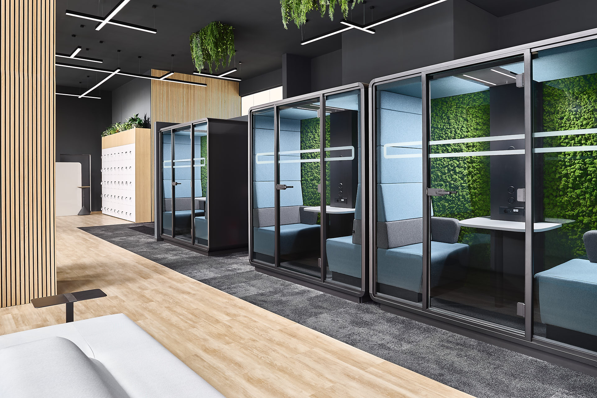 类型二:电话亭,完全集成了通风和电气系统,专为个人通话和在线会议而设计,占用空间极小。