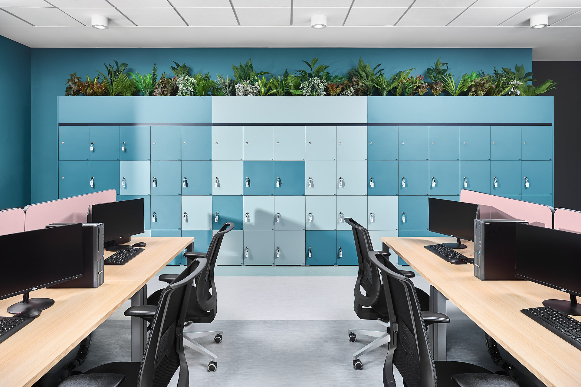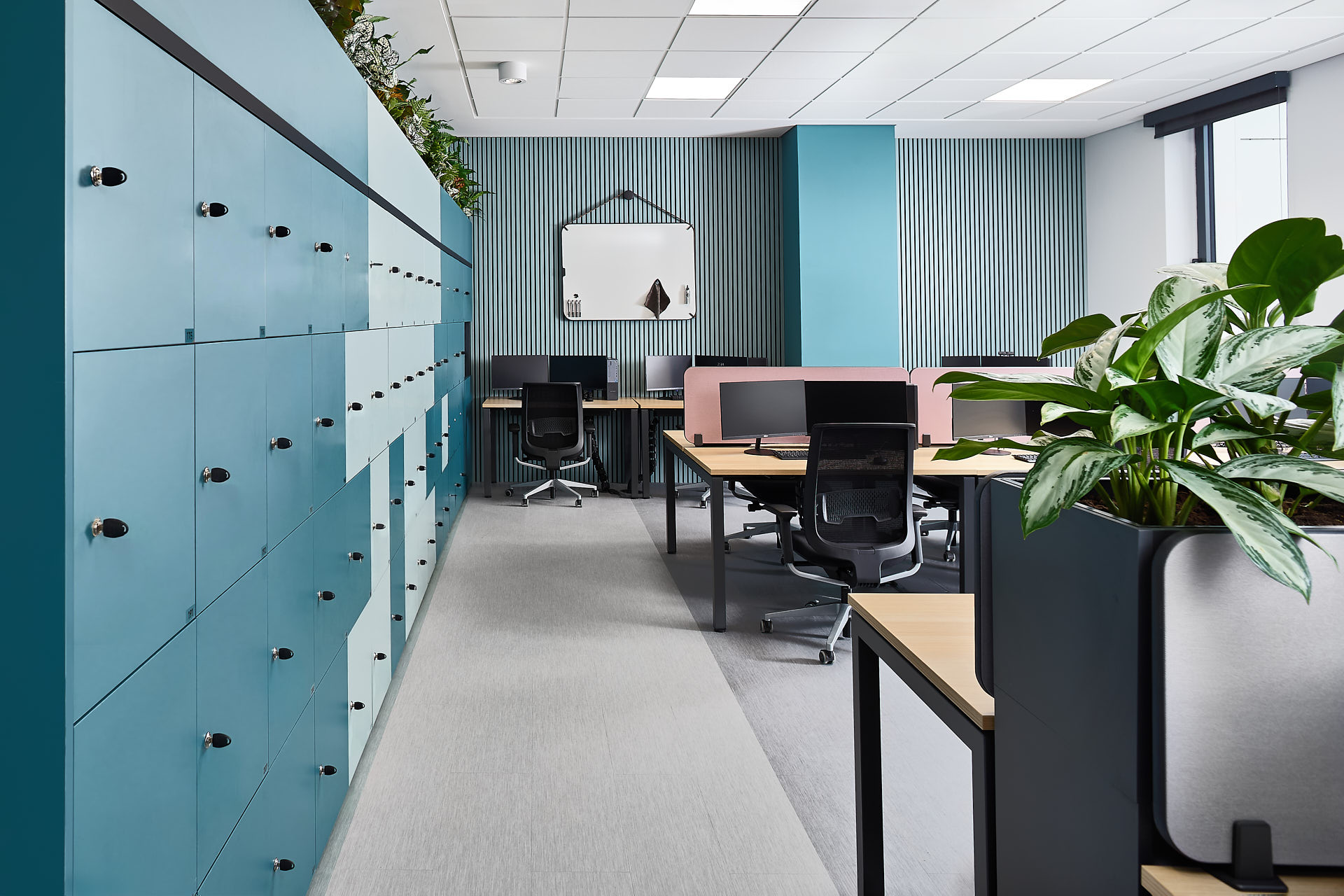 辅助资源区被巧妙地整合到整体空间概念之中,为员工的日常活动提供功能支持,同时避免在视觉上占据室内主导地位。该区域涵盖了个性化的储物柜系统(支持灵活使用工位的方式)、储藏室、衣帽间、打印区等。