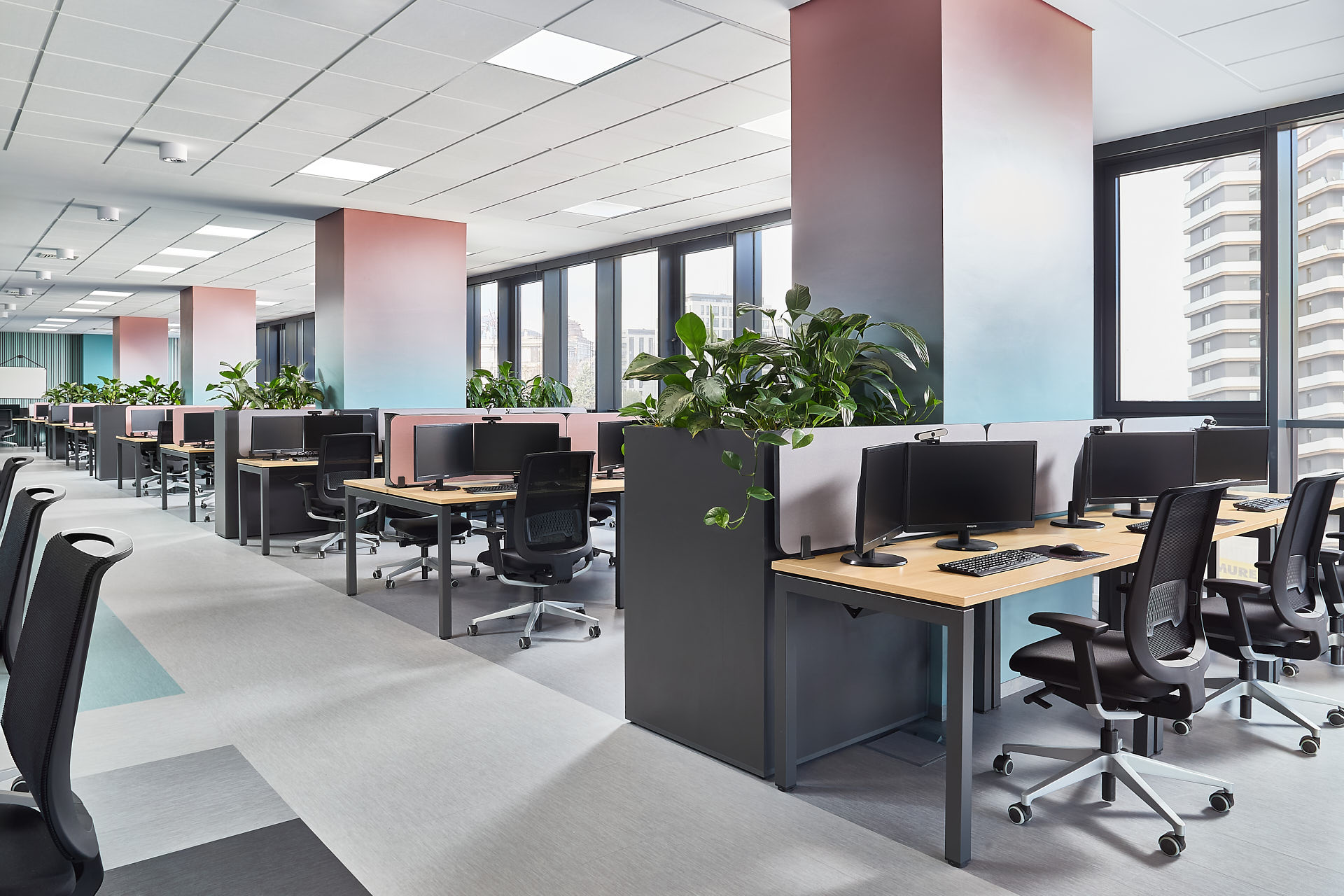 员工办公区是第二个区域,员工在这里度过大部分的工作时间,主要用于个人独立工作。该区域在整体上采用现代开放式平面布局进行组织,空间尺度根据团队需求进行划分。各标准层被分为四间较大的办公室,从而实现了更高的私密性以及专注工作的可能性。