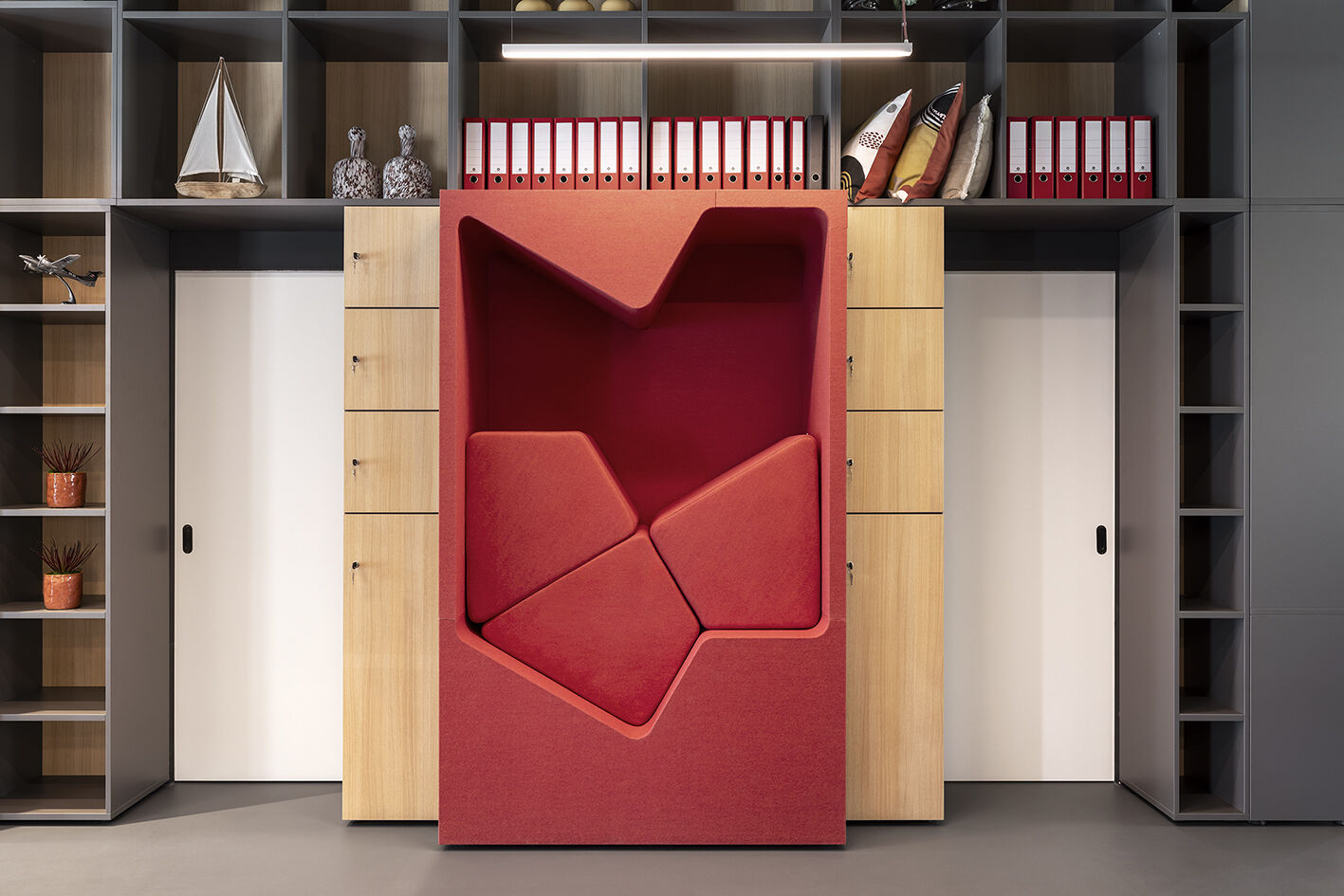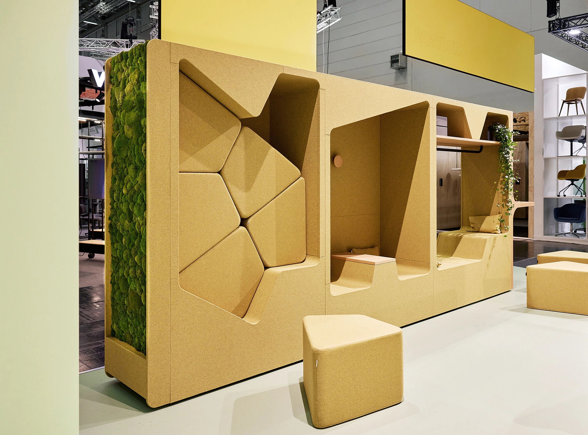 作为墙面艺术装饰或空间分隔装置,“跑酷”系列柜式工作舱以其织物质感的外观,为现代开放式办公空间注入居家般的温暖气息。其前后装饰板均完全采用织物覆面,表面亦可兼作灵感钉板。配合与之协调的软包组件,“跑酷”整体呈现出和谐统一、充满创意、并富有愉悦感的美学形态。该产品系列提供“werner works”标准单色饰面。除九种纯色饰面外,定制化单元还提供多种天然木饰面的选择。