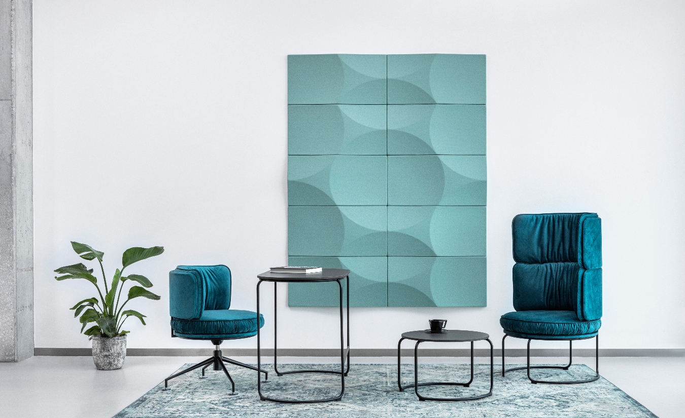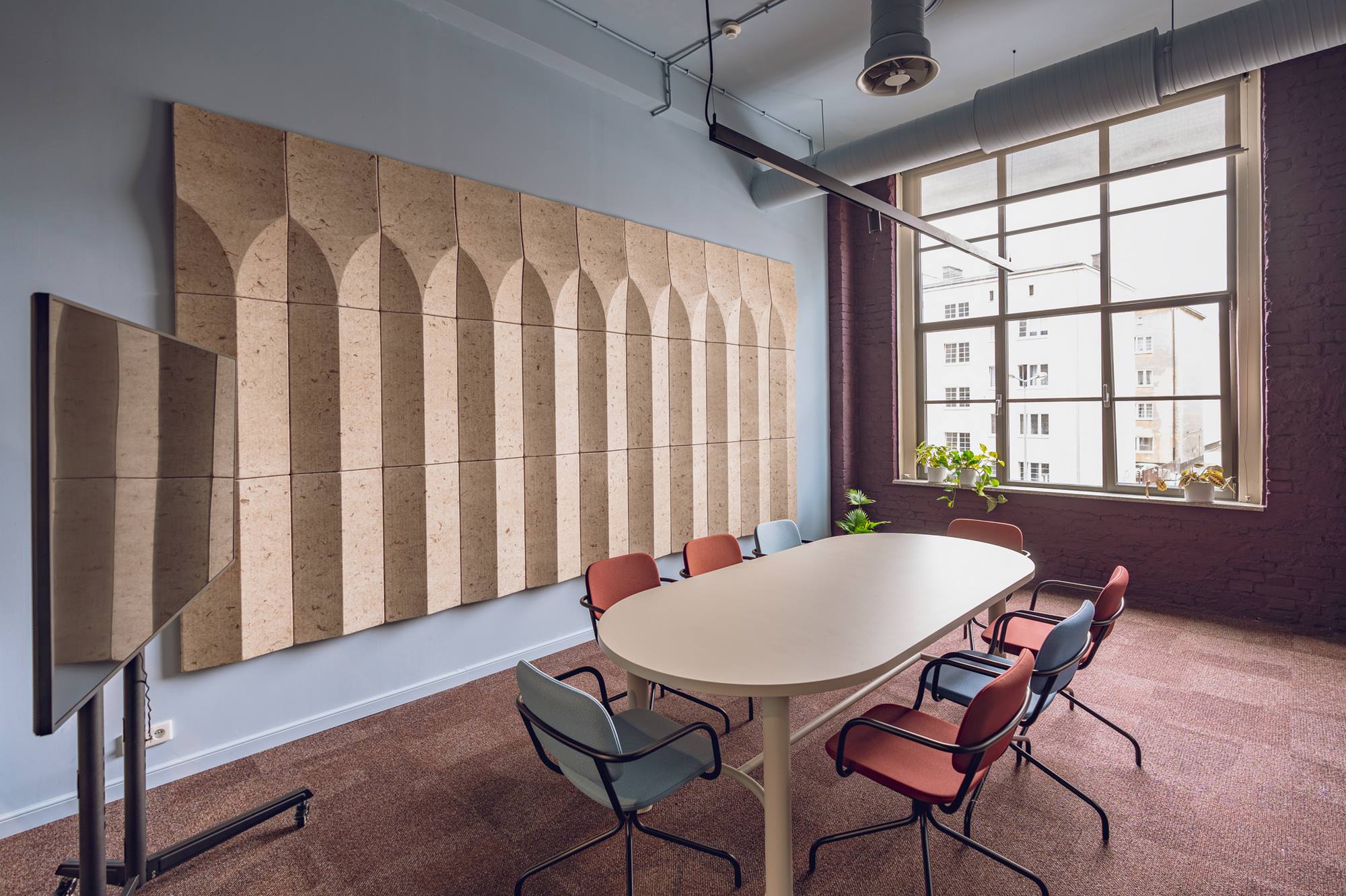 声学处理在会议室中至关重要——设计旨在营造舒适的工作环境,同时避免完全隔音带来的压抑感。基于专业声学分析,设计团队精选了材料设备,尤其是天花板与墙面的吸音面板。此外,走廊空间设置了语音降噪达A类等级的声学舱,其表面采用压缩麻纤维制成的生态板材,吸音系数高达α=0.90。