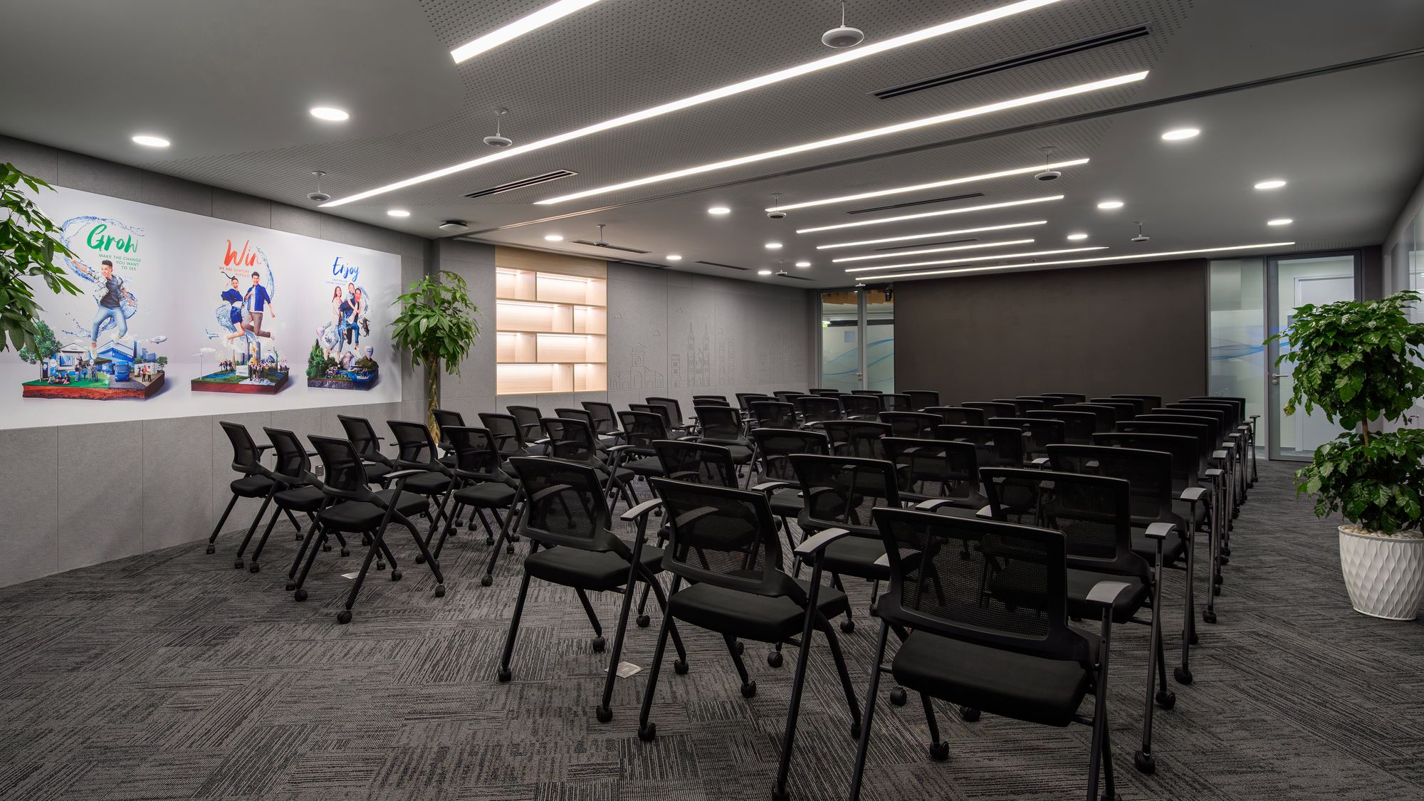 贯穿始终的设计语言以柔和的波浪动感为主题:从接待区流畅的弧形长凳,到模仿水波纹节奏的玻璃装饰贴面。这些设计远不止于视觉美感——它们更是一个活力企业独特的视觉表达,既象征着公司不断向前发展的步伐,又始终坚守着品牌的核心精神。