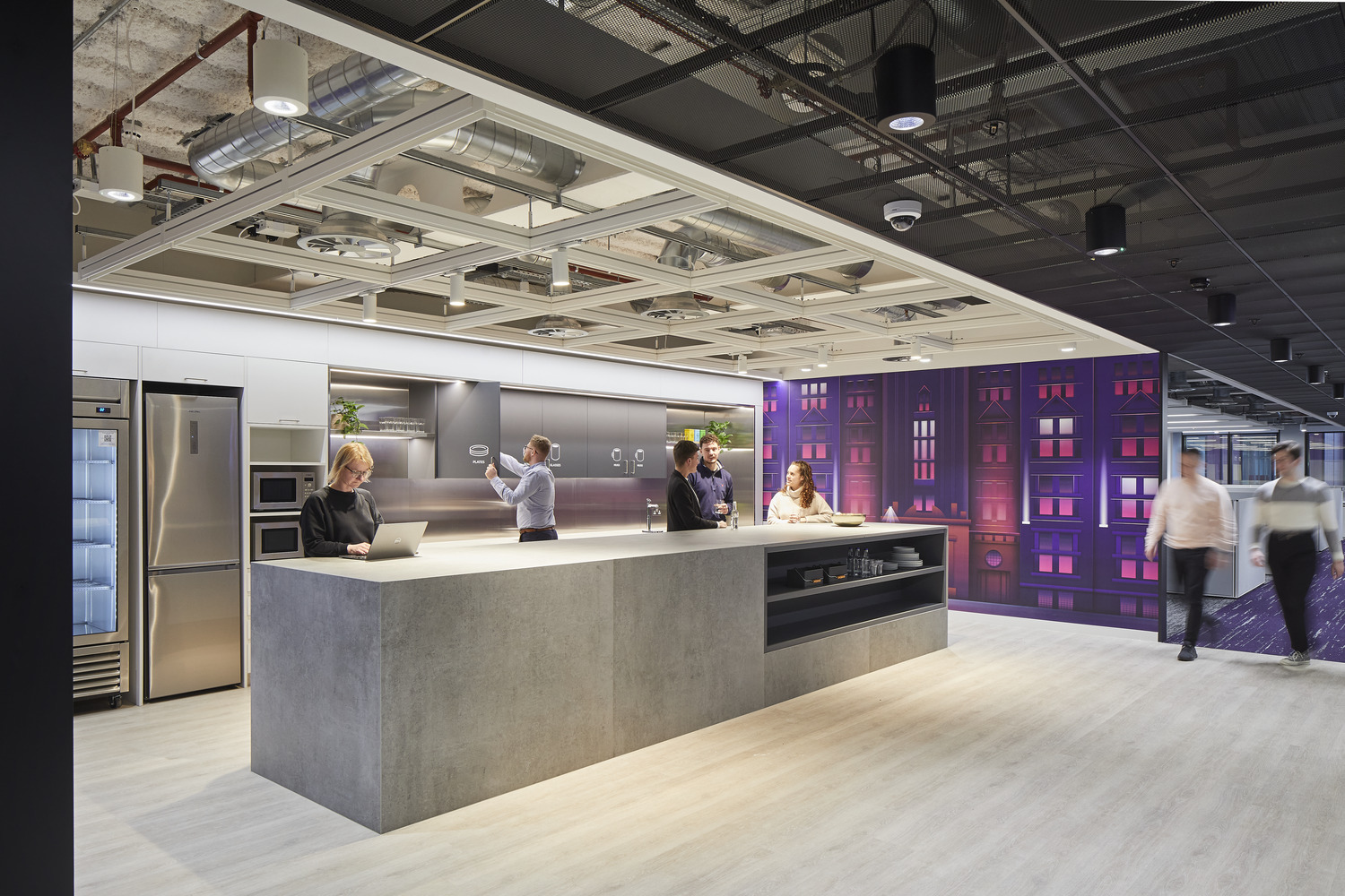 作为全球统一品牌标识的Roku,其专属紫色与曼城街区历史、娱乐主题交融,通过沉浸式图文呈现于空间各处,甚至融入地面及会议室命名体系。充裕的灵活活动空间既可举办全球全员大会,也能承办外部科技盛会。专属的面试房间同步展示Roku产品魅力,让求职者提前体验未来工作场景。