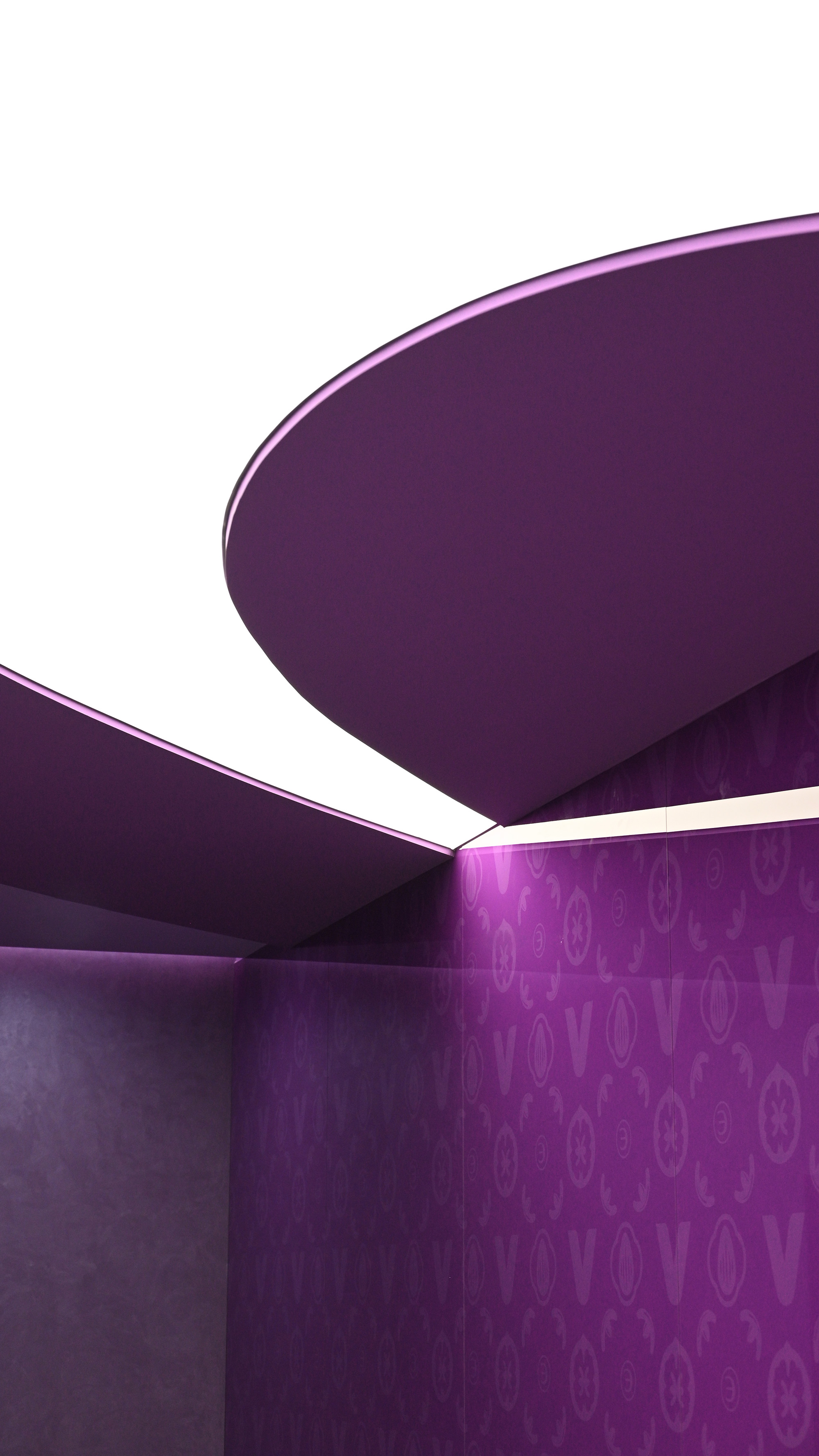 紧扣「我们只销售健康」的品牌宣言,设计师从唯怡经典产品中提炼双主题色。紫色象征天然成分的创造力,绿色传递健康生命力,二者交织成贯穿空间的视觉基因。