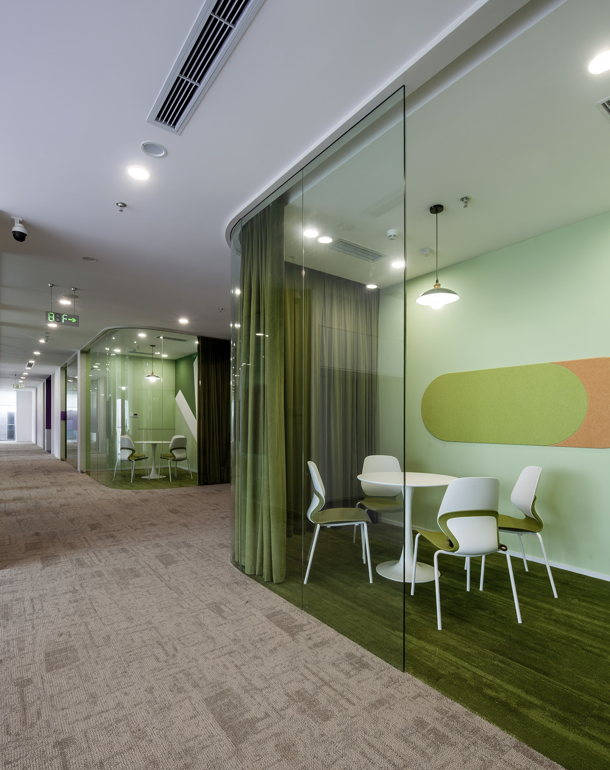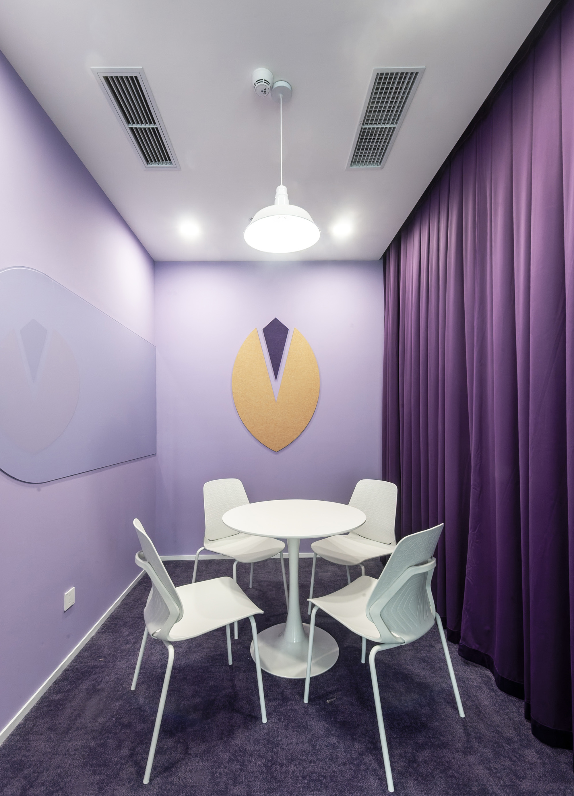 大培训室/中会议室/小洽谈室三阶布局,适配多元场景;吸音板拼贴出唯怡LOGO「V」「E」抽象造型,乳胶漆跳色墙面延续紫绿脉络;彩色落地帘与同色系地毯,构成动态艺术装置。