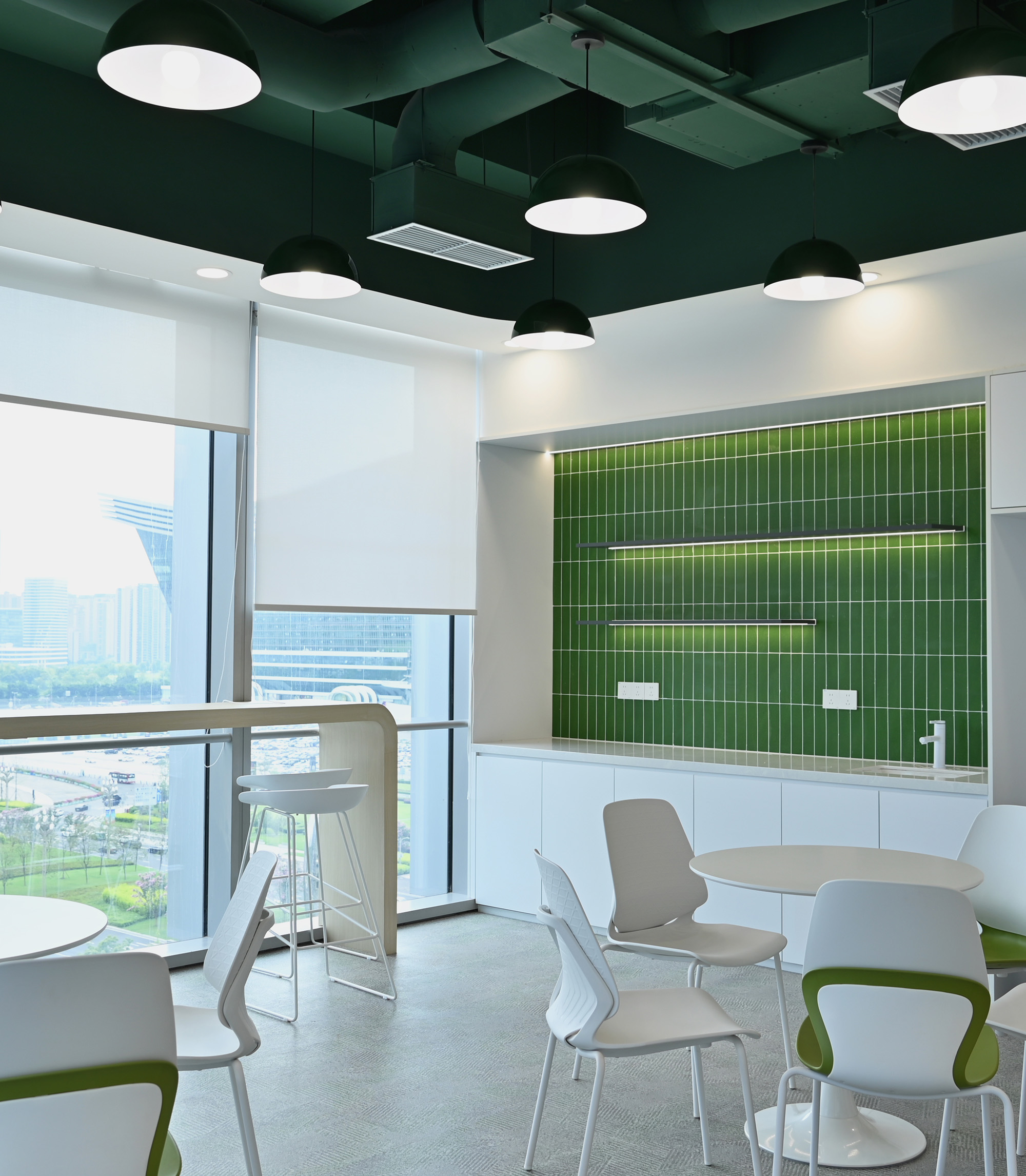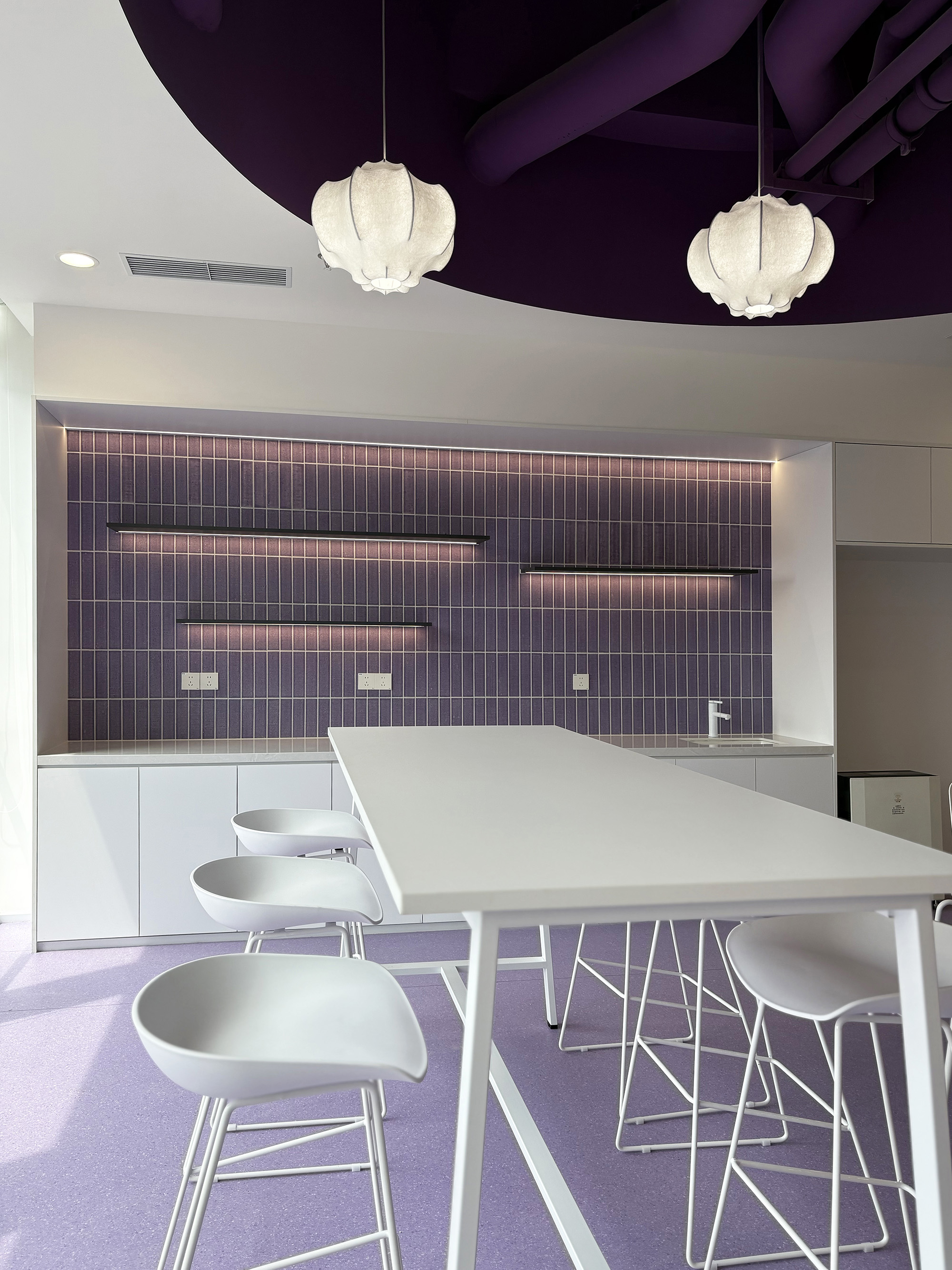 绿洲茶水区:临窗吧台配高脚椅,俯瞰天府大道车流霓虹。紫调茶水区:紫调软包卡座+圆形餐桌,阳光与城市天际线在此交融。从咖啡洽谈到团队脑暴,满足各种休闲场景切换。