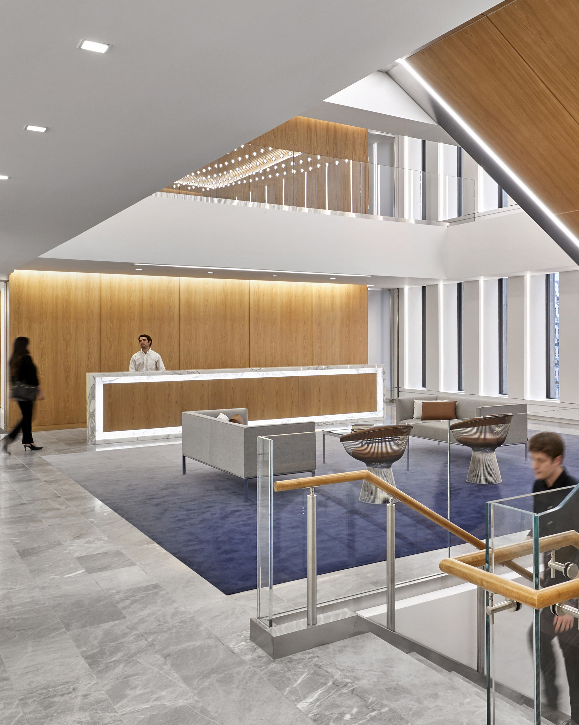 翻修工程的第五至第六阶段打造了挑高两层的开阔接待区,引领访客进入顶尖配置的会议中心。该区域分两期建设,因客户始终需要保留半层会议空间。
