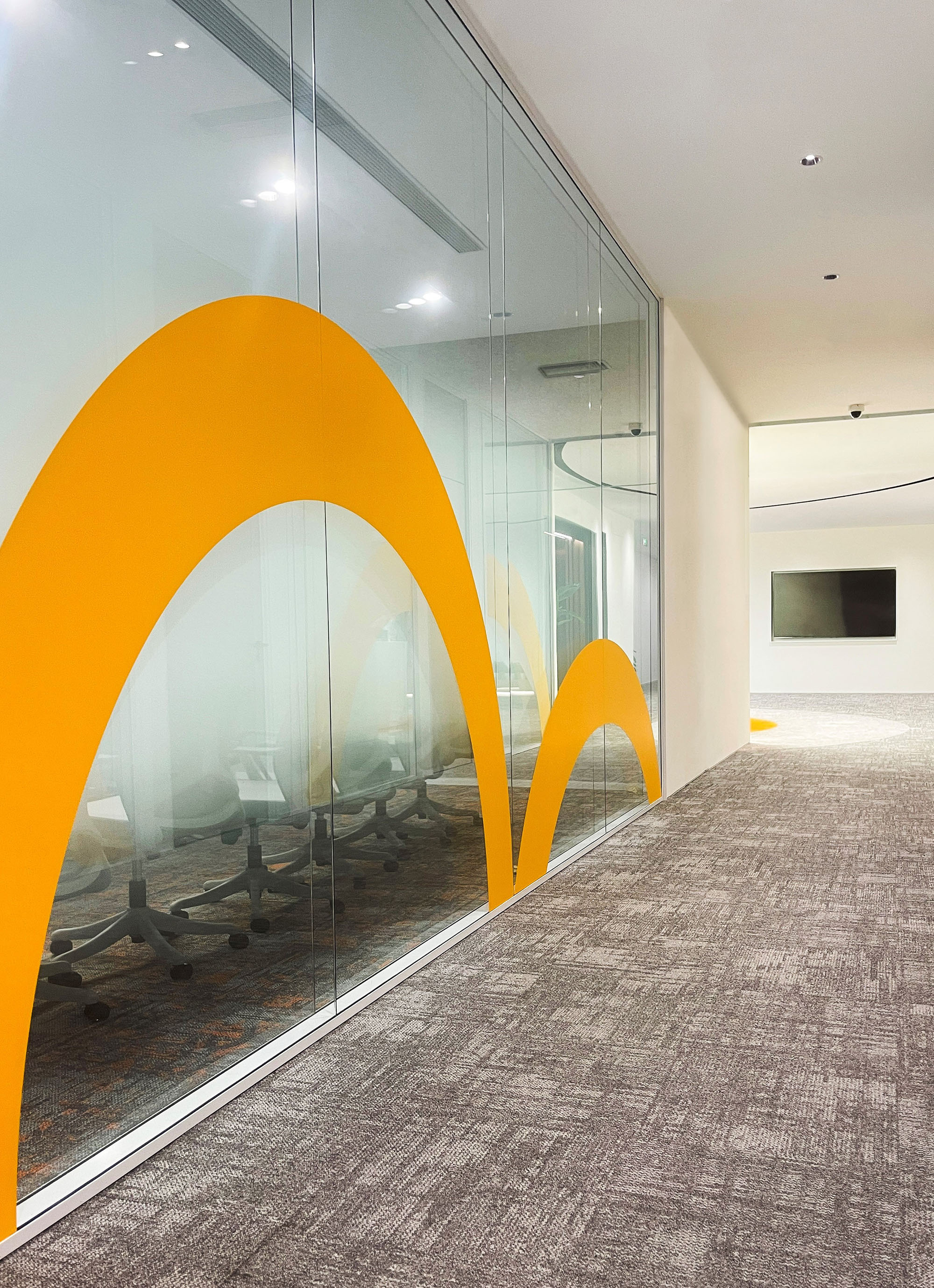 空间以简洁而富有张力的设计语言展现企业的属性。从入口Logo墙到配色与材质的细节,品牌调性在空间中无处不在。