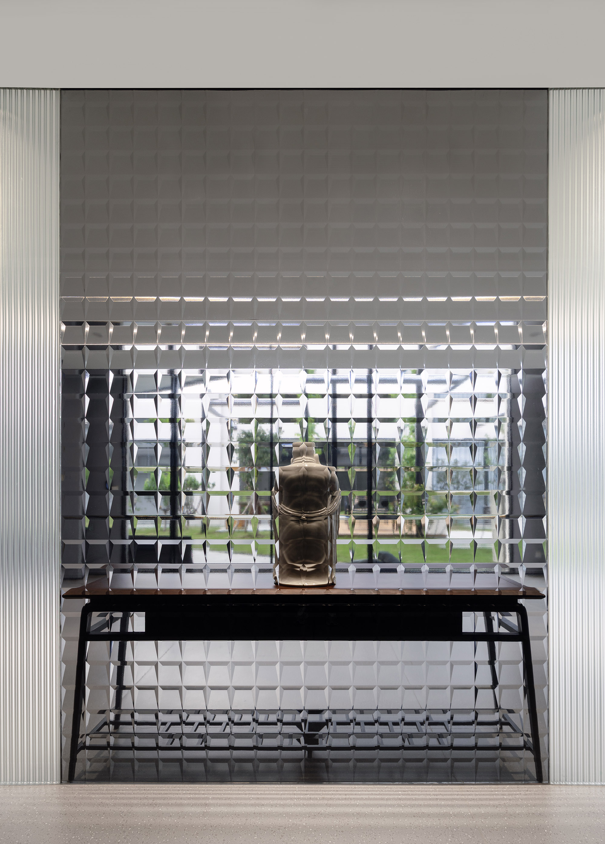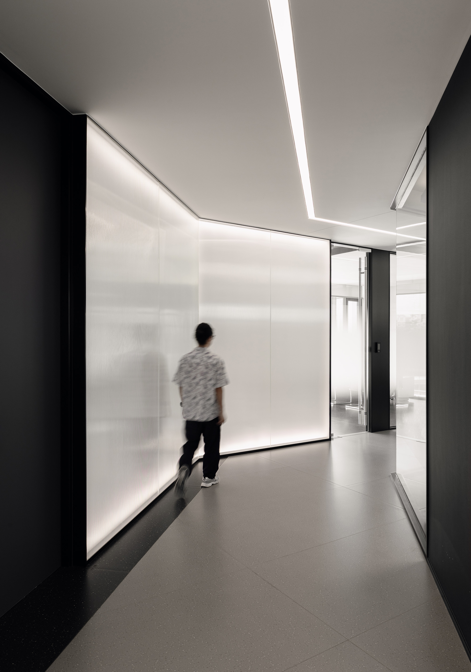 整个空间的线形流畅自如,如同纺织机上的丝线,清晰地勾勒出高效的工作动线。过道尽头的一处端景,则巧妙地成为空间叙事的“逗号”,在起承转合间,优雅地引导人们进入内部的办公区域。