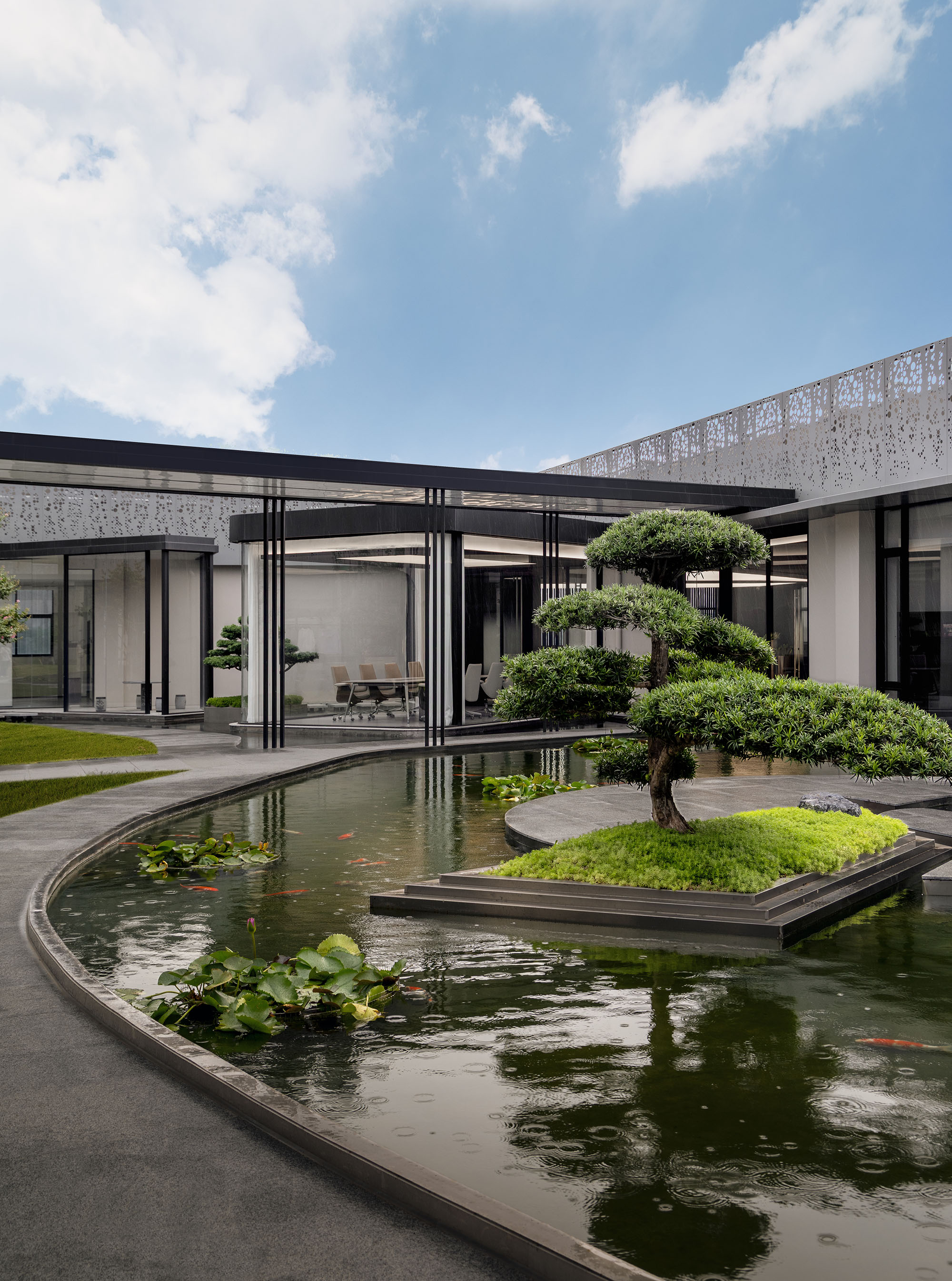 设计通过“赏花观鱼、曲径通幽”的布局,将自然景观引入办公空间。在这里,使用者可以暂时脱离紧张的工作节奏,感受花草的芬芳与流水的静谧,实现身心的放松。
