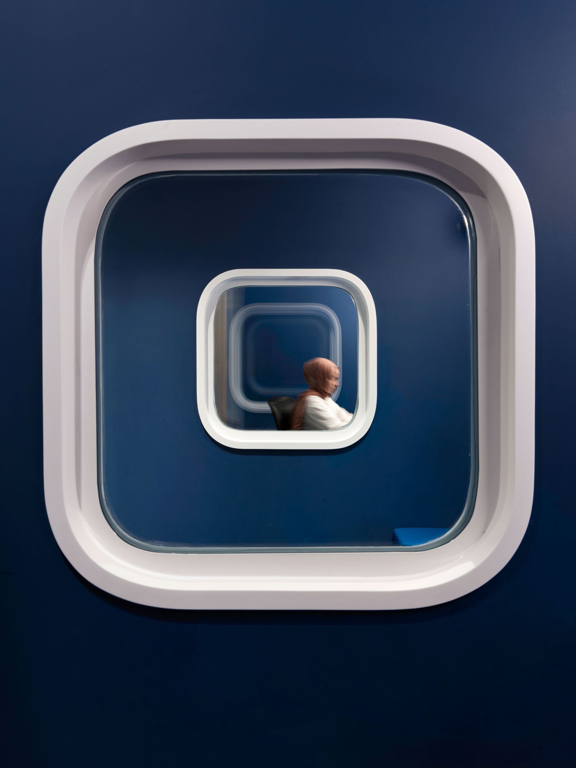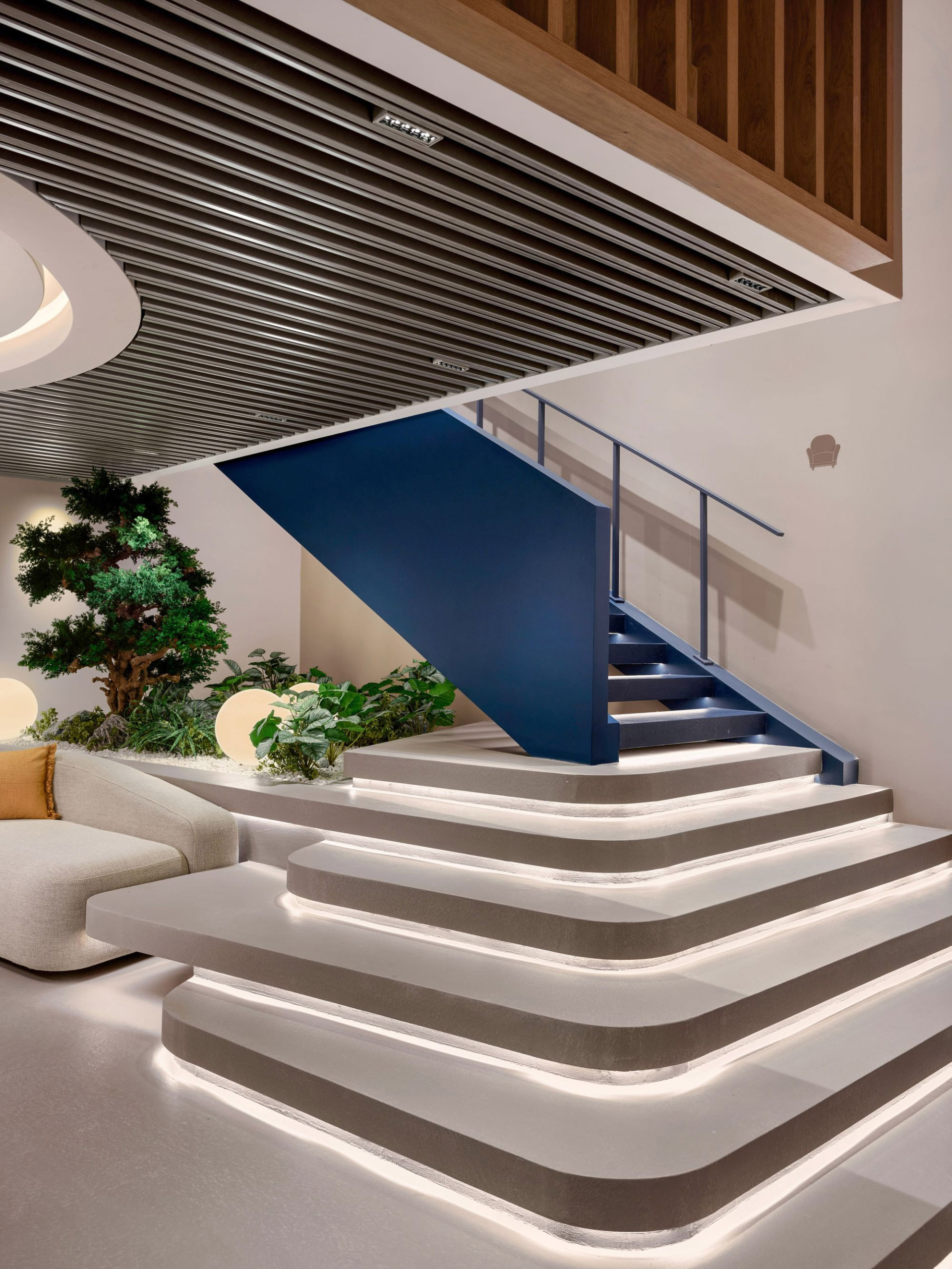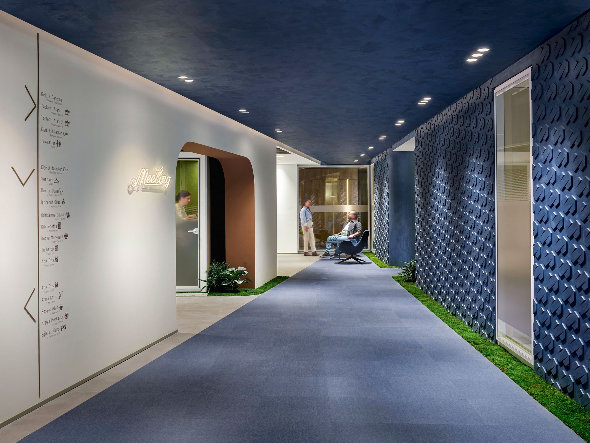 穿过入口大厅,一条象征伊斯坦布尔博斯普鲁斯海峡的蓝色走廊将空间划分为两个区域。这条走廊延伸至一处挑高空间,形成结合夹层的办公艺廊,随后衔接一座雕塑般的楼梯——其线条设计亦呼应海峡的流动韵律。