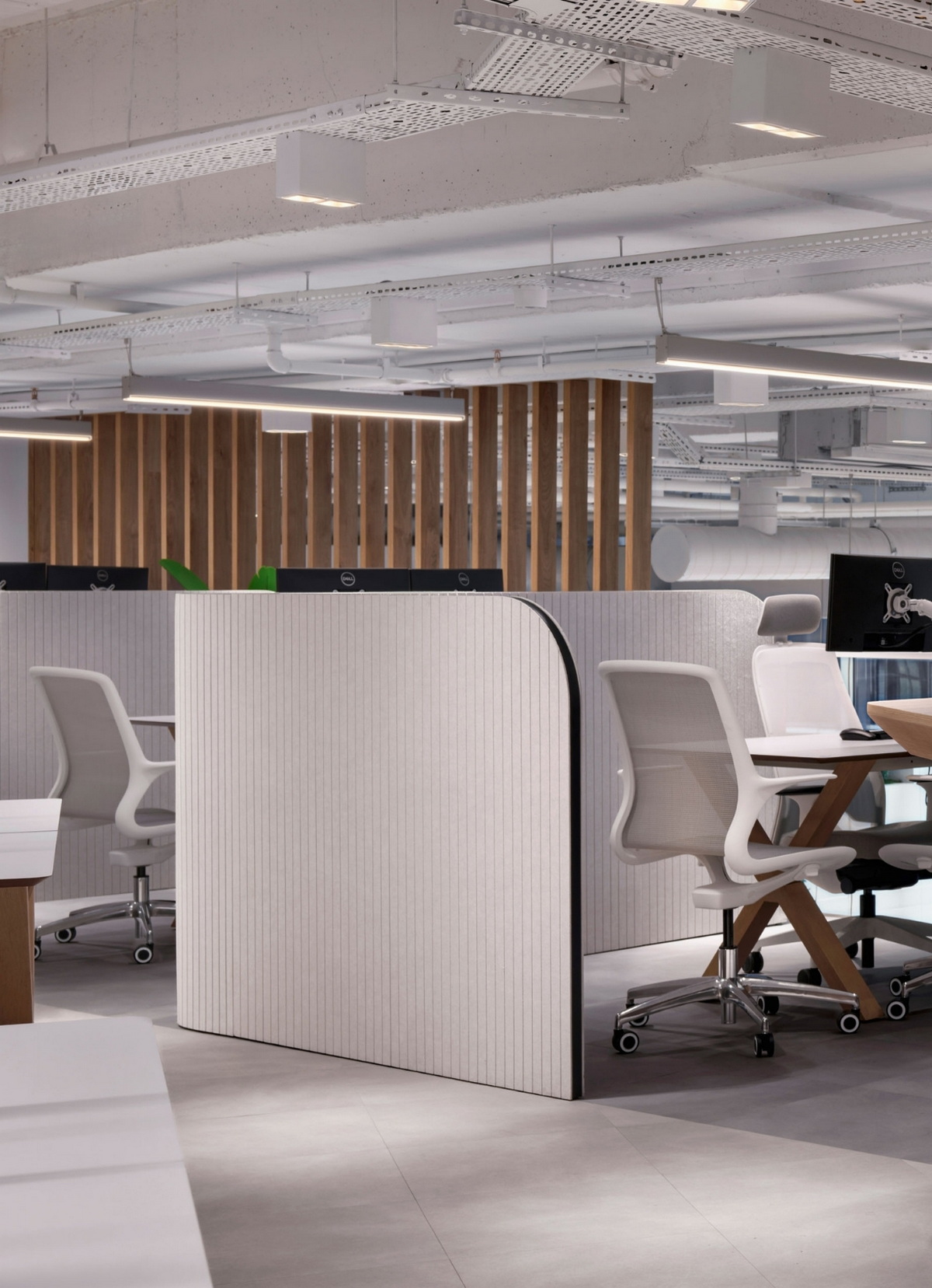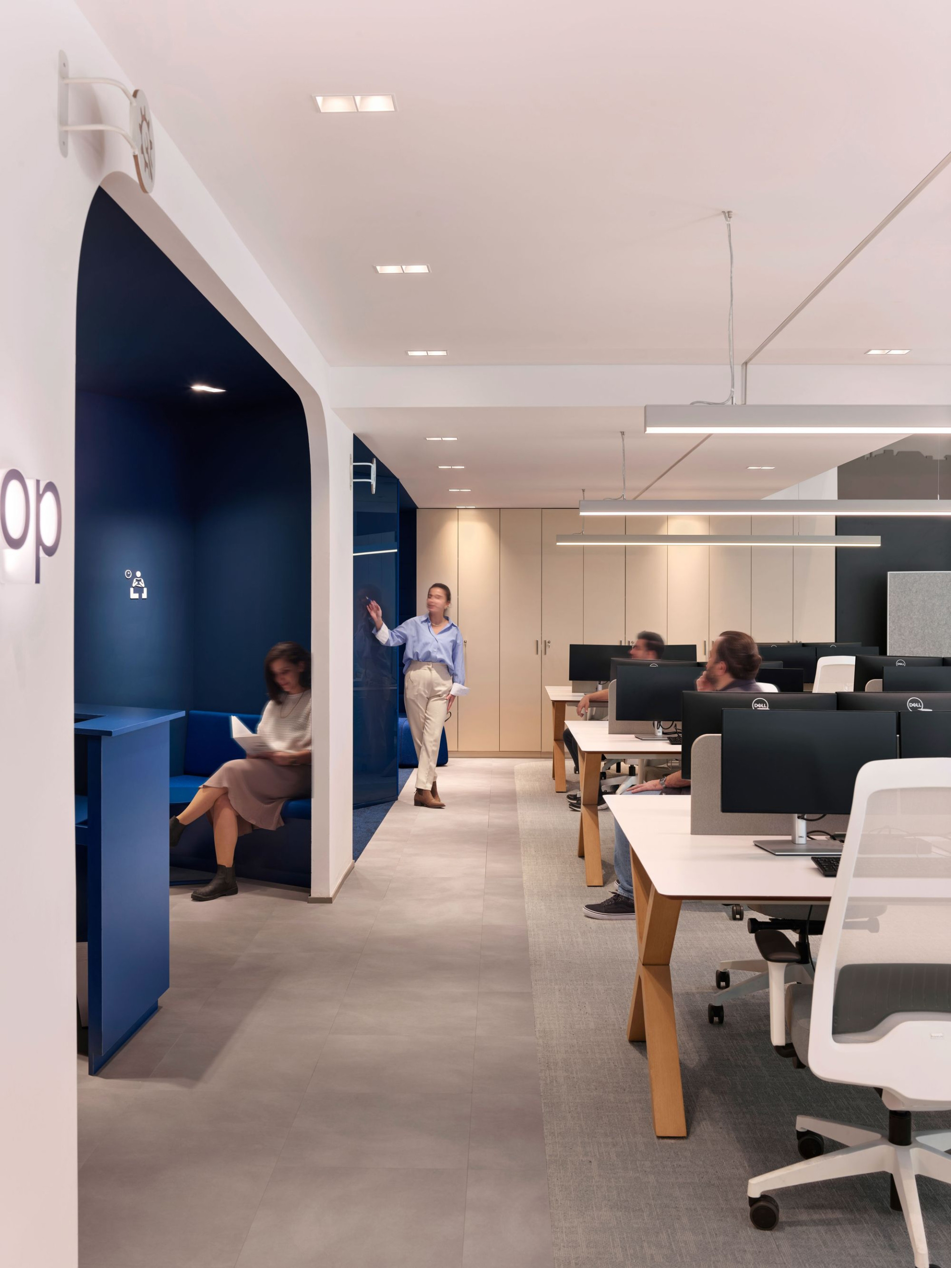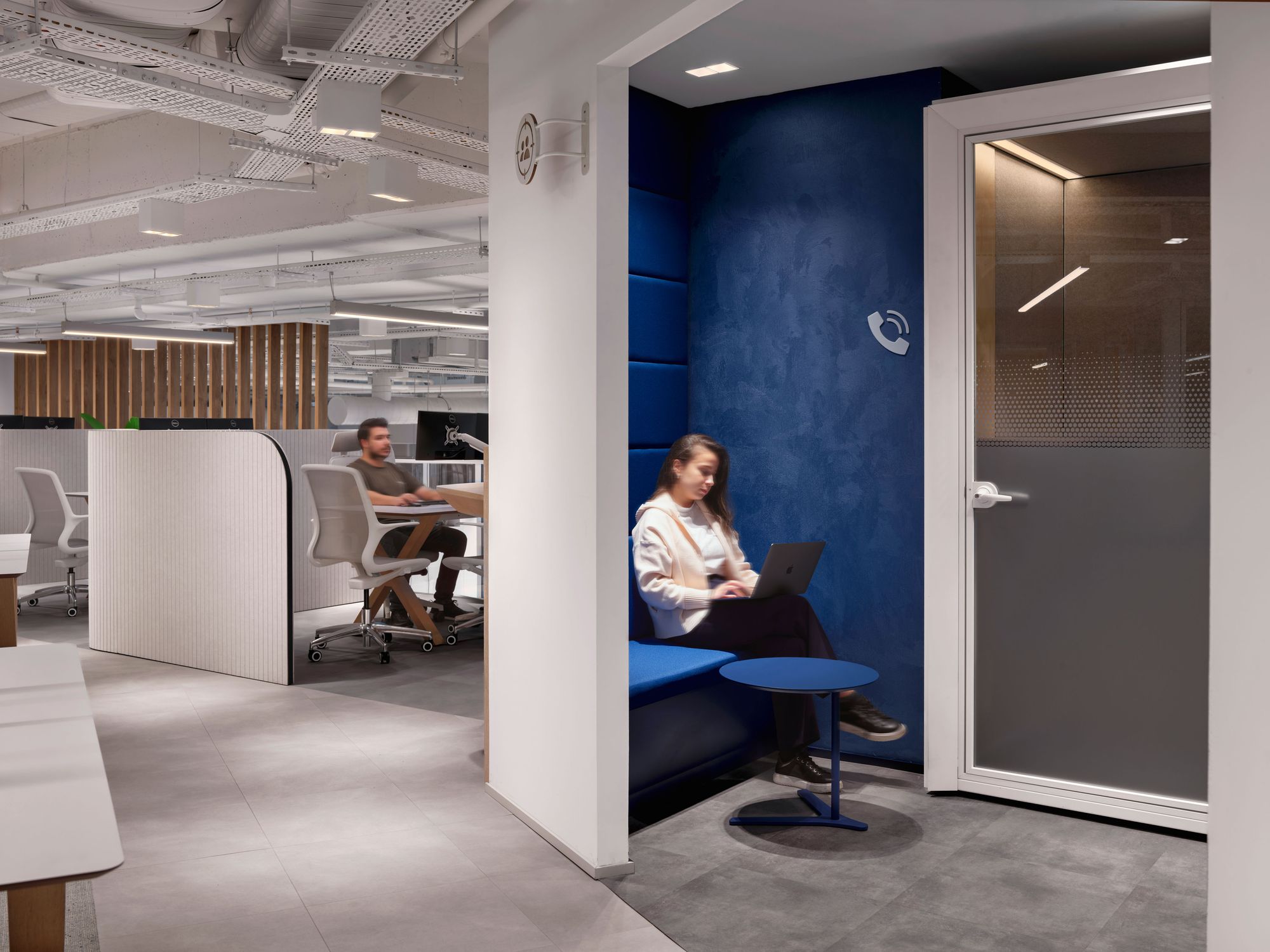 开放式会议区与灵活工位遍布整个办公空间,并配备不同等级的声学解决方案。置于工位之间的两节"电车"兼具专注办公桌和半开放小型会议区的功能。在满足客户核心需求后,所有剩余空间均被巧妙转化为灵活工位与小型洽谈区。