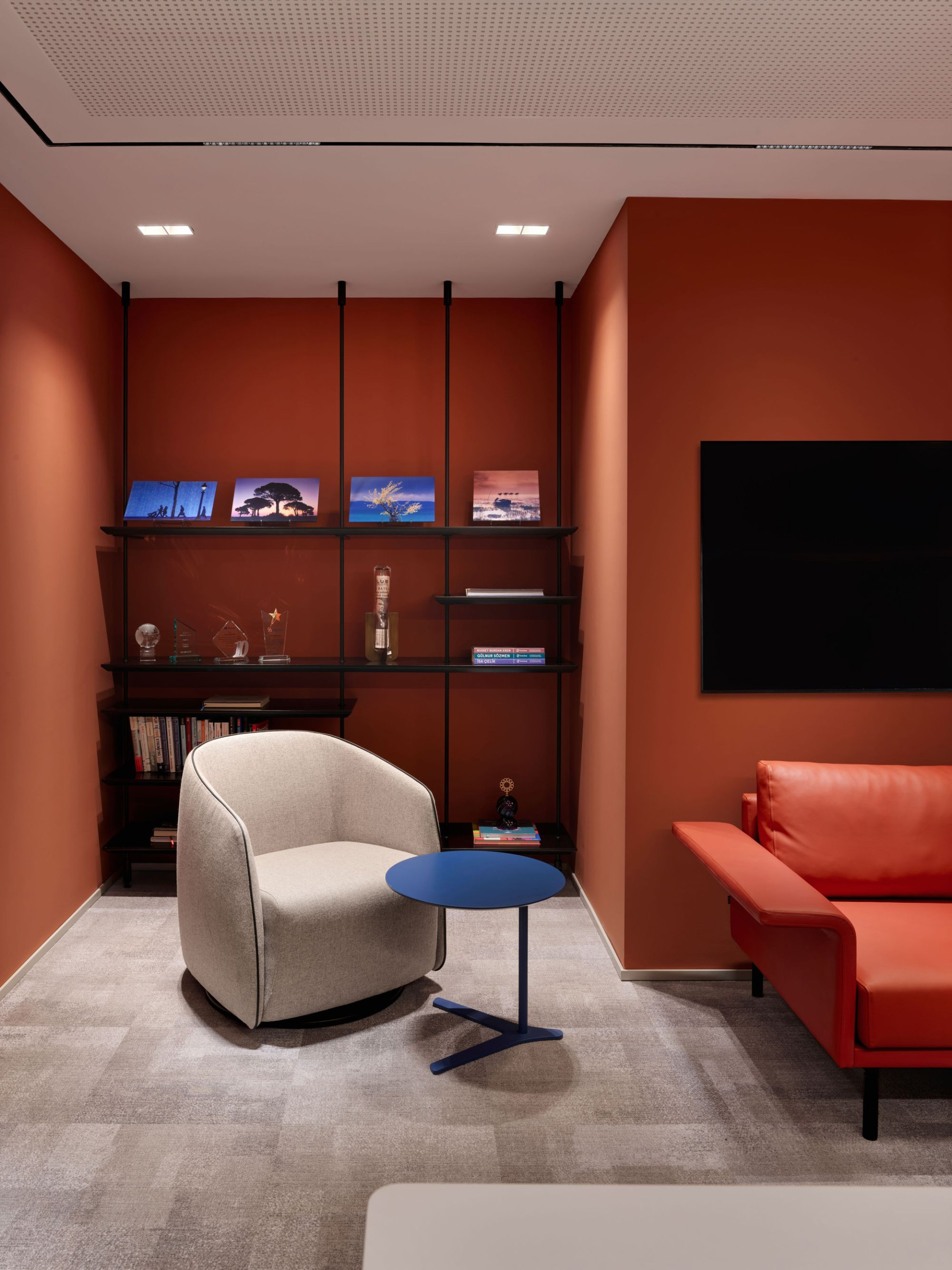 休息区承载着多重功能:它既是名副其实的休憩场所,也是灵活办公区、全体员工聚会的空间,更通过中间层如露台般的平台设计,形成连接夹层的过渡区域——人们可在此小聚、办公或享受高空视野。