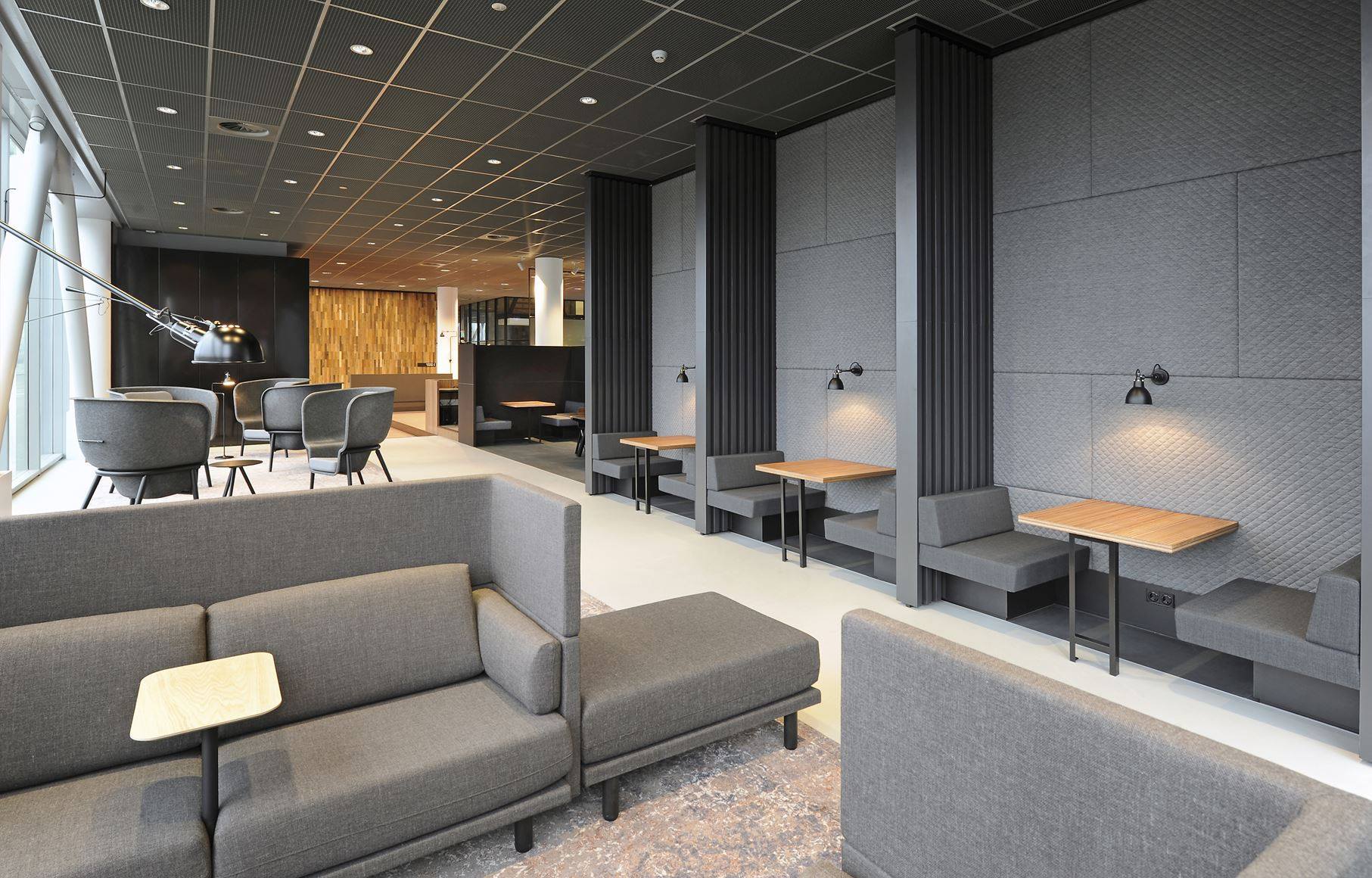休息区的设计灵感源自传统俱乐部与餐厅,最终呈现出商务氛围与酒店酒廊感的完美融合。舒适的长椅巧妙平衡了正式与非正式的会议空间,凸显了这一设计理念。