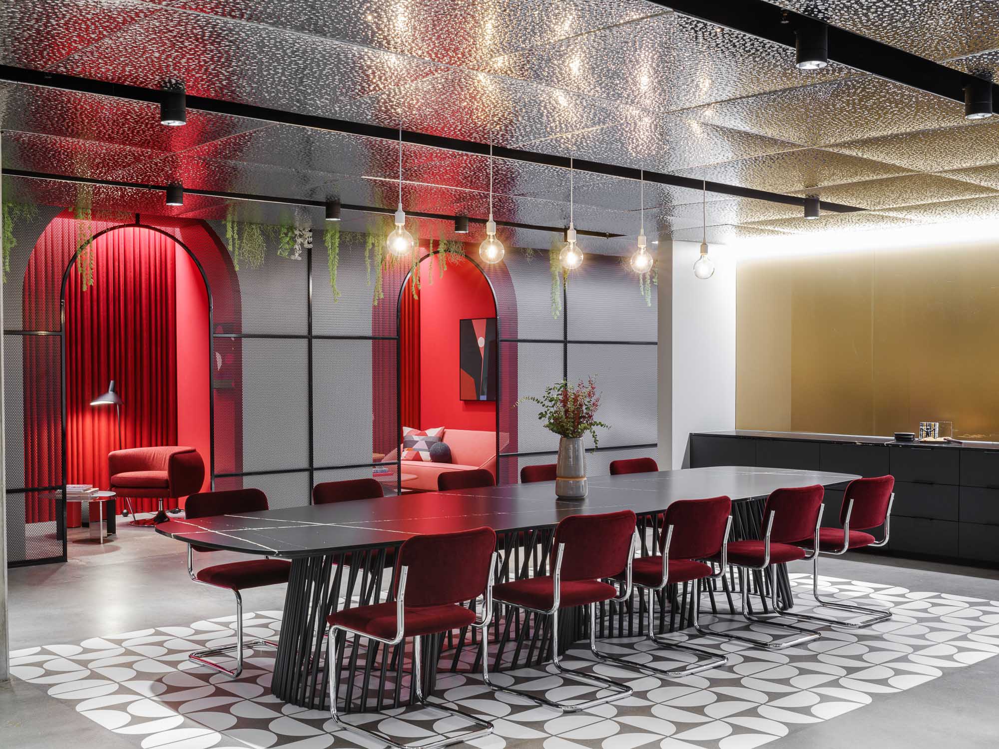 具体而言,天花板设计的目标是打造一个能界定空间的核心元素——它需要在我们期望的开放式灵活社交区域中形成视觉焦点。材料的高反射特性与独特纹理为空间注入了动态韵律与戏剧张力,使光线在其表面流转生辉。