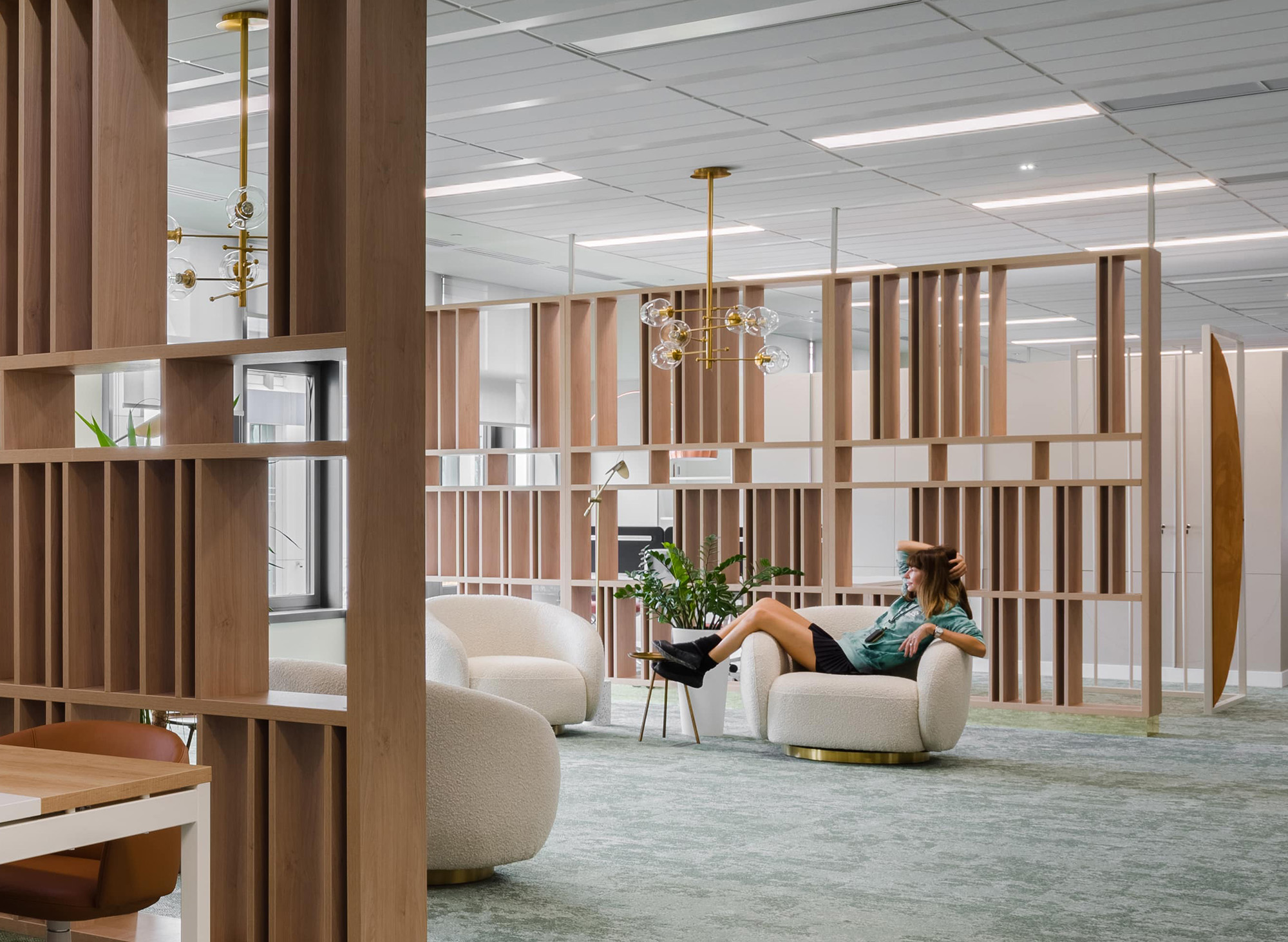 整个办公区域错落分布着休闲座位区,这些区域既为员工提供了转换视觉焦点的机会,也能让他们获得片刻精神休憩,从而使工作体验更显轻松自在。