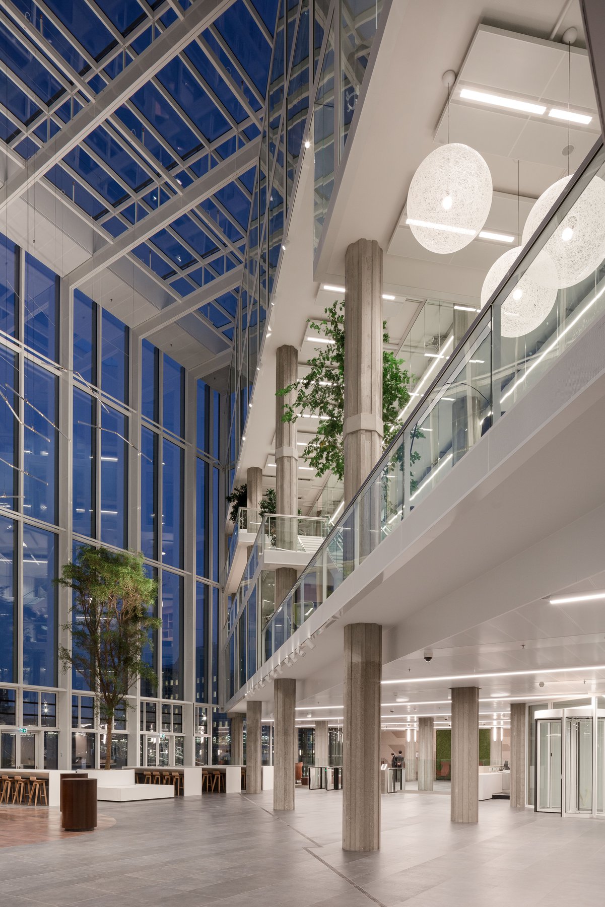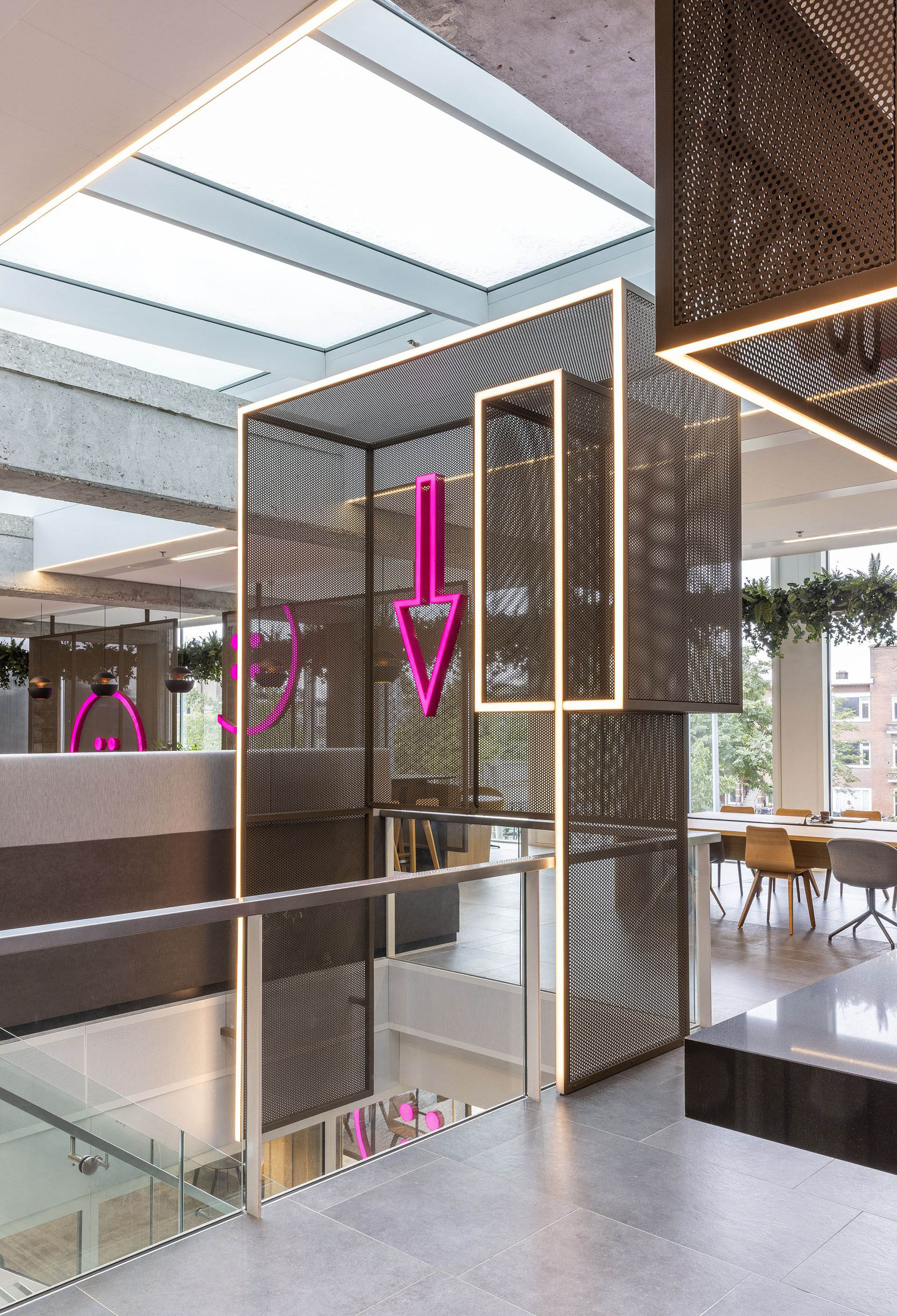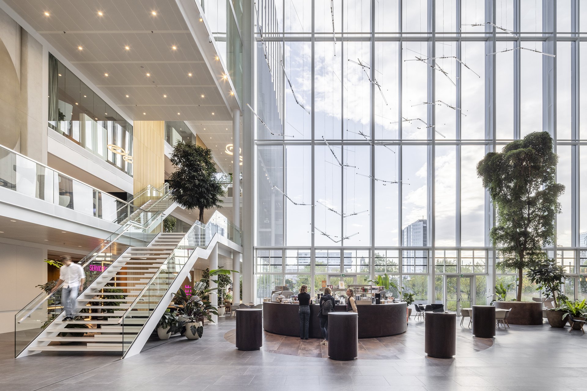 树木与绿植融入设计中,将自然生机引入室内,而城市地标景观则成为空间导向的视觉锚点。会议中心内,围绕挑空区域与楼梯设置了开放式交流区,可容纳多达300人在会晤前后自由交流和联络。办公区的各个锚点设计,呼应着不同使用者的身份特征。设计深化工作甚至延伸至图形化导视系统的构建。Studio Drift艺术工作室为中庭咖啡吧上方的装置创作了令人着迷的独特设计。