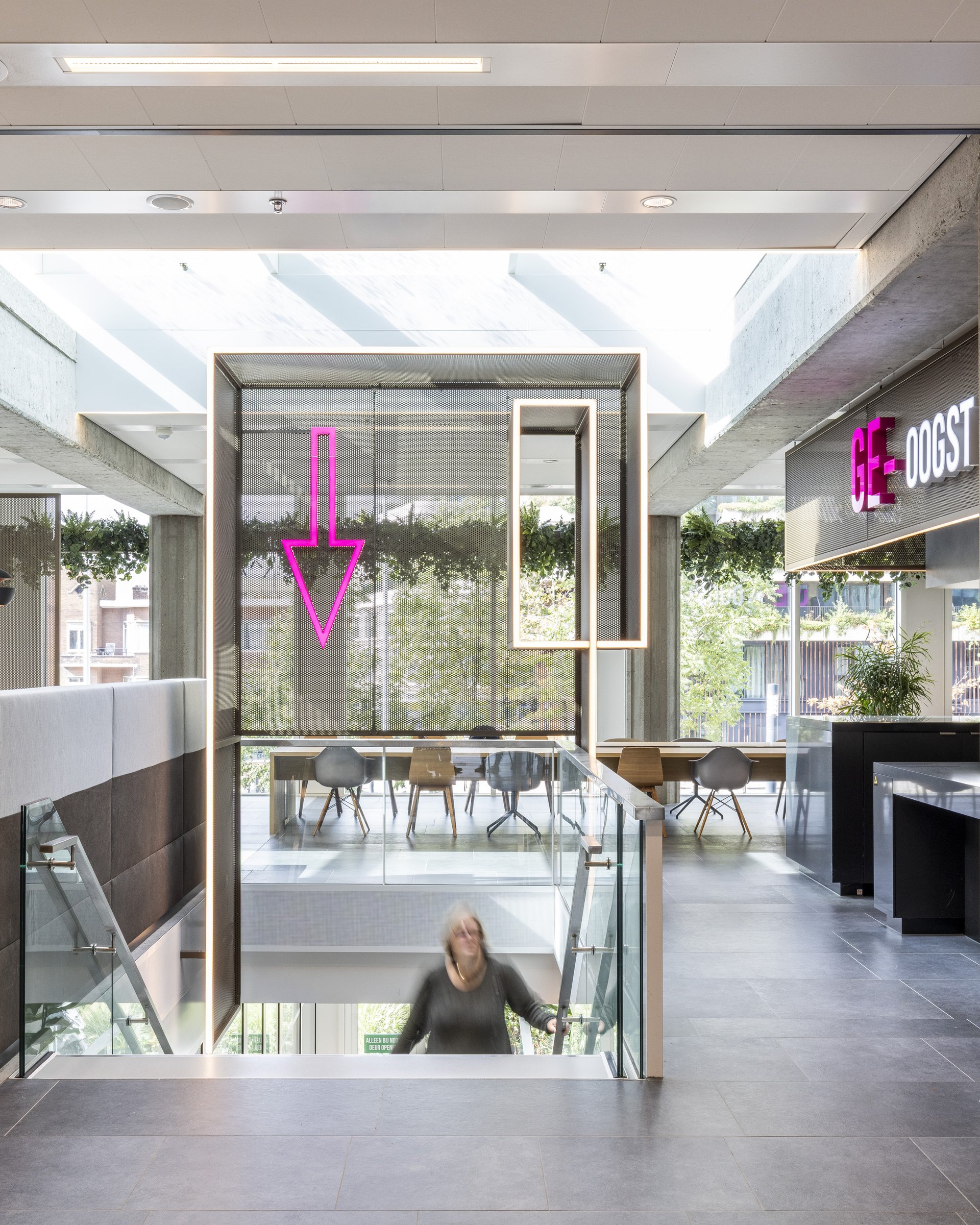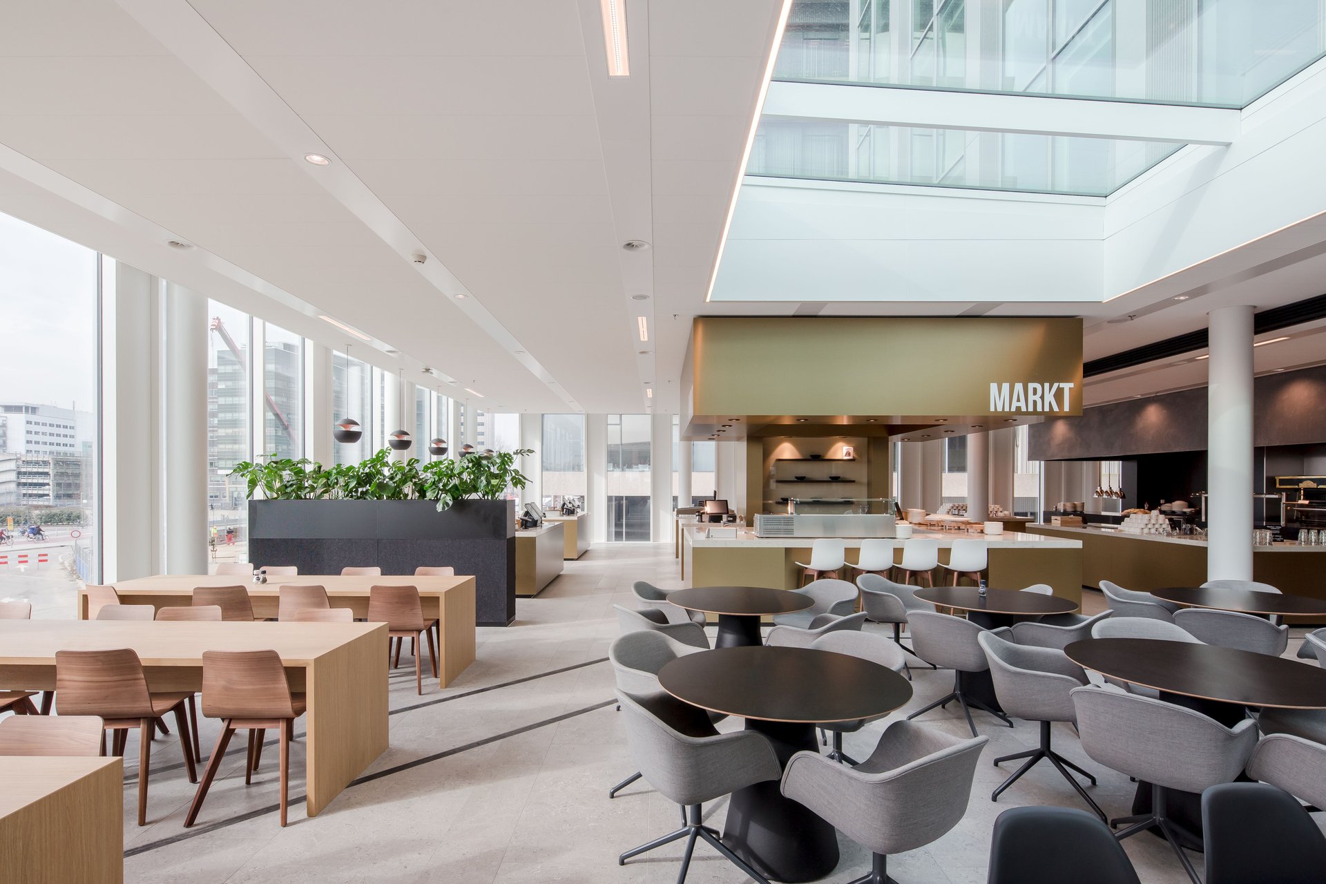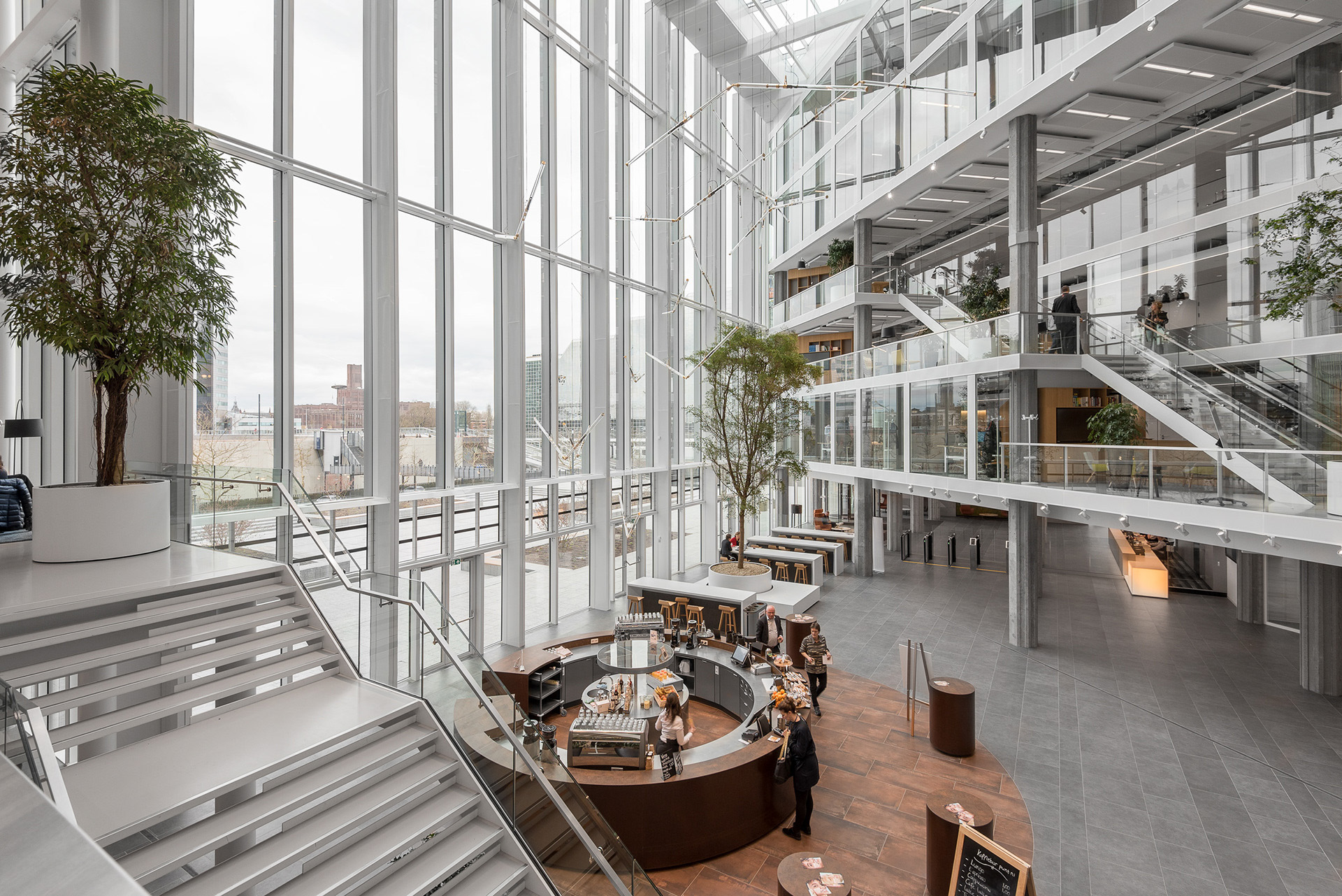 树木与绿植融入设计中,将自然生机引入室内,而城市地标景观则成为空间导向的视觉锚点。会议中心内,围绕挑空区域与楼梯设置了开放式交流区,可容纳多达300人在会晤前后自由交流和联络。办公区的各个锚点设计,呼应着不同使用者的身份特征。设计深化工作甚至延伸至图形化导视系统的构建。Studio Drift艺术工作室为中庭咖啡吧上方的装置创作了令人着迷的独特设计。