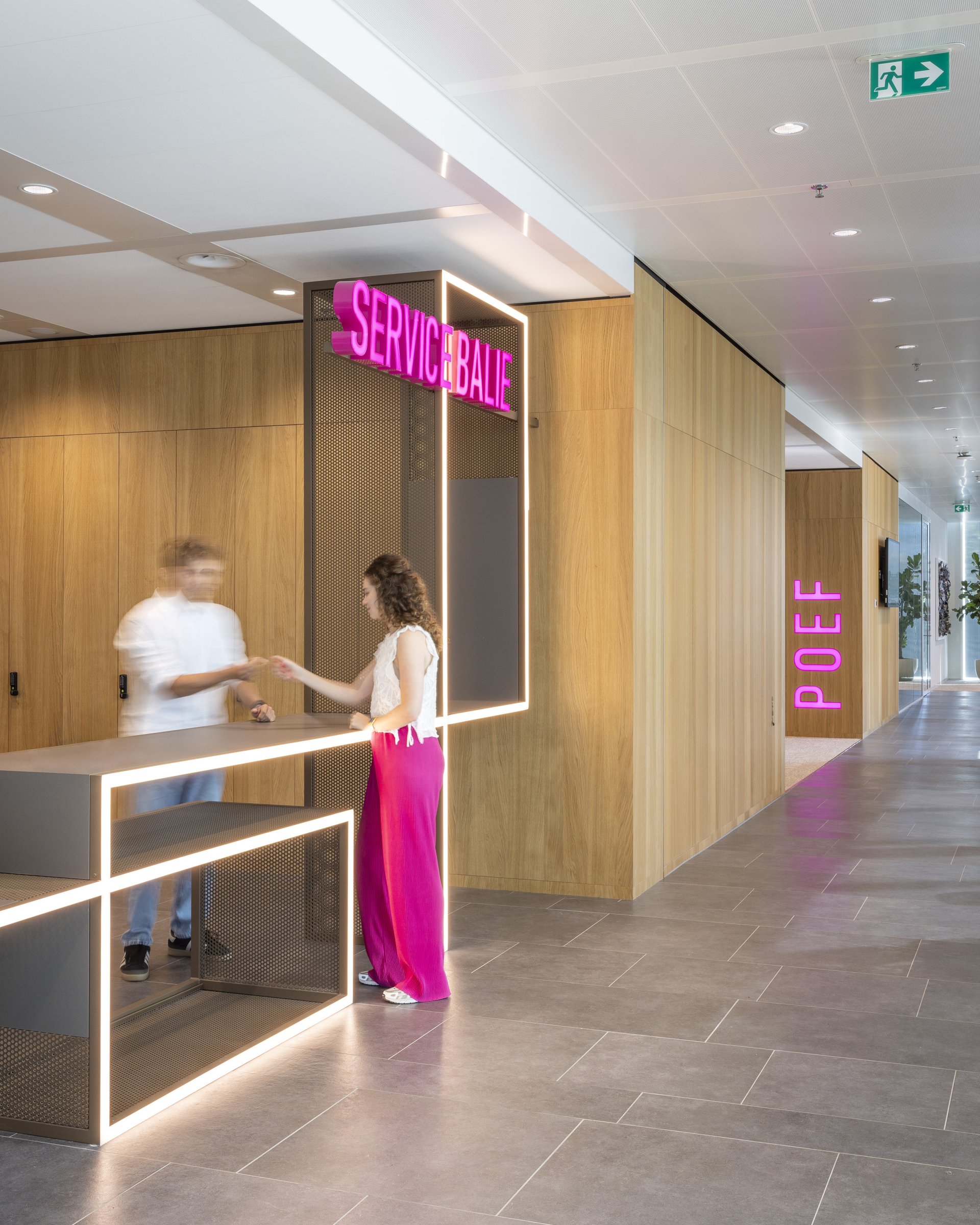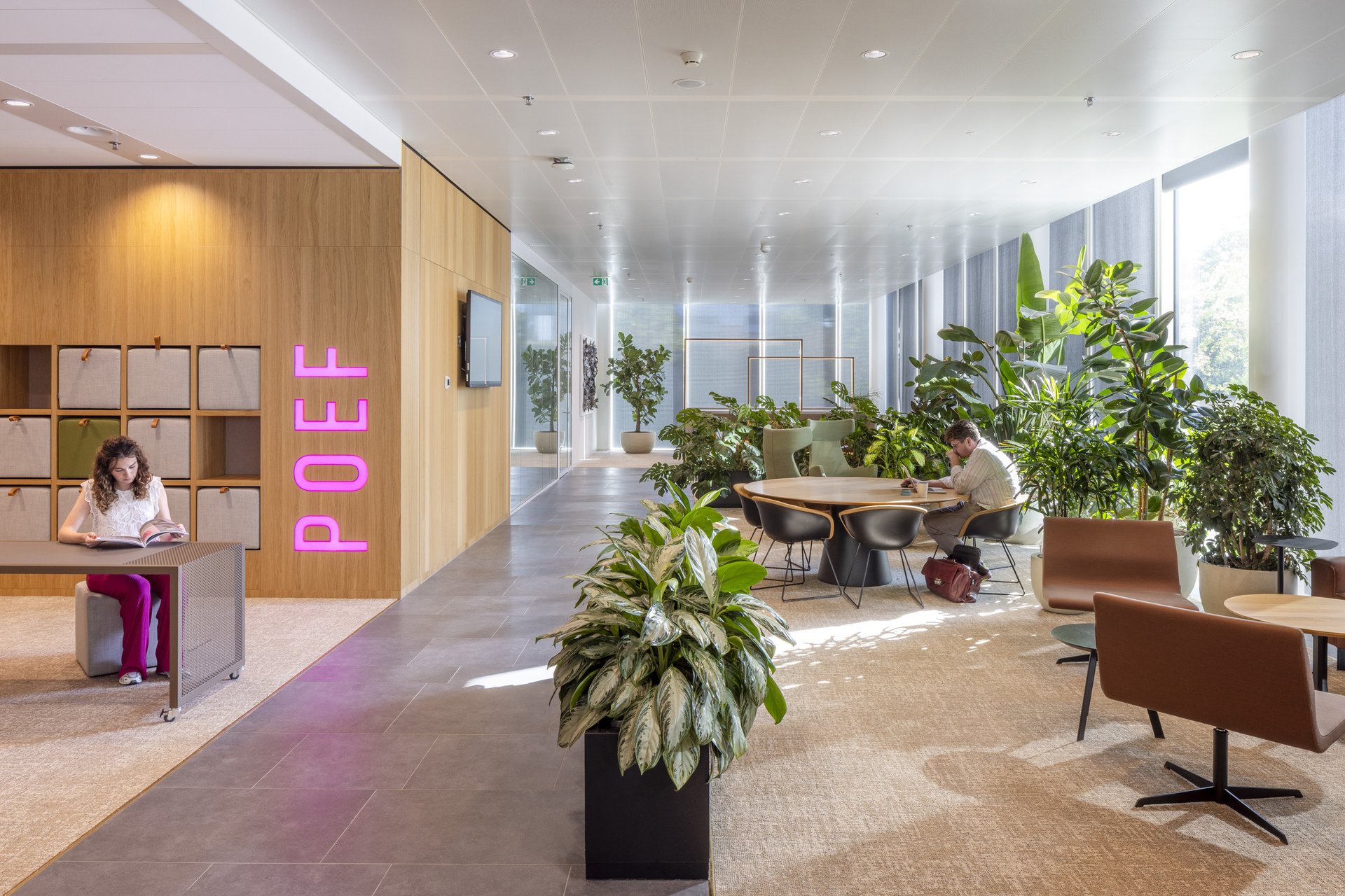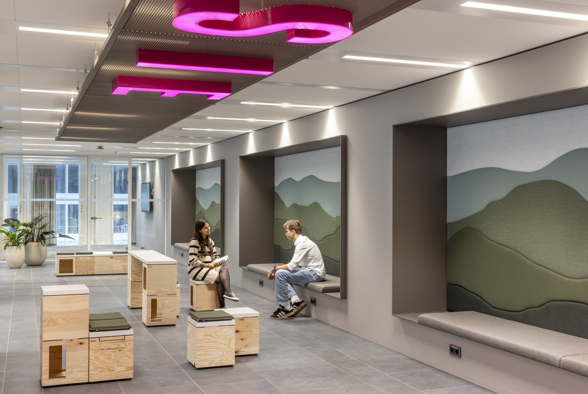 粉色是活力的象征。它指引方向,激发流动,点燃协作。从金属编织的标志性吧台,到以再生纽扣装饰的餐桌,设计在曲线与直线间游走,通过光影与材质浑然相连。活力,在软椅POEF、脉搏PULSE与激情PASSION中跃动——这三个以粉色霓虹点亮空间的词汇,象征着流动、能量与表达。可移动的座椅鼓励对空间的动态使用,而形态与色彩则为整体注入了韵律感。亲生物设计为空间平添一份平衡与宁静:一面葱郁的绿植墙宣示着蓬勃生机,声学板则如山水画卷般舒展,赋予空间以自然纵深。