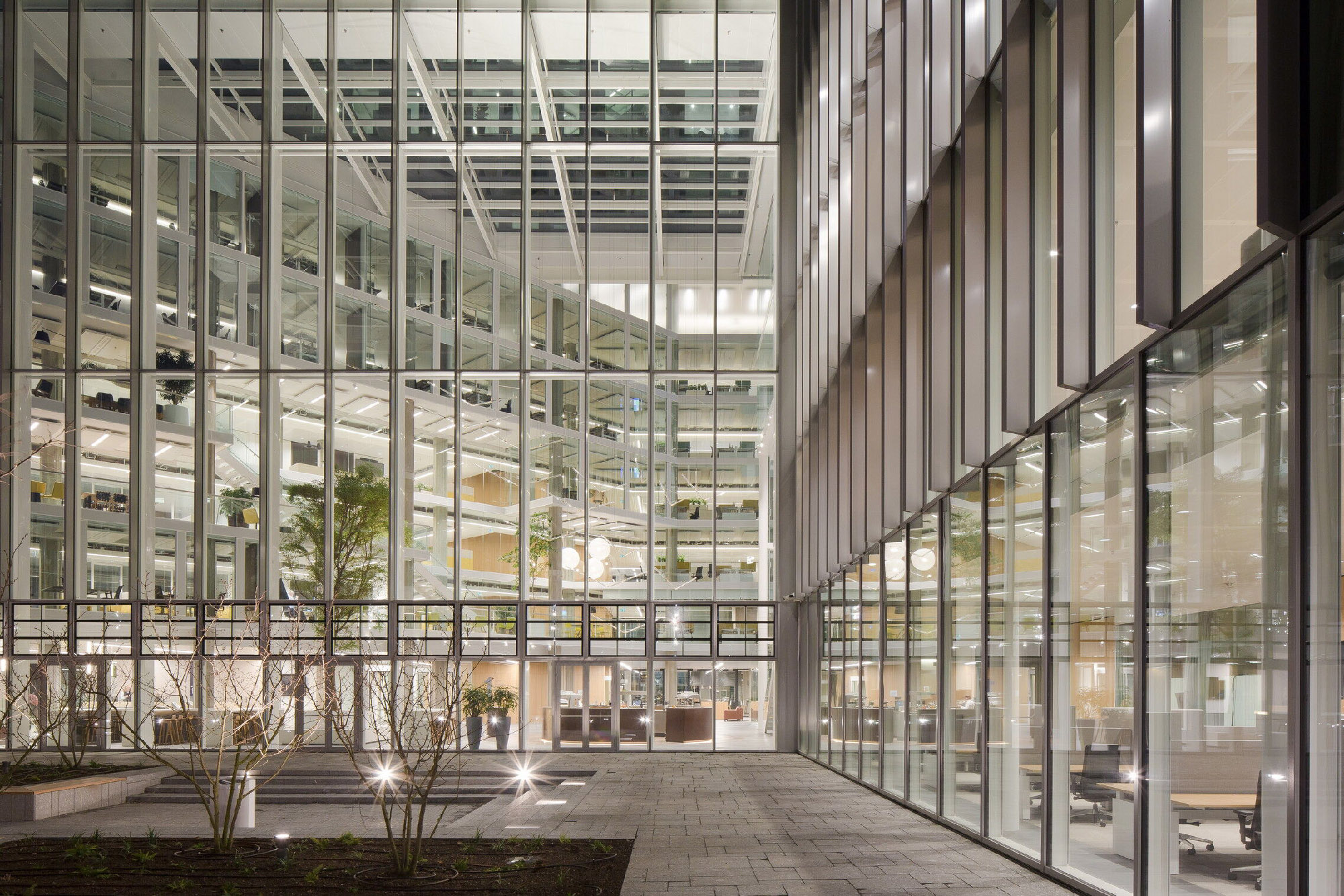 建筑自身的私密性与独特韵味,与日光充盈的中庭形成了巧妙的平衡——这座中庭将空间延伸至宽敞的新建区域。建筑群外立面焕然一新,与城市肌理紧密融合,既符合高标准安保要求,也为(未来)功能调整预留了充分弹性。