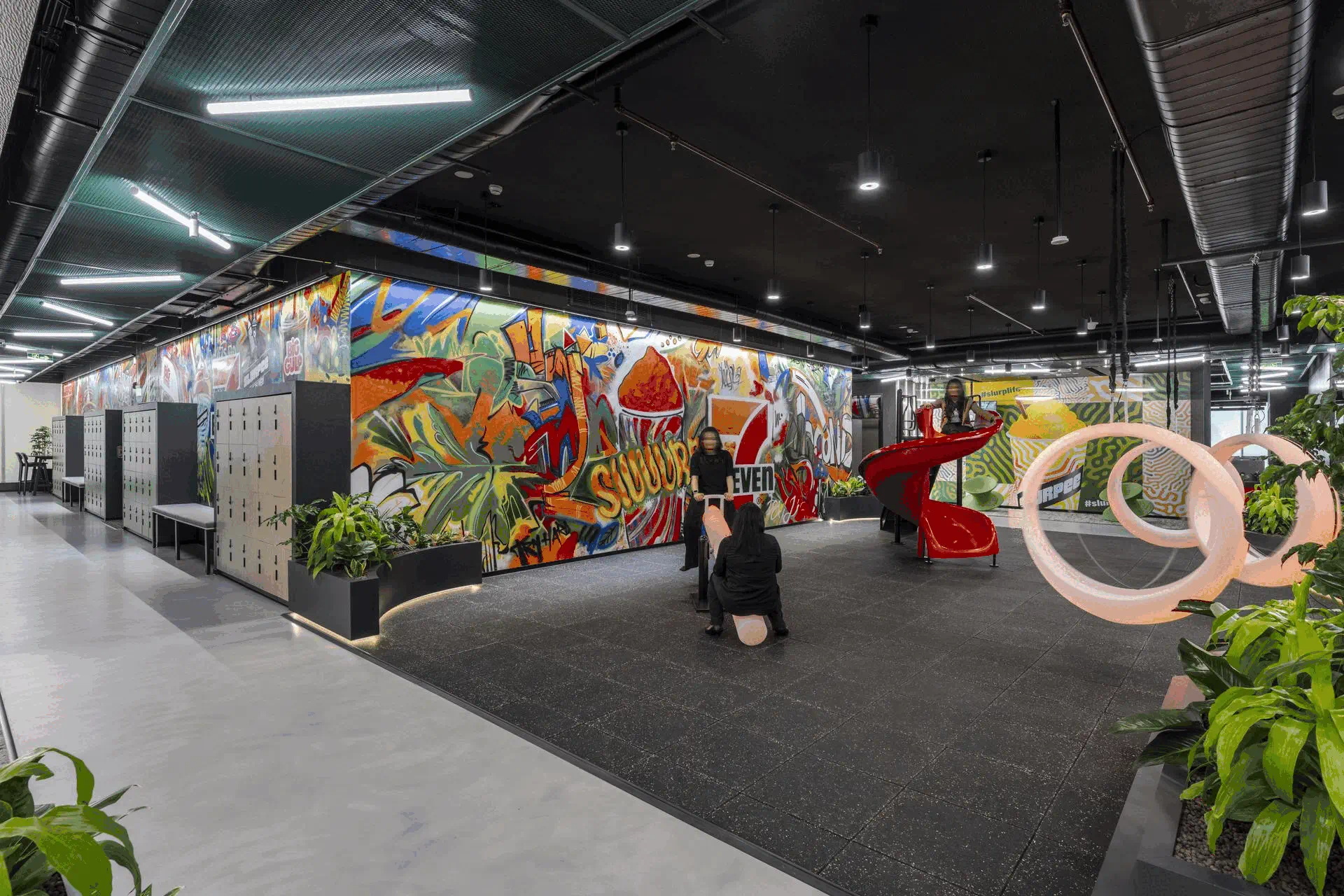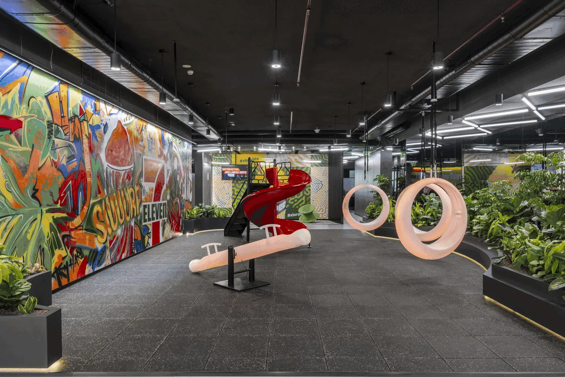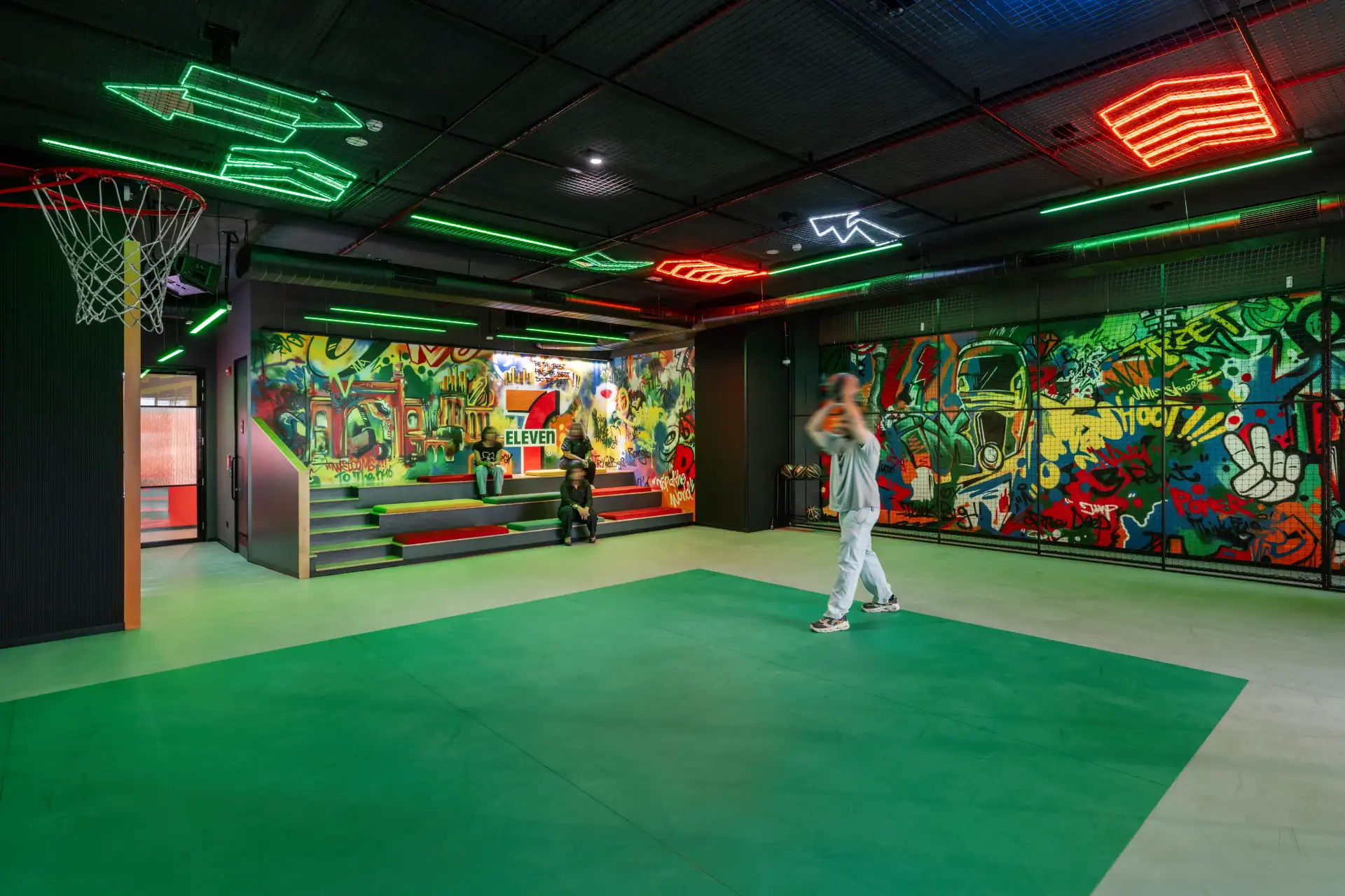 中央游乐区——一个融合滑梯、秋千与旋转座椅的活力绿洲——以充满巧思的灵动布局打破常规,有力诠释了7-Eleven对敏捷与愉悦的价值追求。空间体验在篮球场达到高潮:粗犷工业风与冲击性涂鸦艺术、动态照明在此激烈碰撞,生动诠释着“超越极限”的竞技精神。