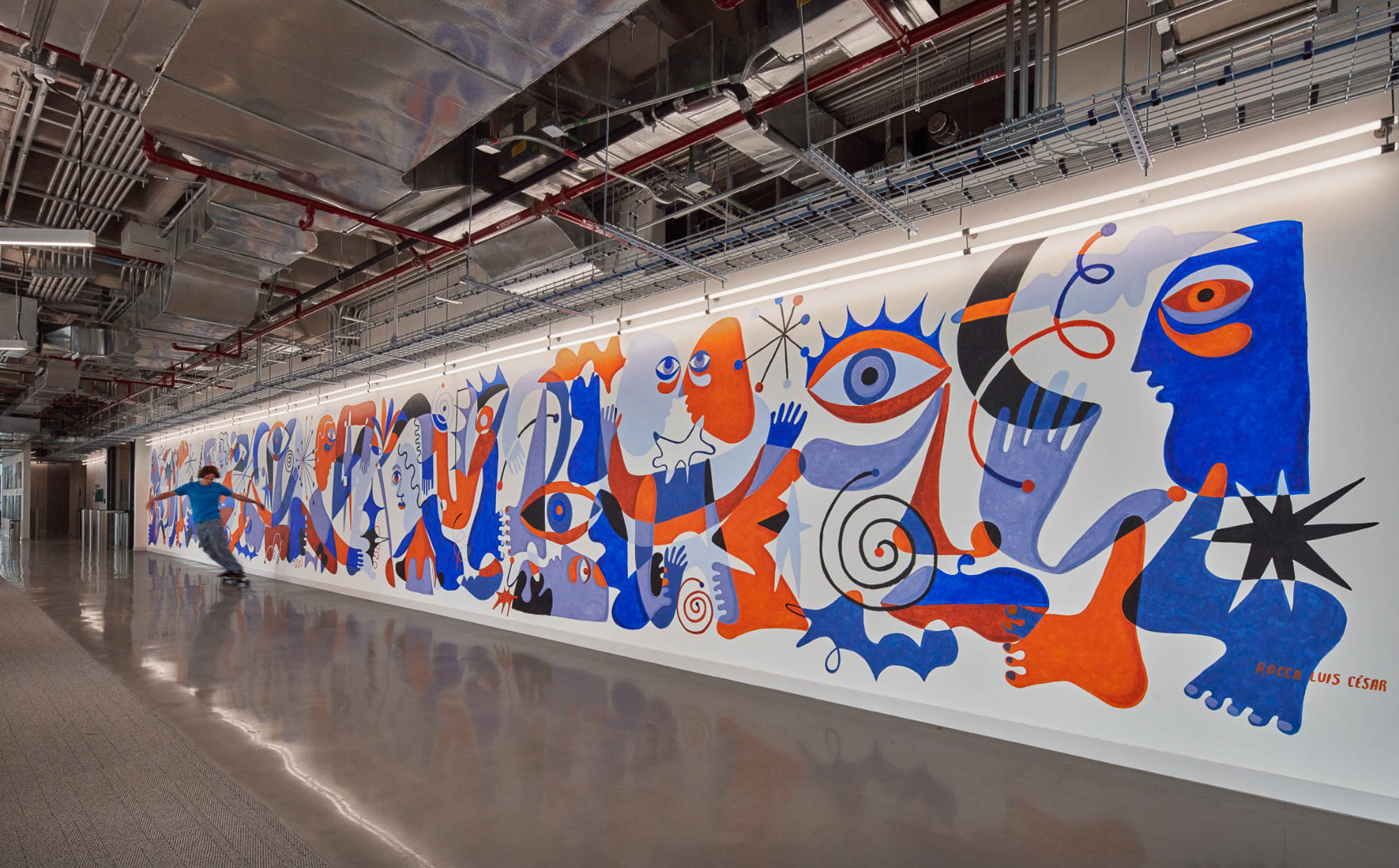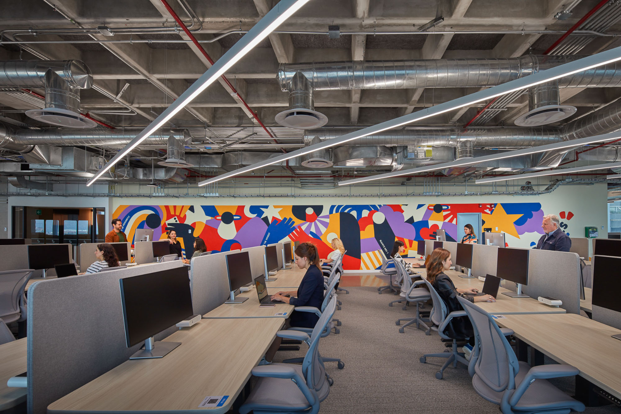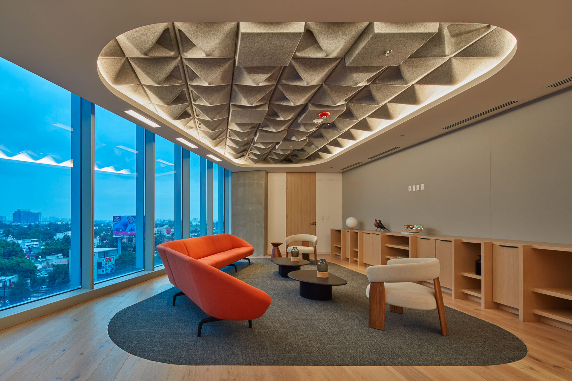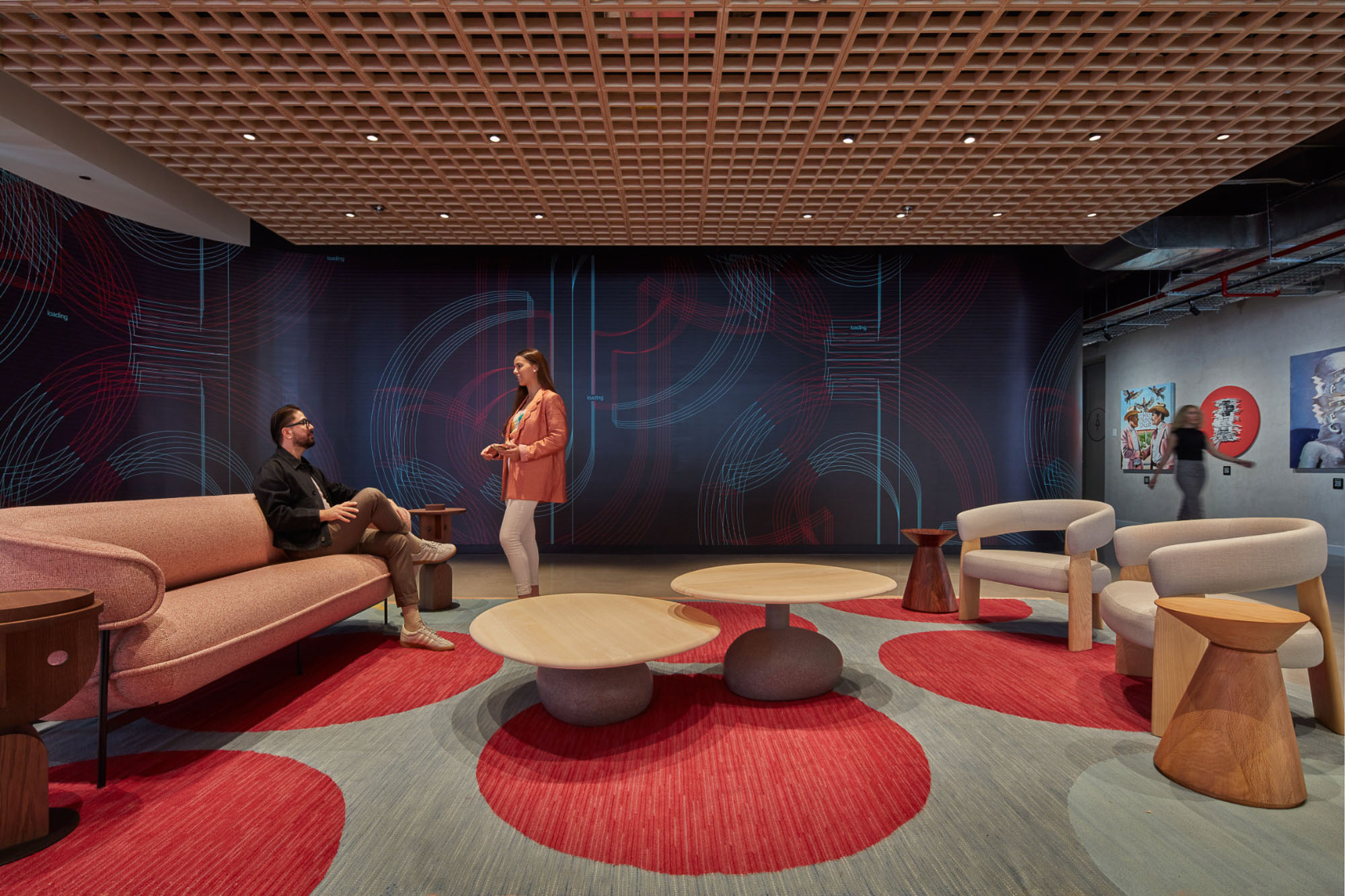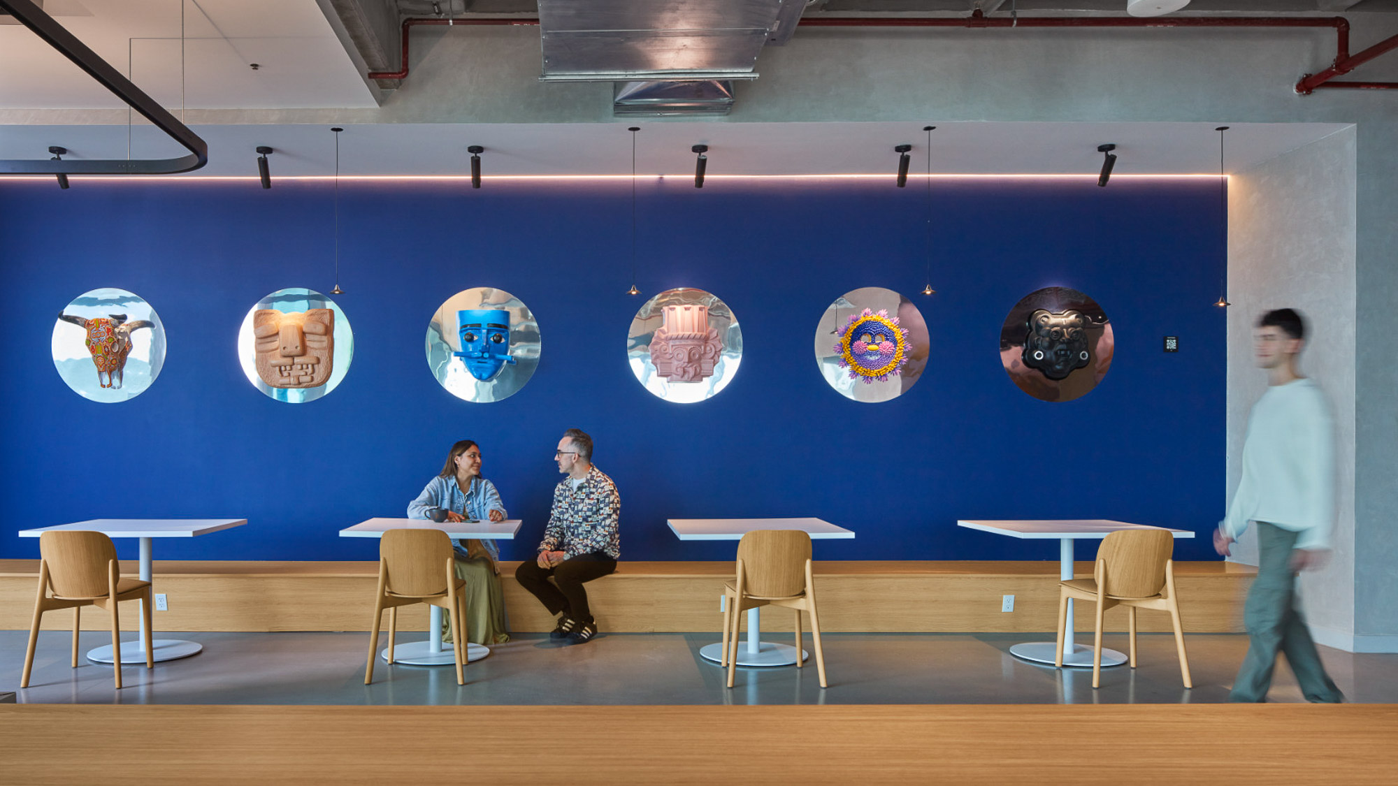 Gensler的设计灵感源自项目近旁的艺术画廊。采用一条贯穿中央的环形动线重构办公空间,仿照画廊观展路径营造沉浸体验。墨西哥城本地艺术家创作了壁画、纺织艺术品与画作,彰显当代艺术界的本真风貌。本地产的火山石与瓷砖等可持续材料的运用贯彻环保理念,裸露天花设计既减少耗材又增添工业质感。受TikTok移动交互启发,空间布局融入流线形态、曲面墙体及灵活工作区,持续激发协作与创新活力。