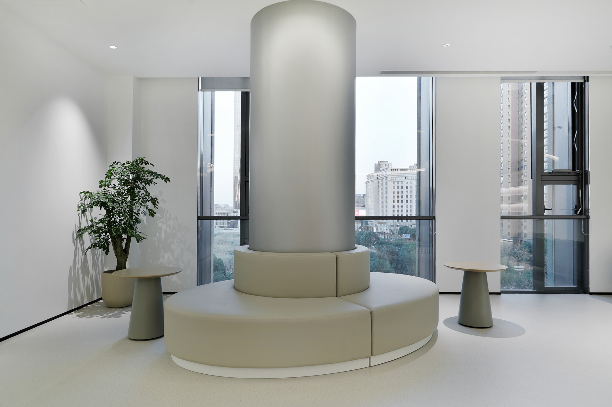 接待台的造型以流畅曲线勾勒视觉焦点,木纹格栅巧妙的隐藏了原有大楼的消防立柱的同时呼应主入口处设计语言,开阔的等候区域搭配舒适的座椅与简约绿植,让来访客户在严谨的科技氛围中感受到温暖与松弛,实现专业感与亲和力的完美平衡。