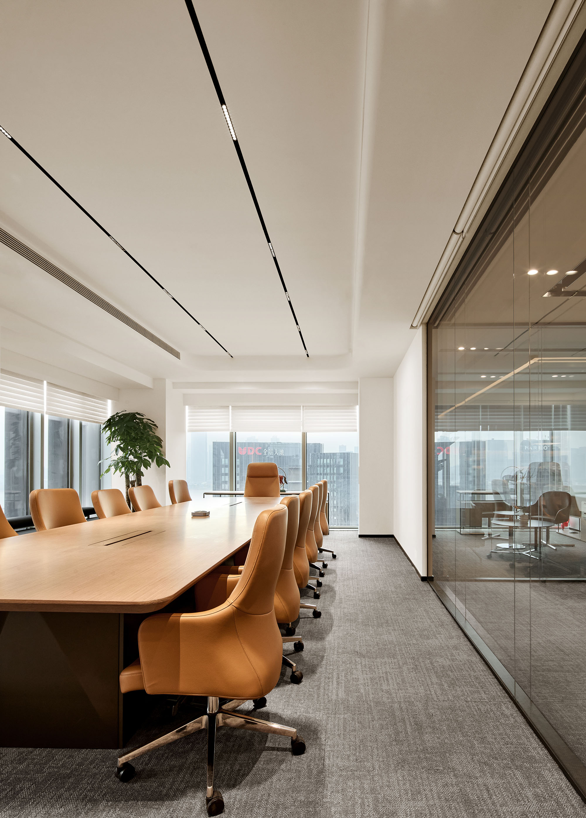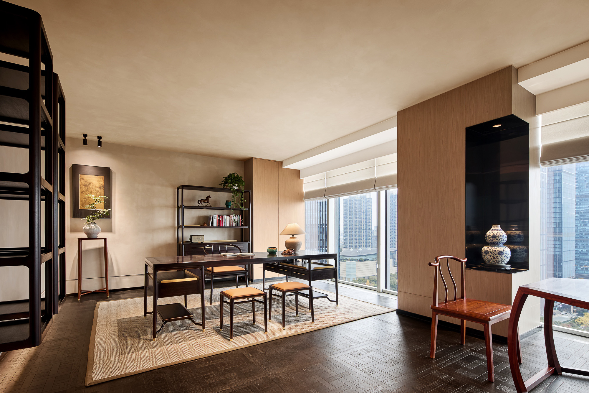 总裁室甄选实木家具,承载金融领域的深厚积淀;陈设瓷器藏品与编织地毯,勾勒隽永东方气韵。坚守“功能至上”设计内核,凭栏尽览杭州天际线,让都市繁华与室内古韵自然交融。于古今对话之间,尽显金融投资的沉稳远见与前瞻格局。