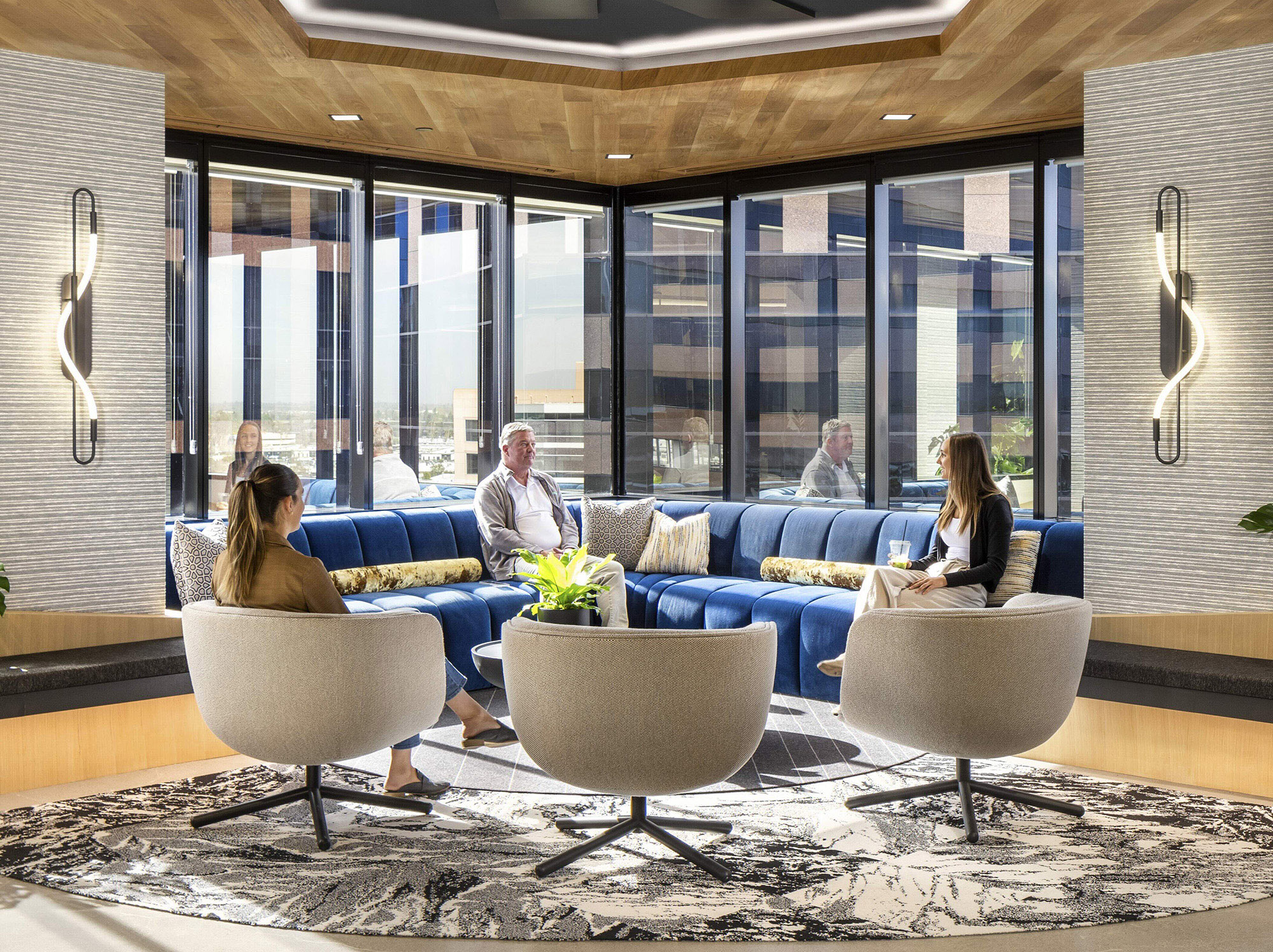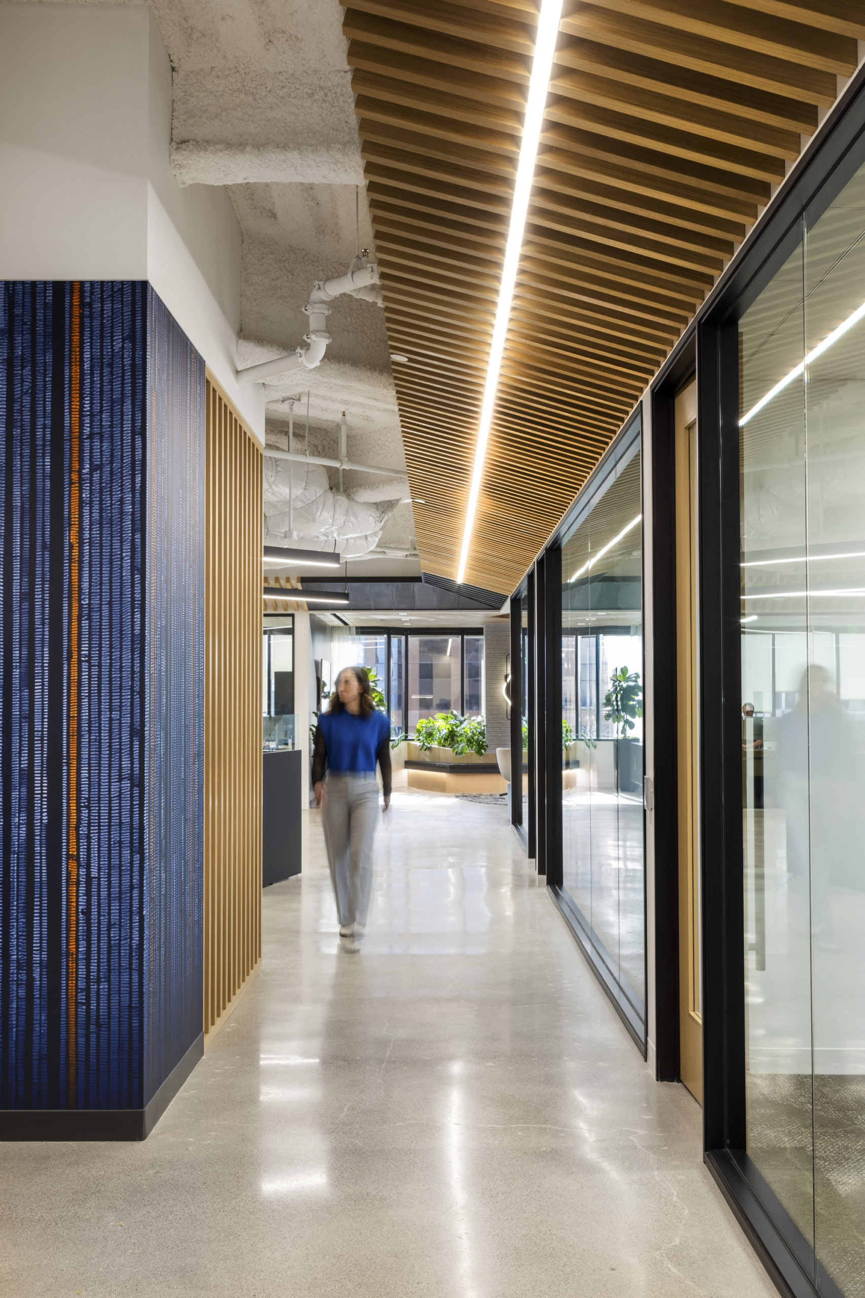 初步设计挑战之一在于优化平面布局,以充分展现开敞幕墙玻璃窗形成的恢弘视角,将周边景观与下方社区的壮丽景色尽收眼底。设计团队通过巧妙地将私人办公室和洽谈室沿办公区域外围布置,同时在中心区域保留宽敞的开放式办公区,成功解决了这一难题。该设计既满足了团队扩张的需求,又促进了员工在办公空间内的聚集与协作。设计团队勇于突破创意边界,将建筑元素无缝融入设计,不仅提升了办公空间的功能性,更强化了其美学表现力。