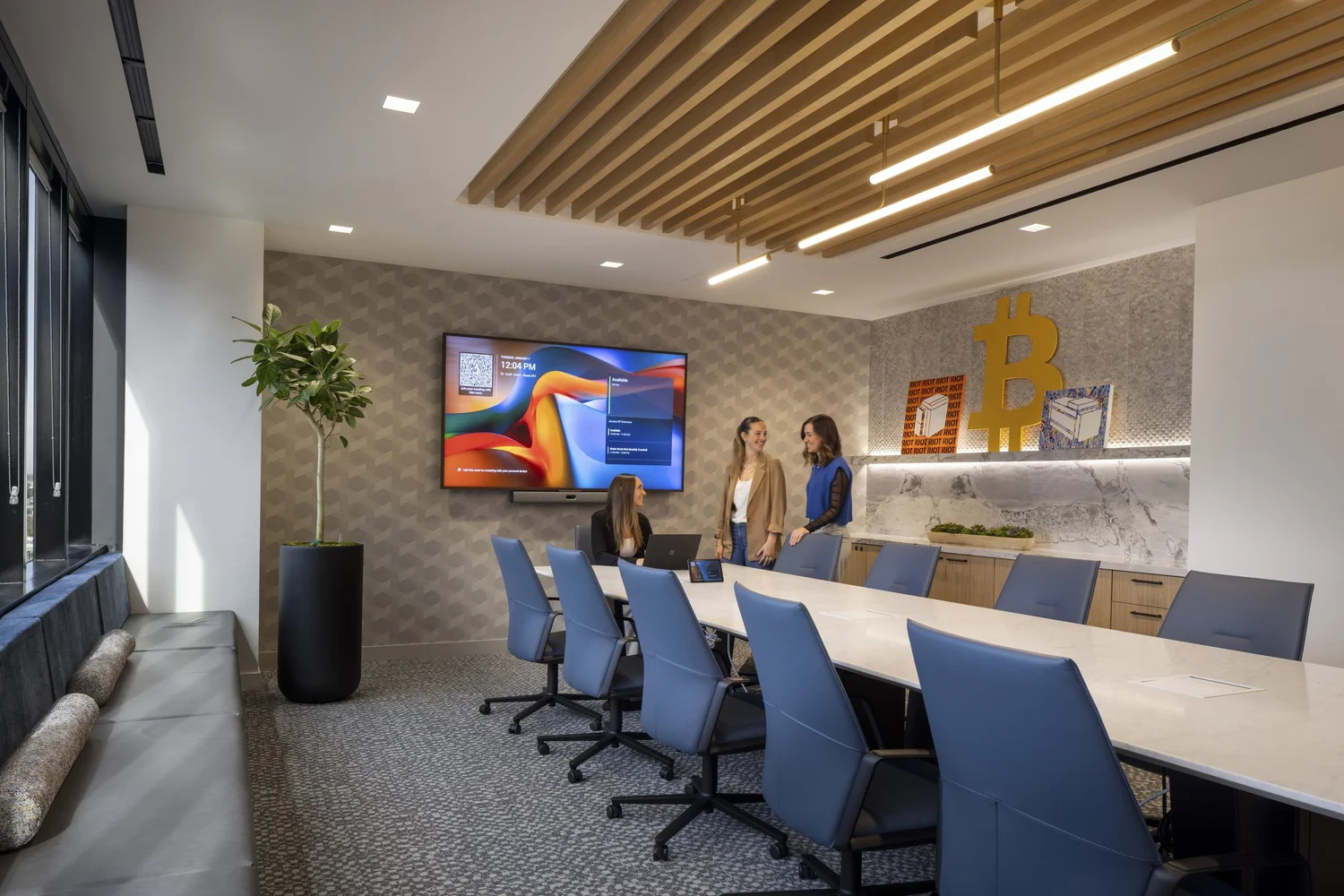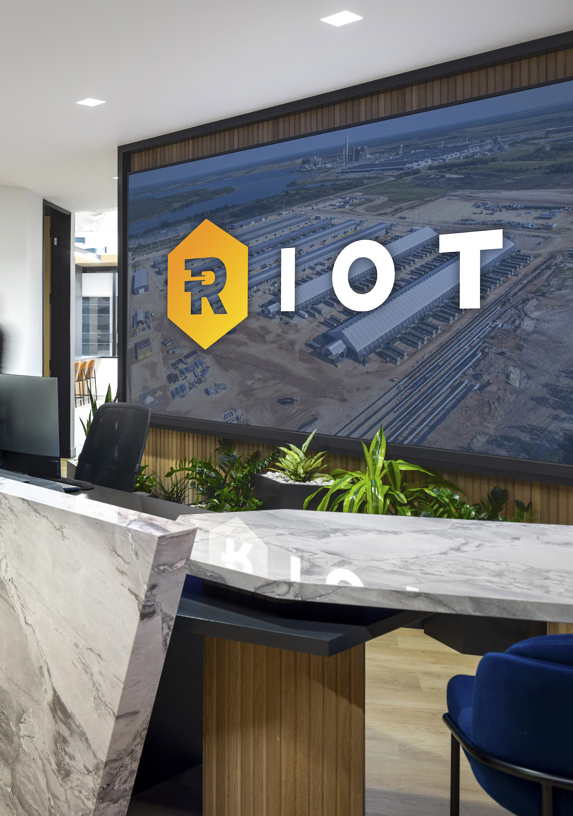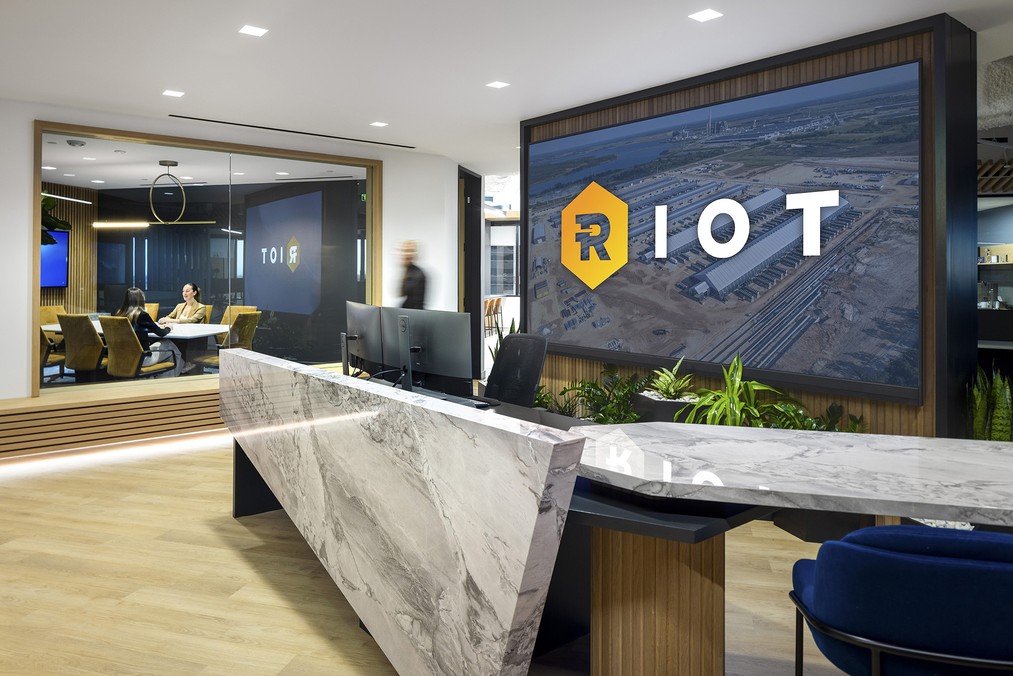 这处完全定制化的空间充满了企业元素:品牌色彩被精心融入设计,源自公司标志的六边形创意无处不在,随处可见的绿植与专为协作打造的开放区域相得益彰。Riot的核心诉求是打造一个能促进团队参与、强化协作并凝聚企业文化的宜人环境。办公室不仅是员工的聚集地,也是合作伙伴与投资者的交流枢纽——空间中特别定制了一张展示台,陈列着公司全球规模最大的核心数据中心3D模型。这个前瞻性的工作空间深度融合了协作、创新与发展的理念,生动诠释了Riot对未来的宏伟愿景。