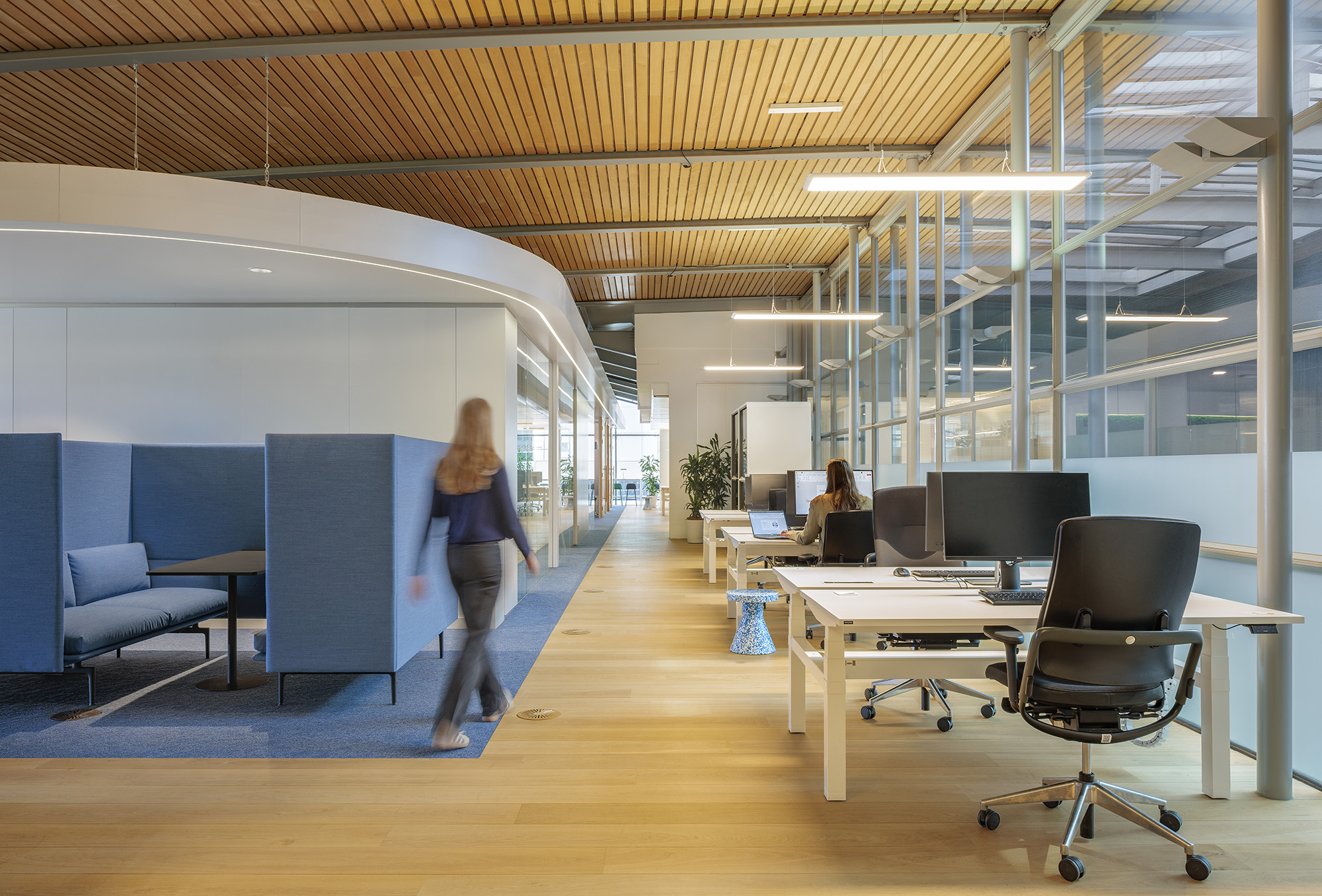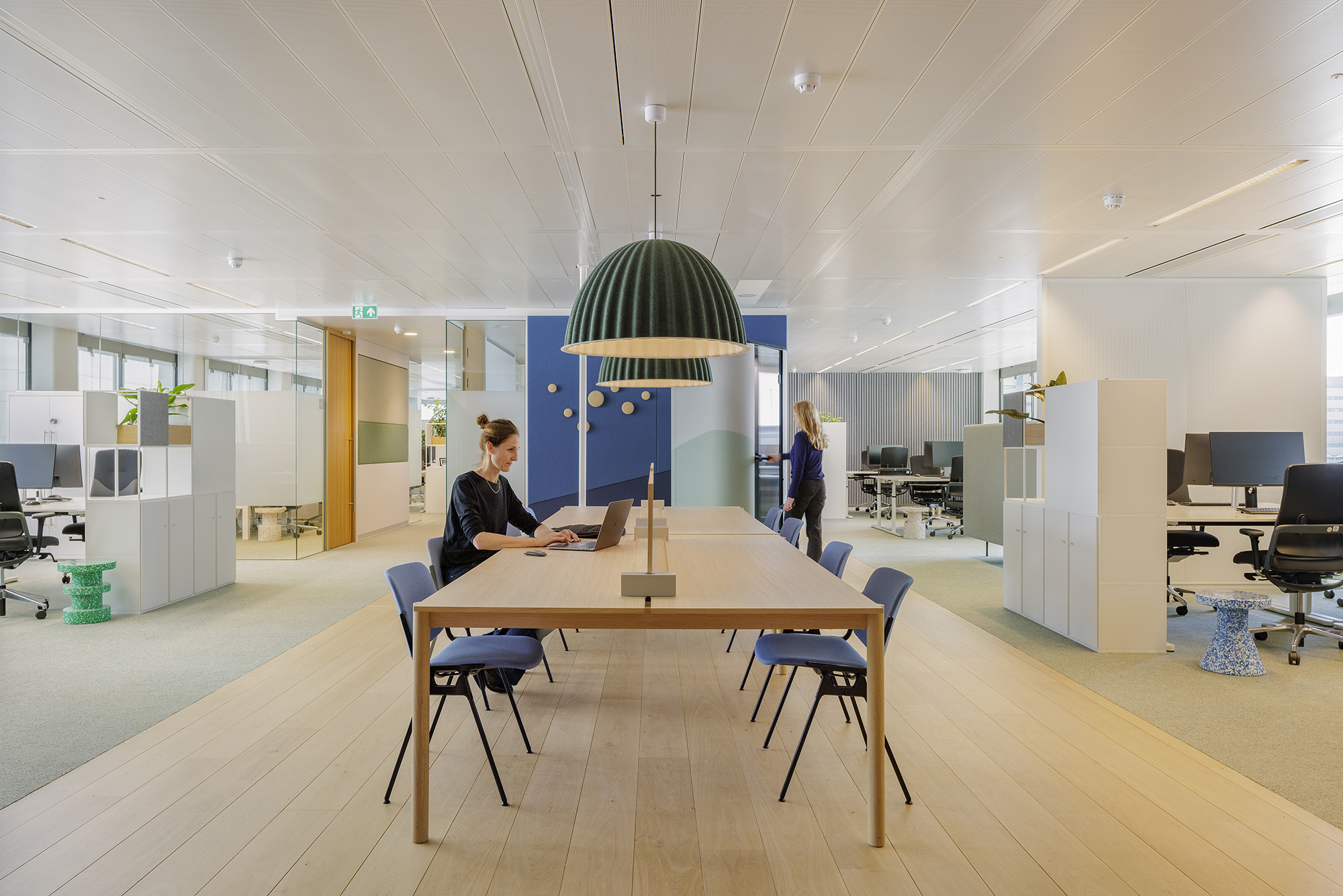 基于这一任务要求,设计团队开发了一套混合办公空间概念,并将其应用于分布两个楼层、总面积达1,700平方米的办公空间中。
