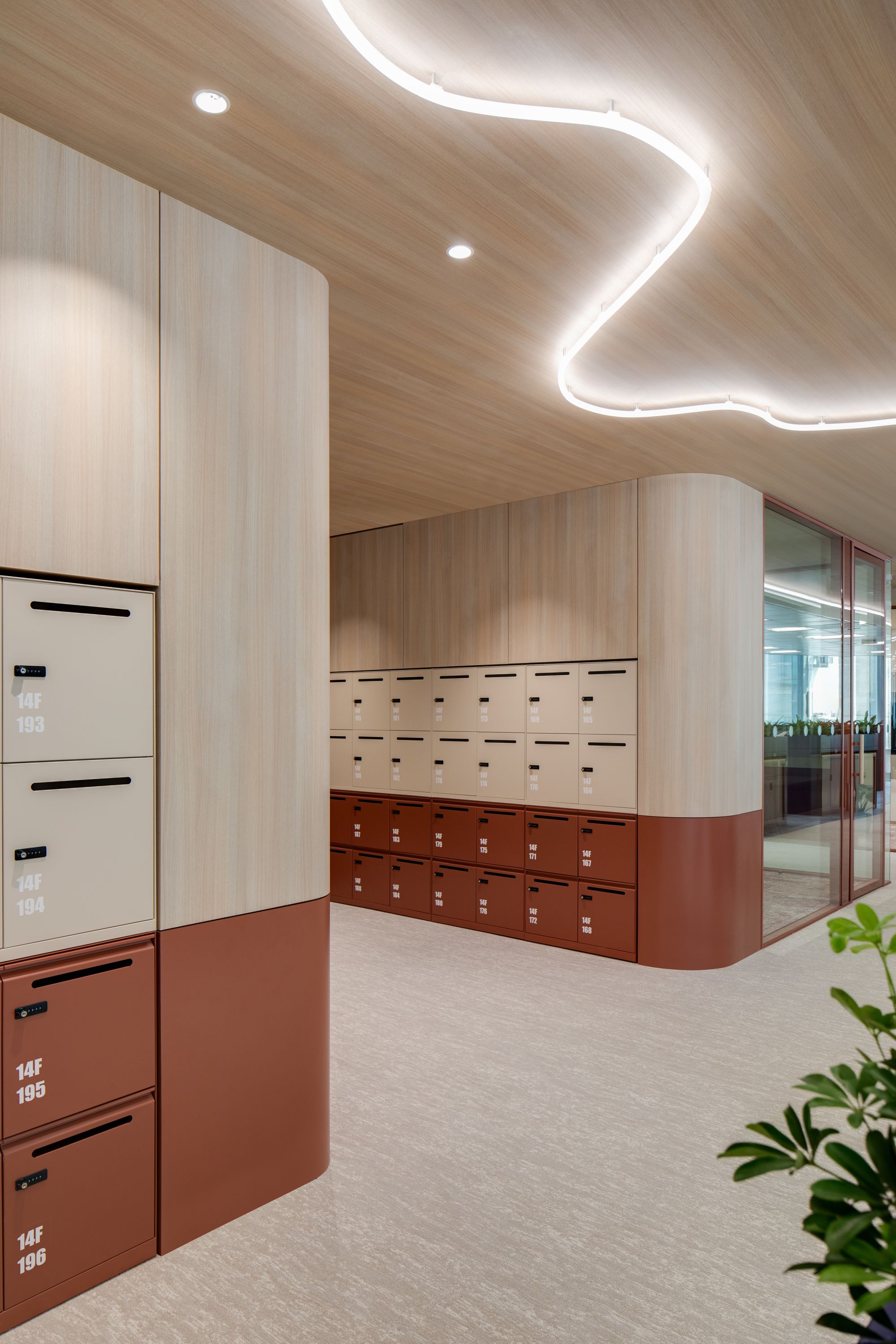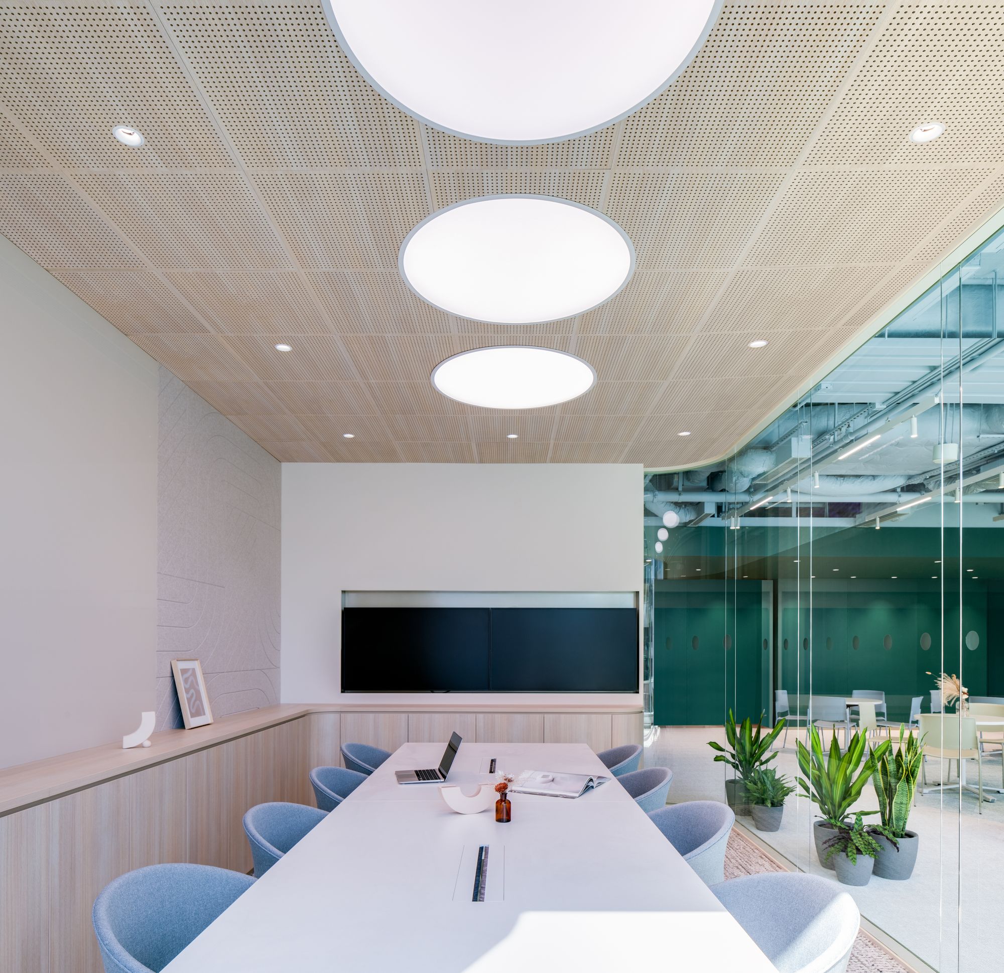 在更开阔的办公区域,设计采用了沉浸式策略,其亮点在于定制灯光与木质饰面天花板的结合,有效引导着空间动线。工作区周边配有一系列精心布局的配套设施,整个环境都置于同一个美学背景之下,既凝聚团队力量,又实现了流畅的视觉延伸与功能衔接。