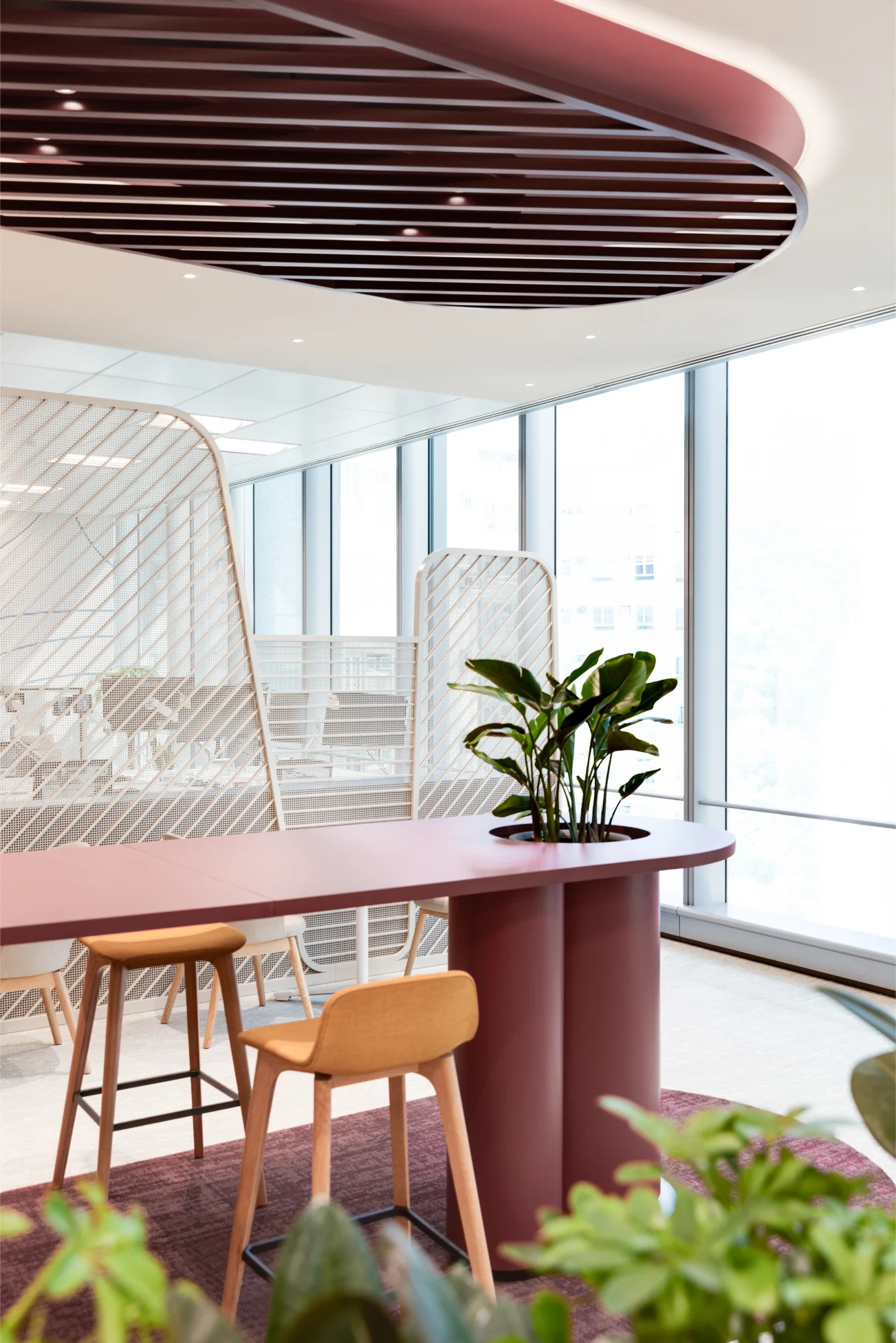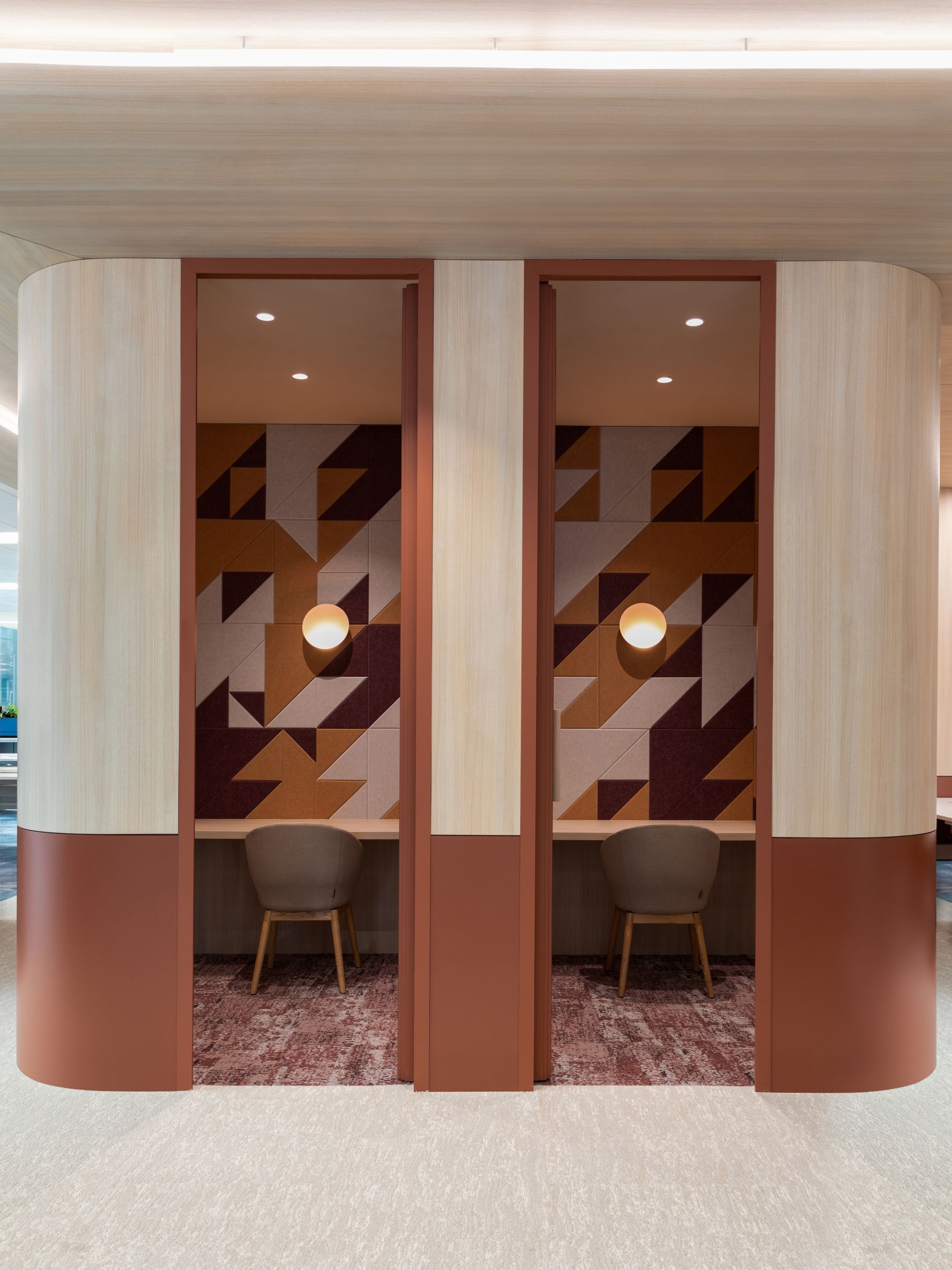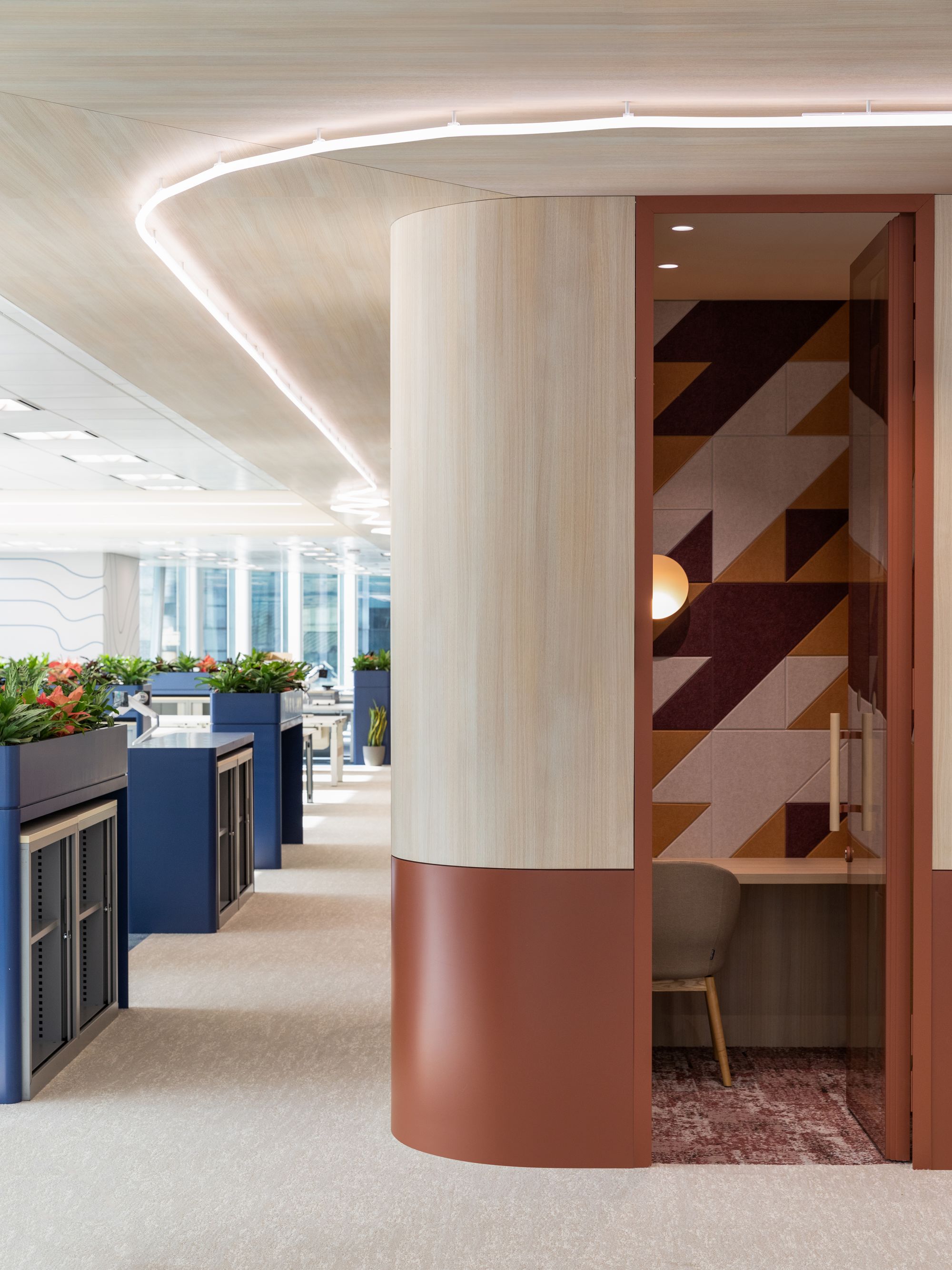材料与色调的精心搭配旨在营造明亮且充满活力的氛围。该金融机构的标志性红色被重新诠释,并与多样元素上的丰富色彩谱系相辅相成,共同打造出一个突破传统企业思维、激发创新的环境。可持续理念贯穿设计始终,采用升级改造的家具和生物基墙面饰面等特色,在减少环境影响的同时提升了空间健康与舒适度。